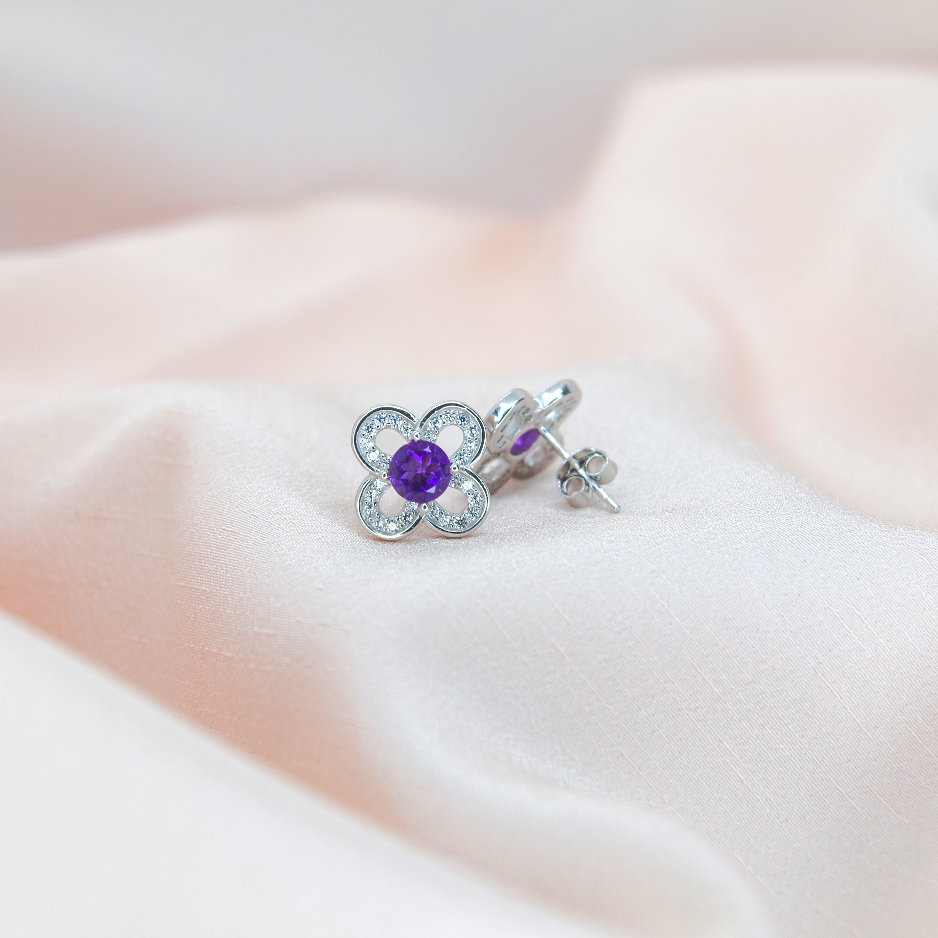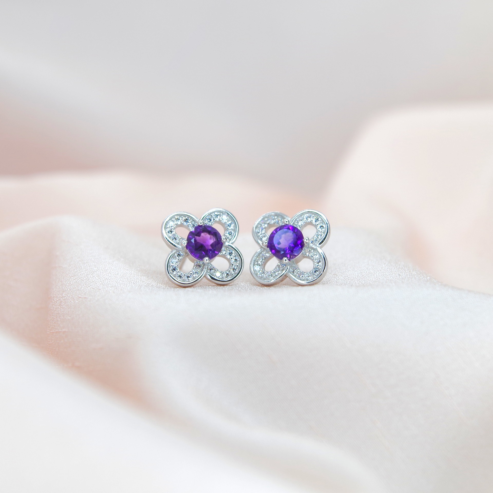 Zářivé stříbrné náušnice s přírodním ametystem, ve tvaru květu, pozlacené 14k bílým zlatem.