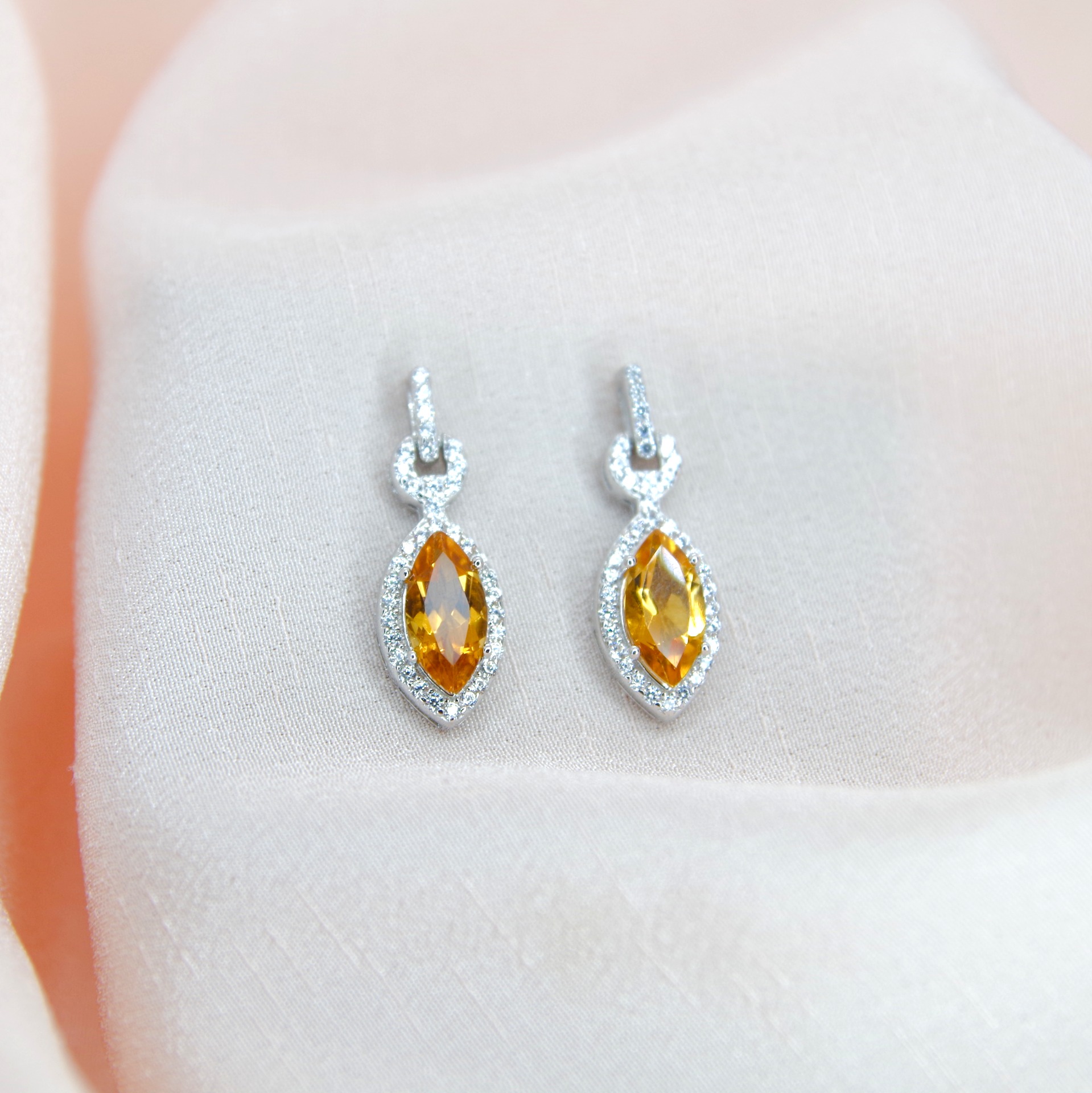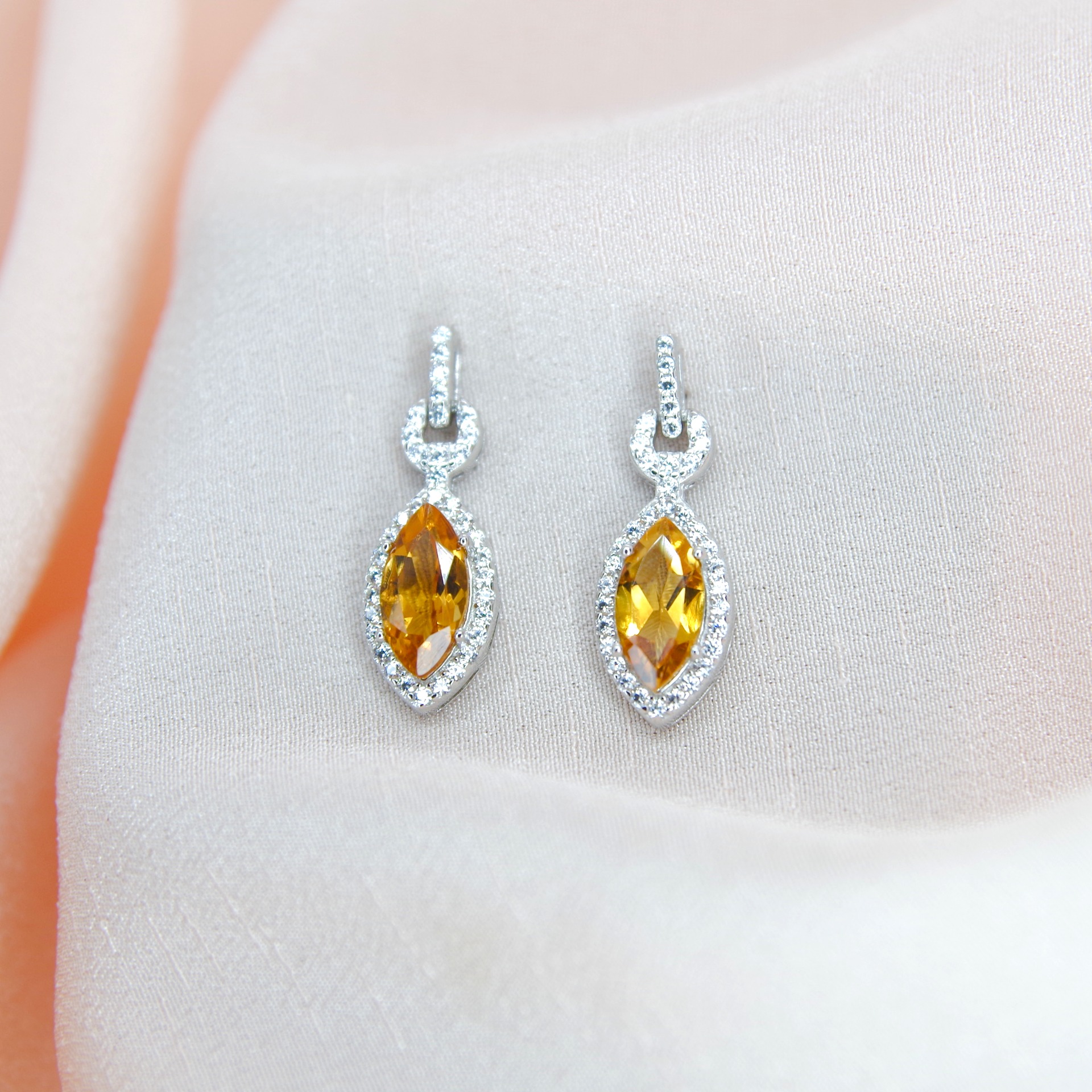 Elegantní stříbrné náušnice s přírodními citríny a zirkony, pozlacené 14k bílým zlatem.
