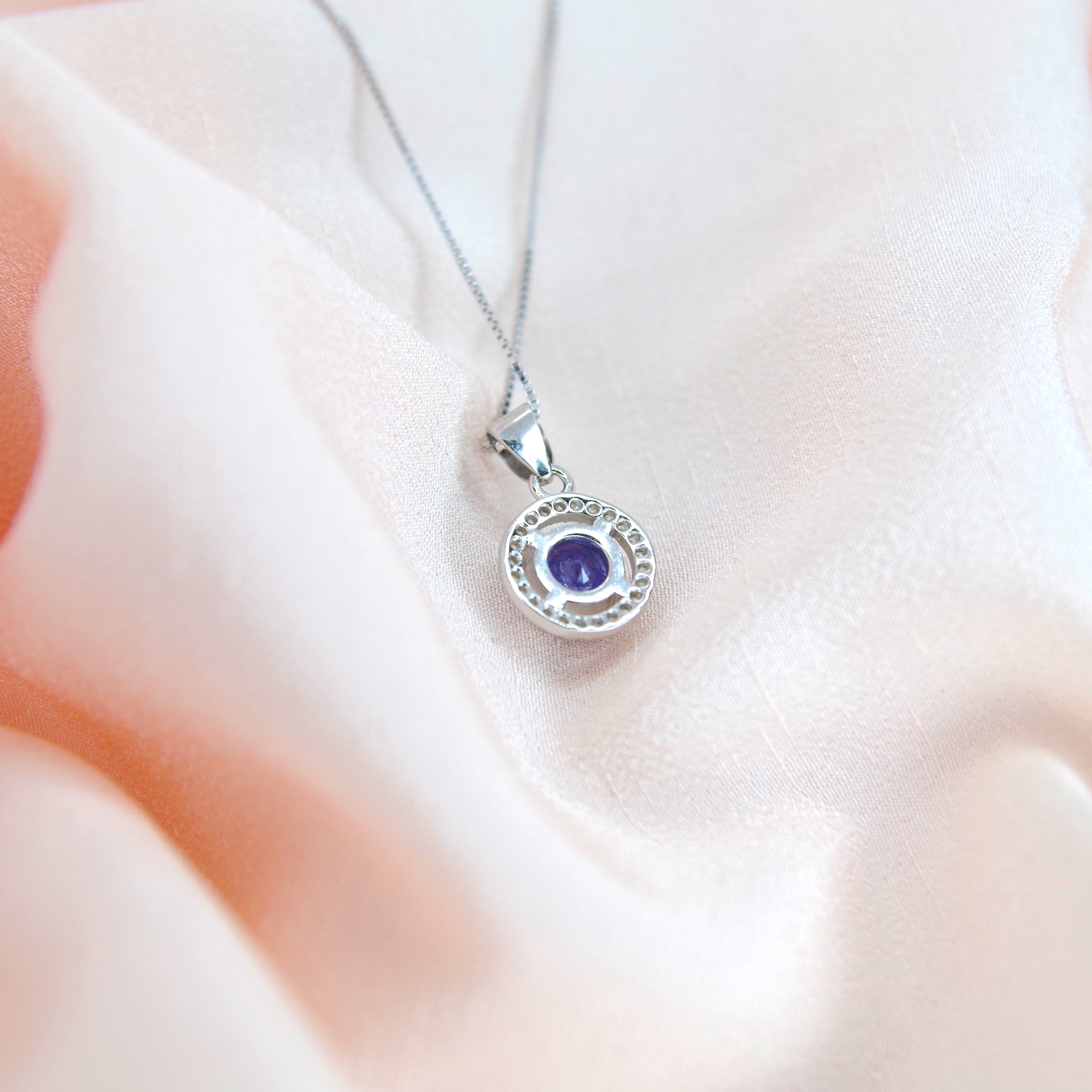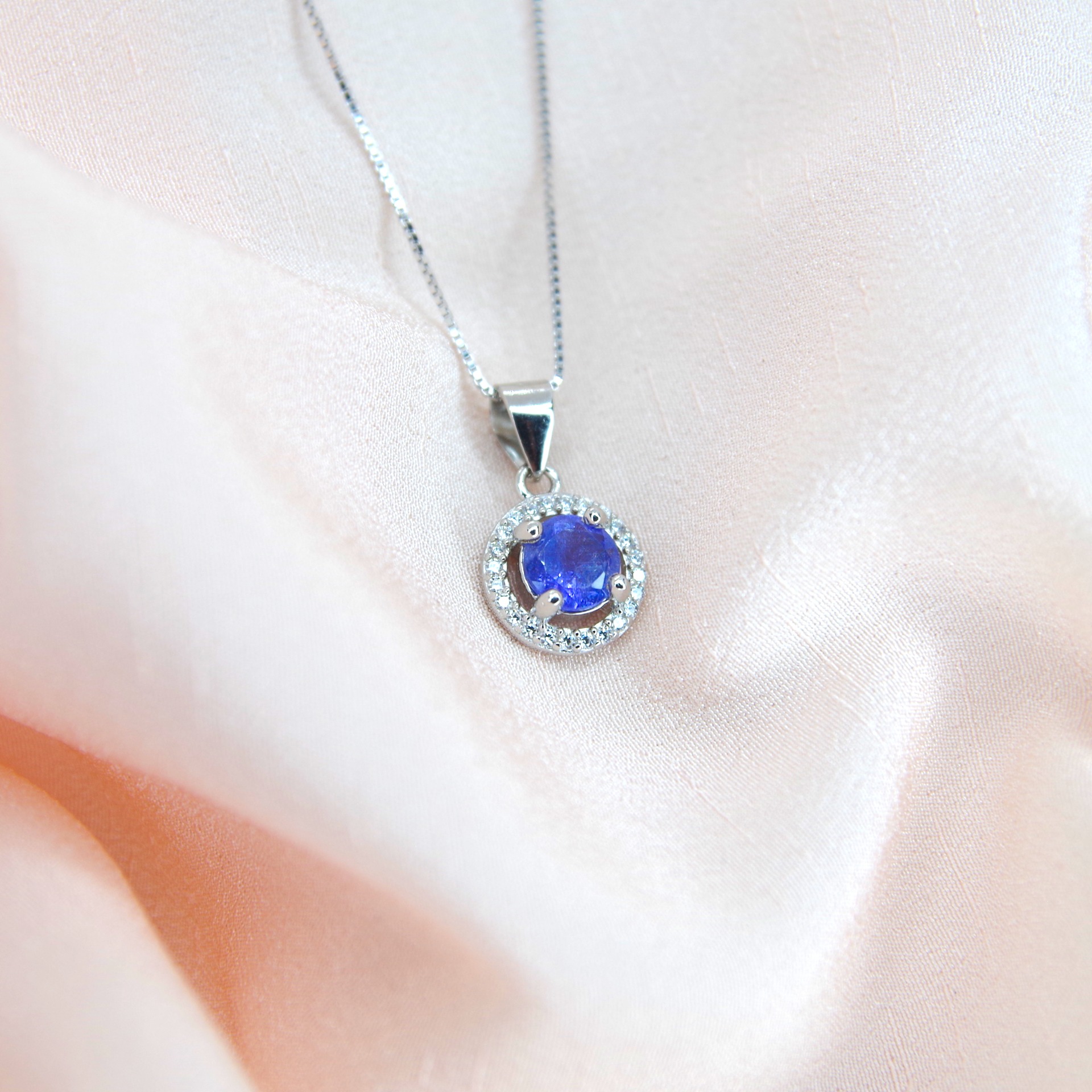 Elegantní stříbrný přívěsek s přírodním tanzanitem a zirkony. Pozlacený 14k bílým zlatem.