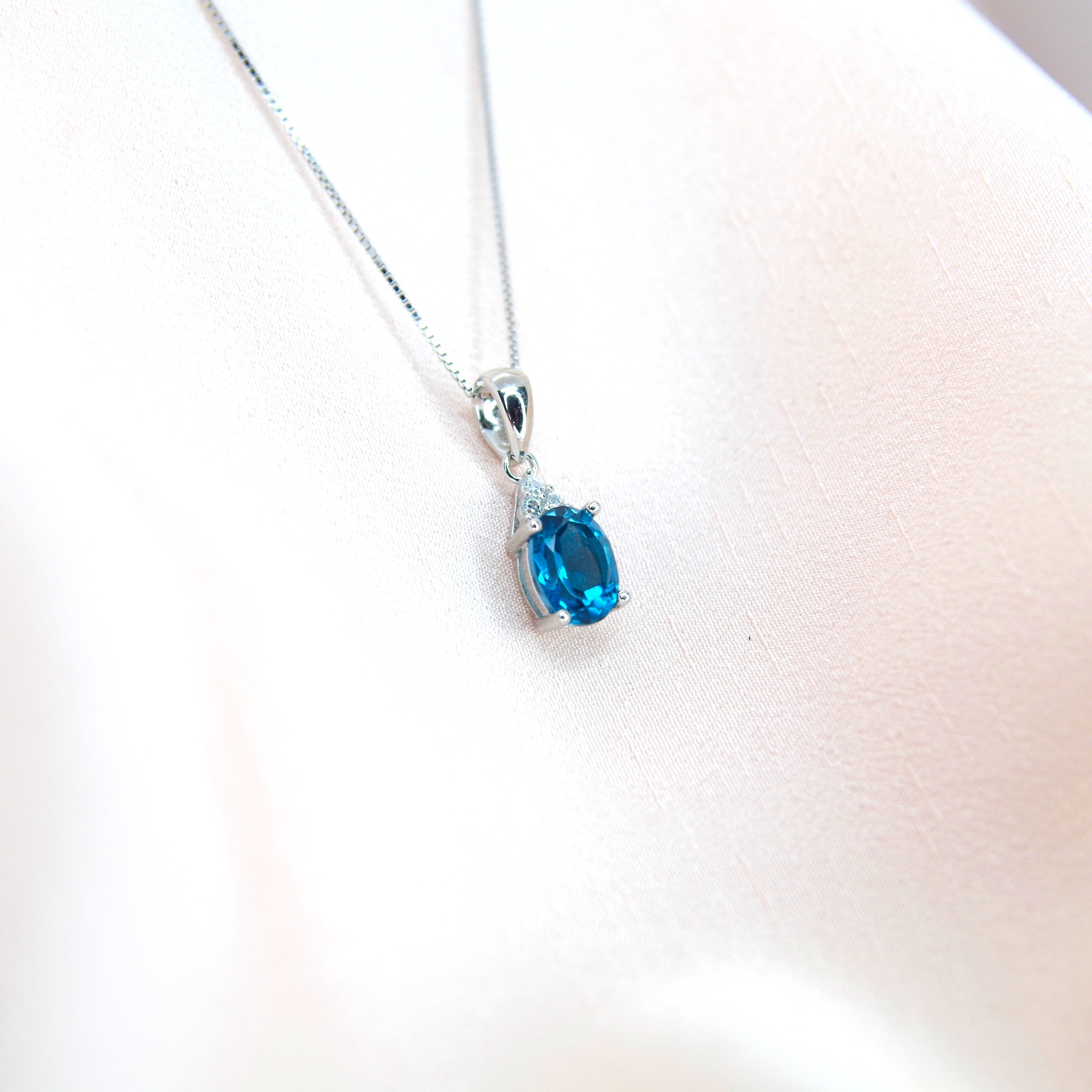Elegantní stříbrný přívěsek s přírodním modrým topazem a zirkony. Pozlacený 14k bílým zlatem.