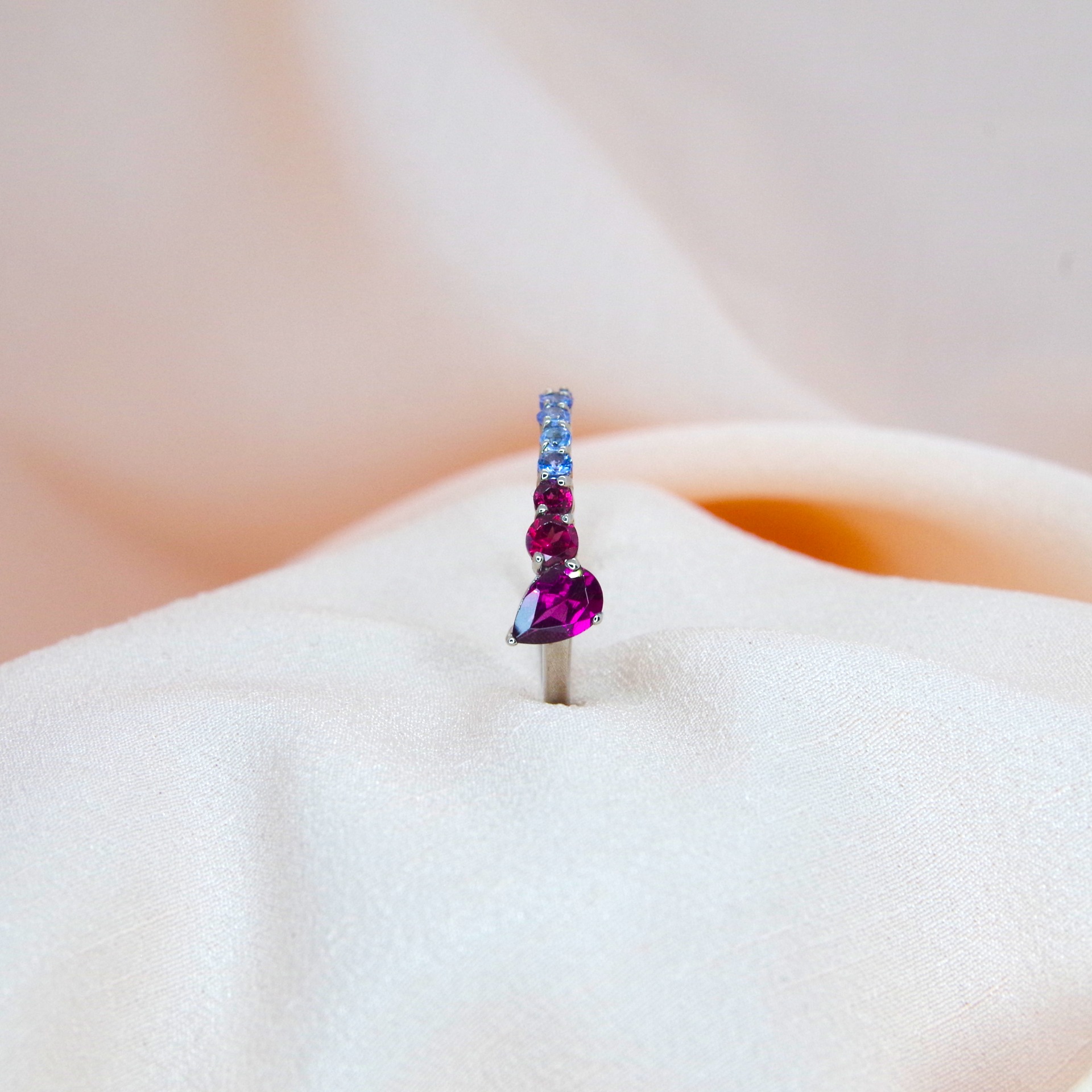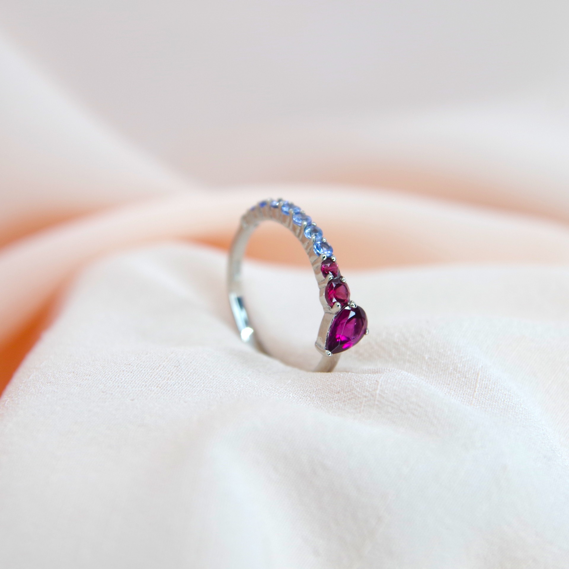 Elegantní stříbrný prsten s přírodními granáty, pozlacený 14k bílým zlatem.
