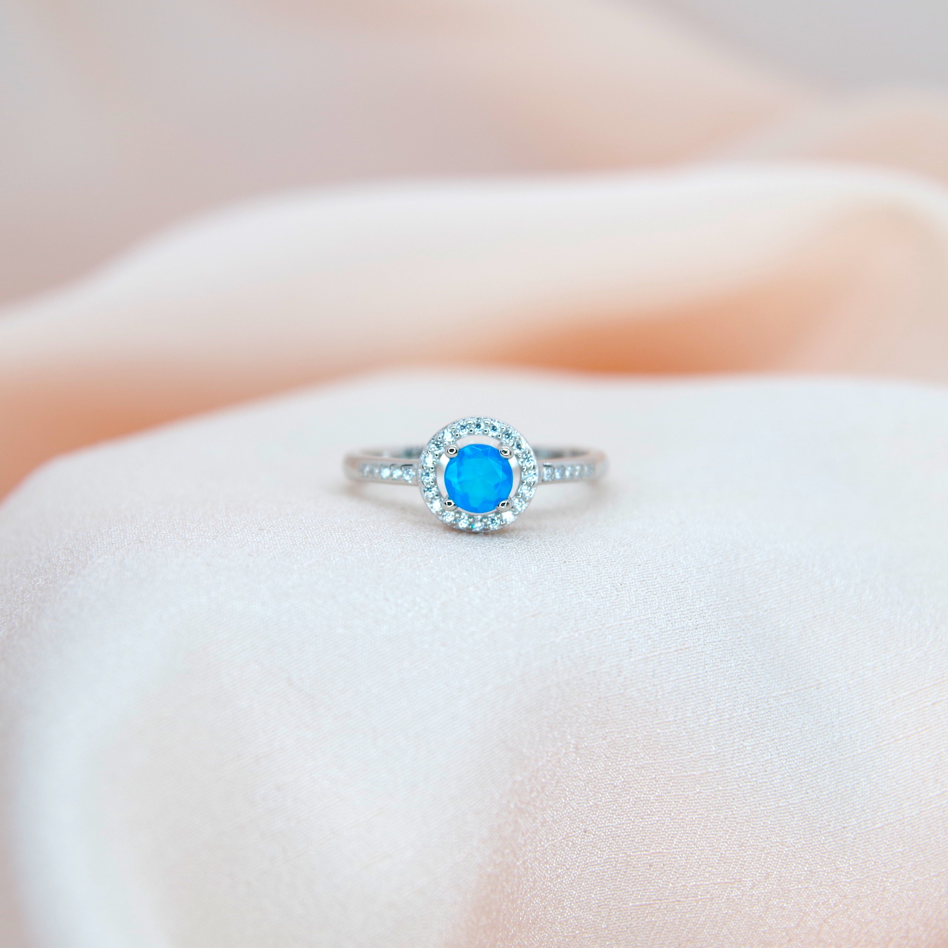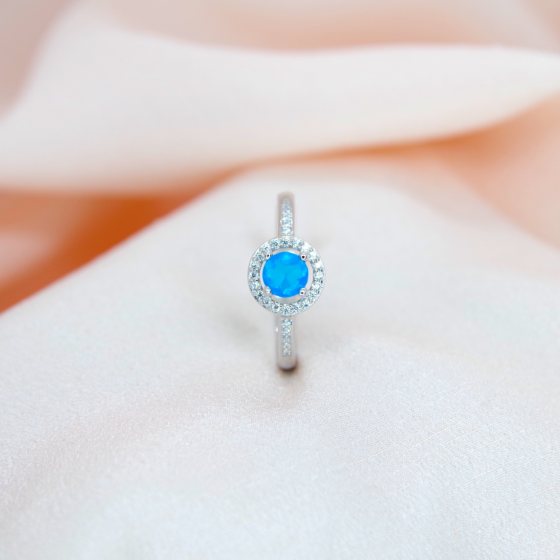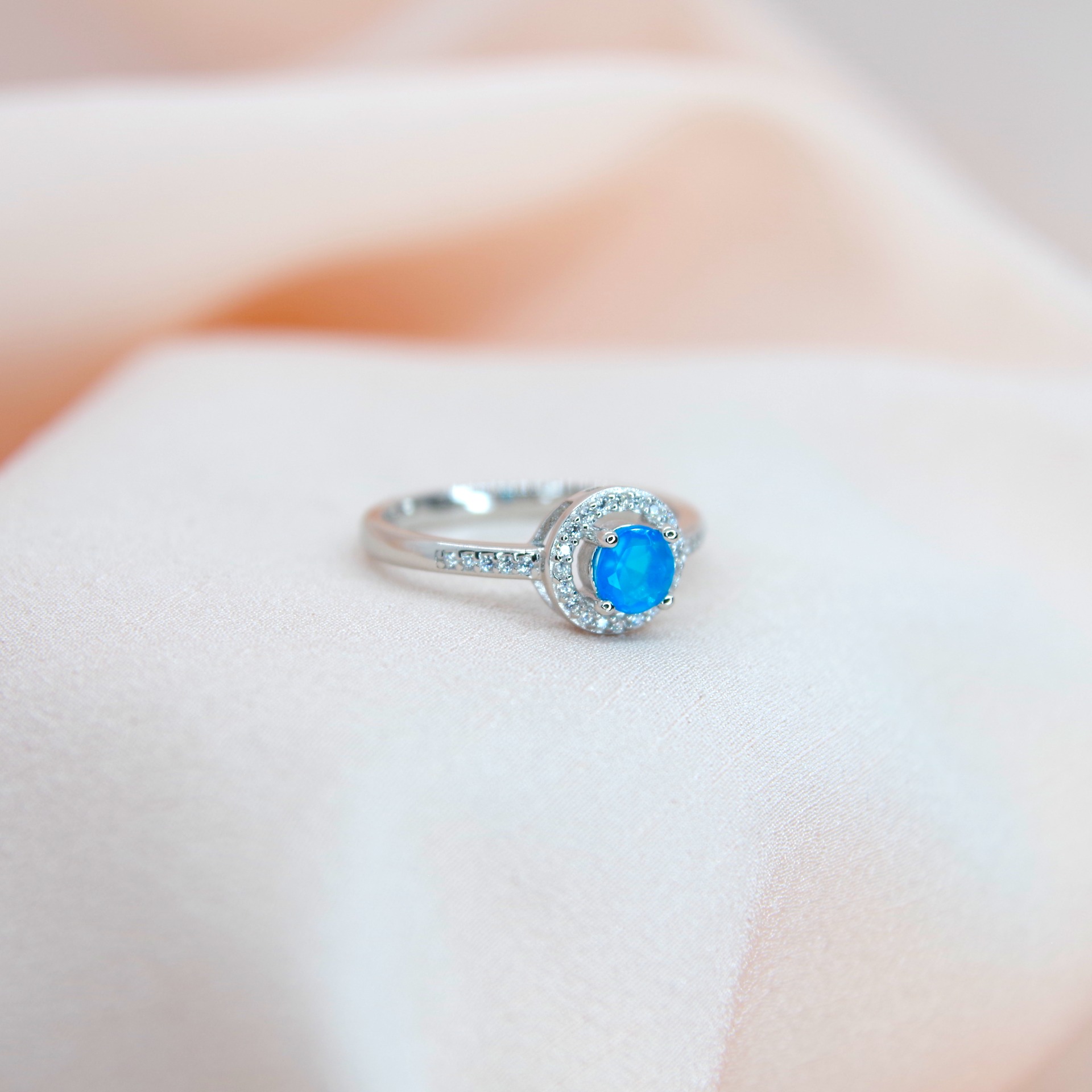 Jemný stříbrný prsten s přírodním modrým opálem, pozlacený 14k bílým zlatem.