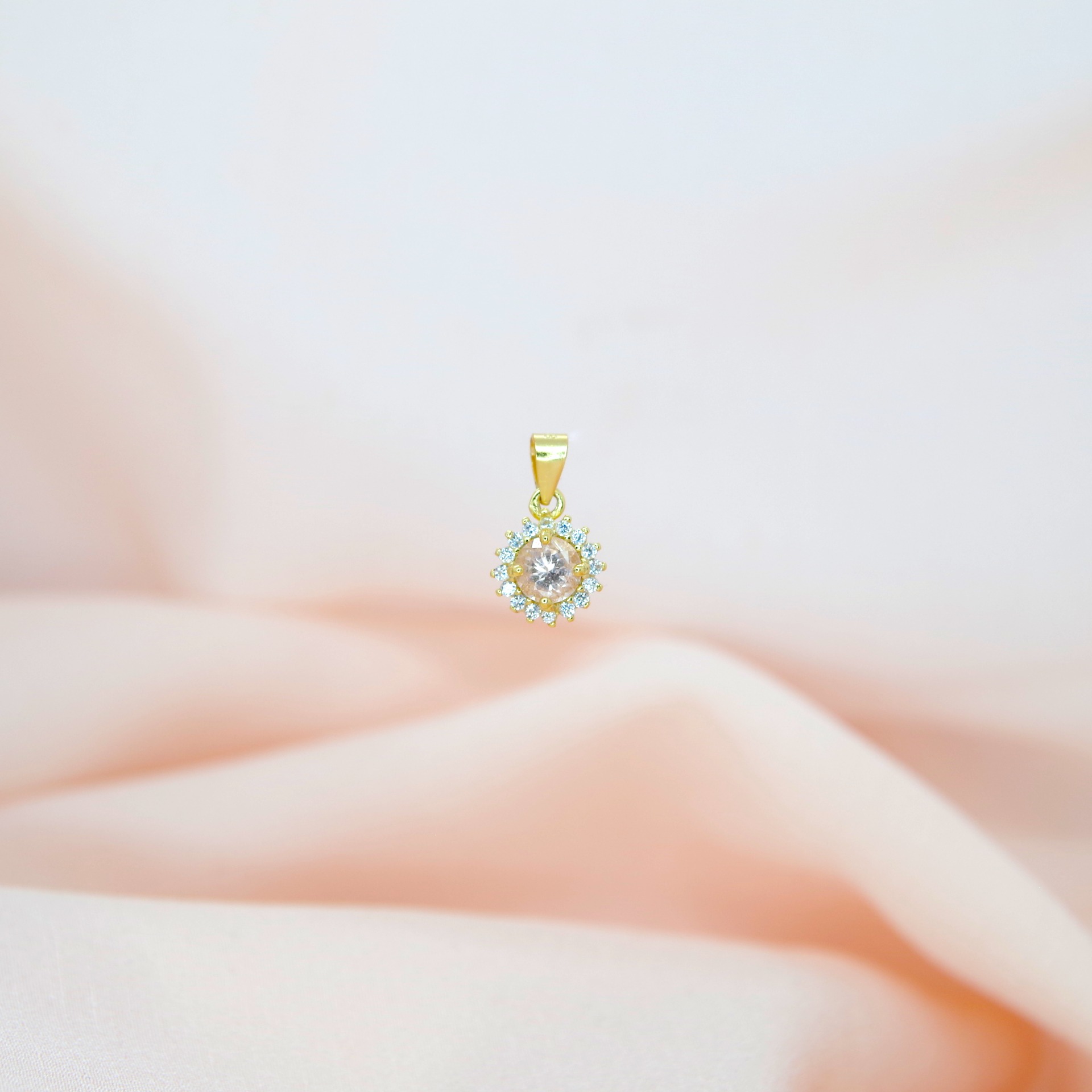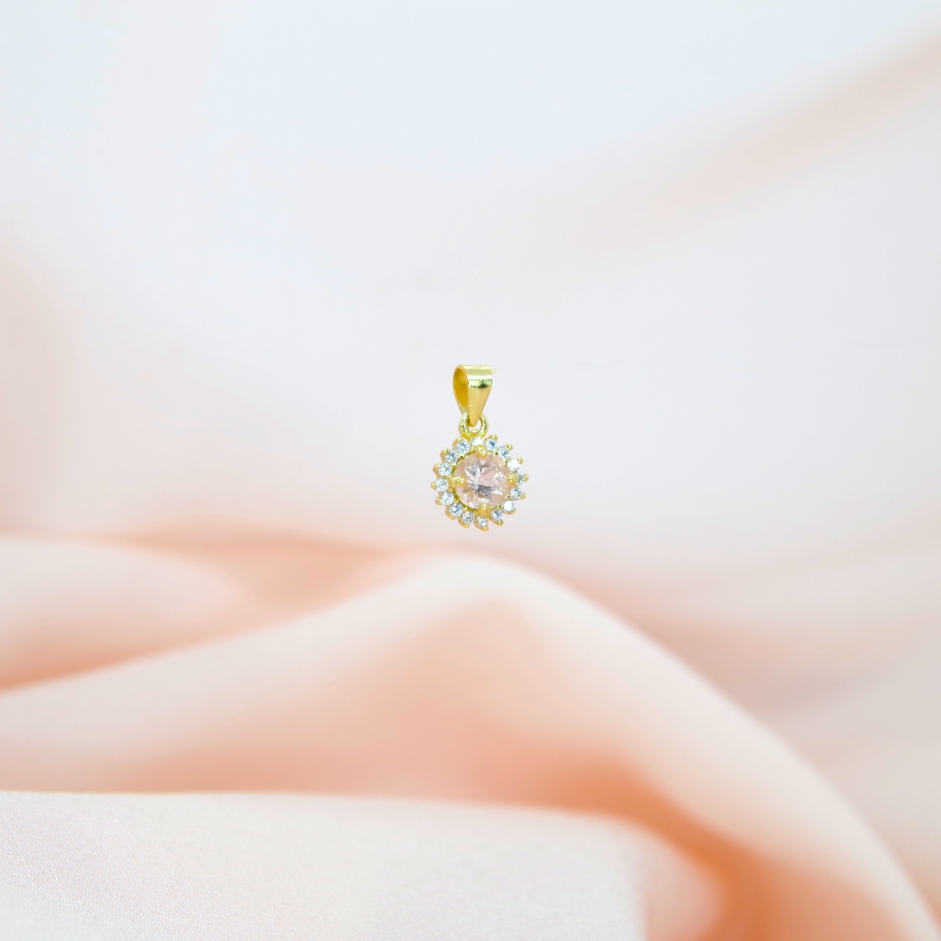 Jemný stříbrný přívěsek s přírodním morganitem a zirkony. Pozlacený 14k zlatem.