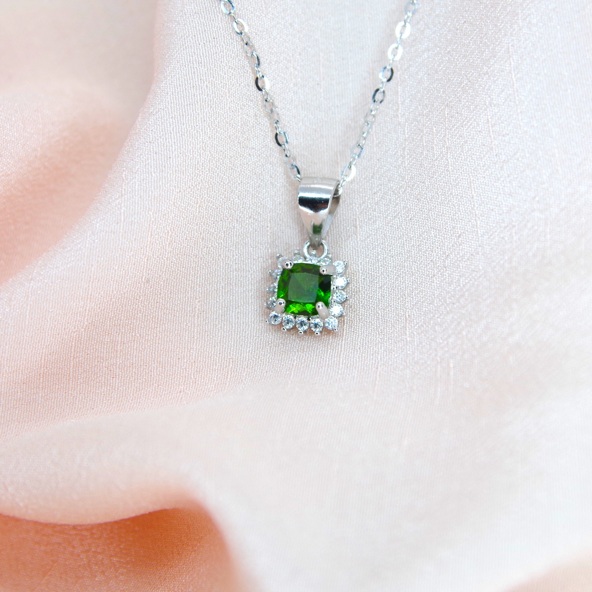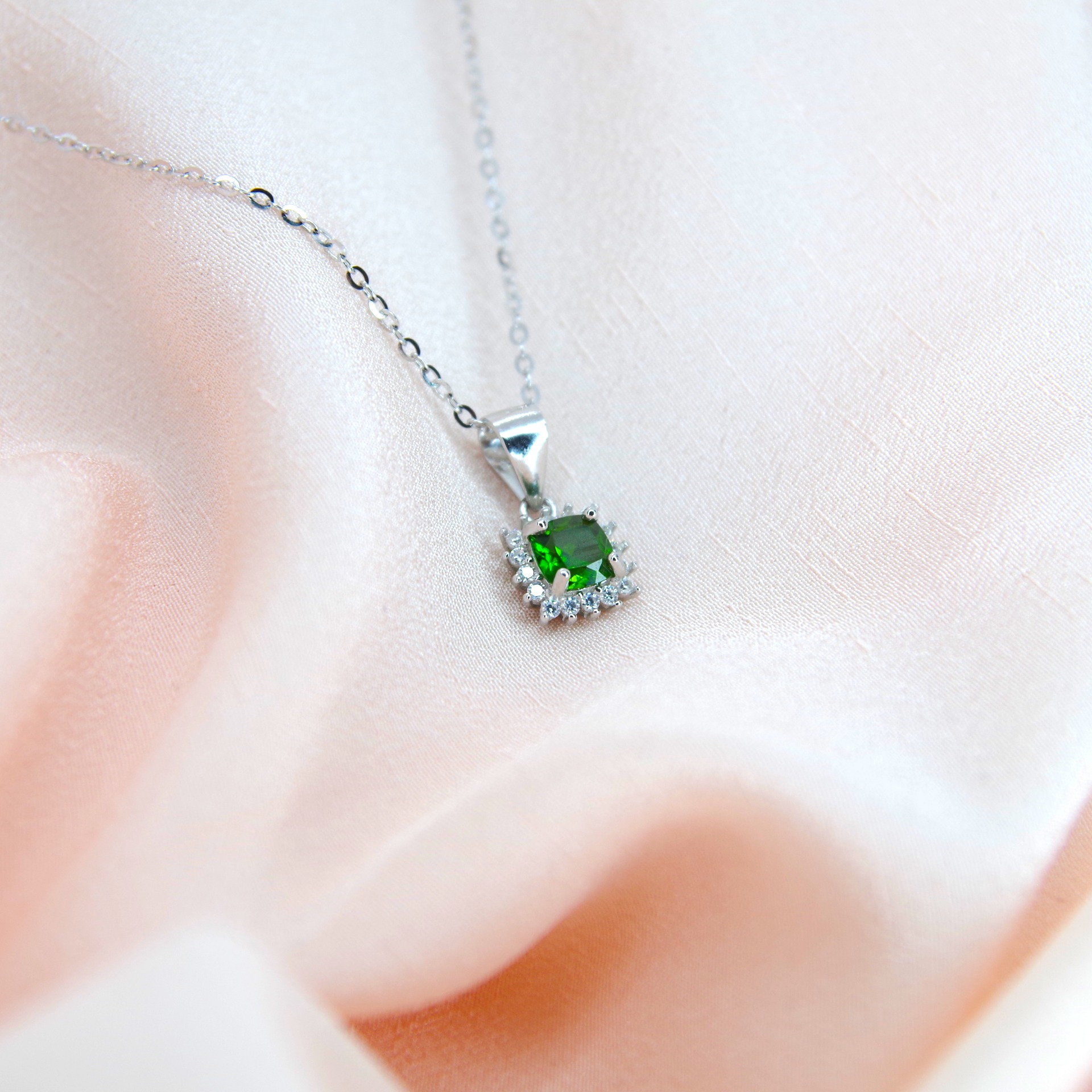 Jemný stříbrný přívěsek s přírodním chrom diopsidem, doplněn o zirkony. Pozlacený 14k bílým zlatem.