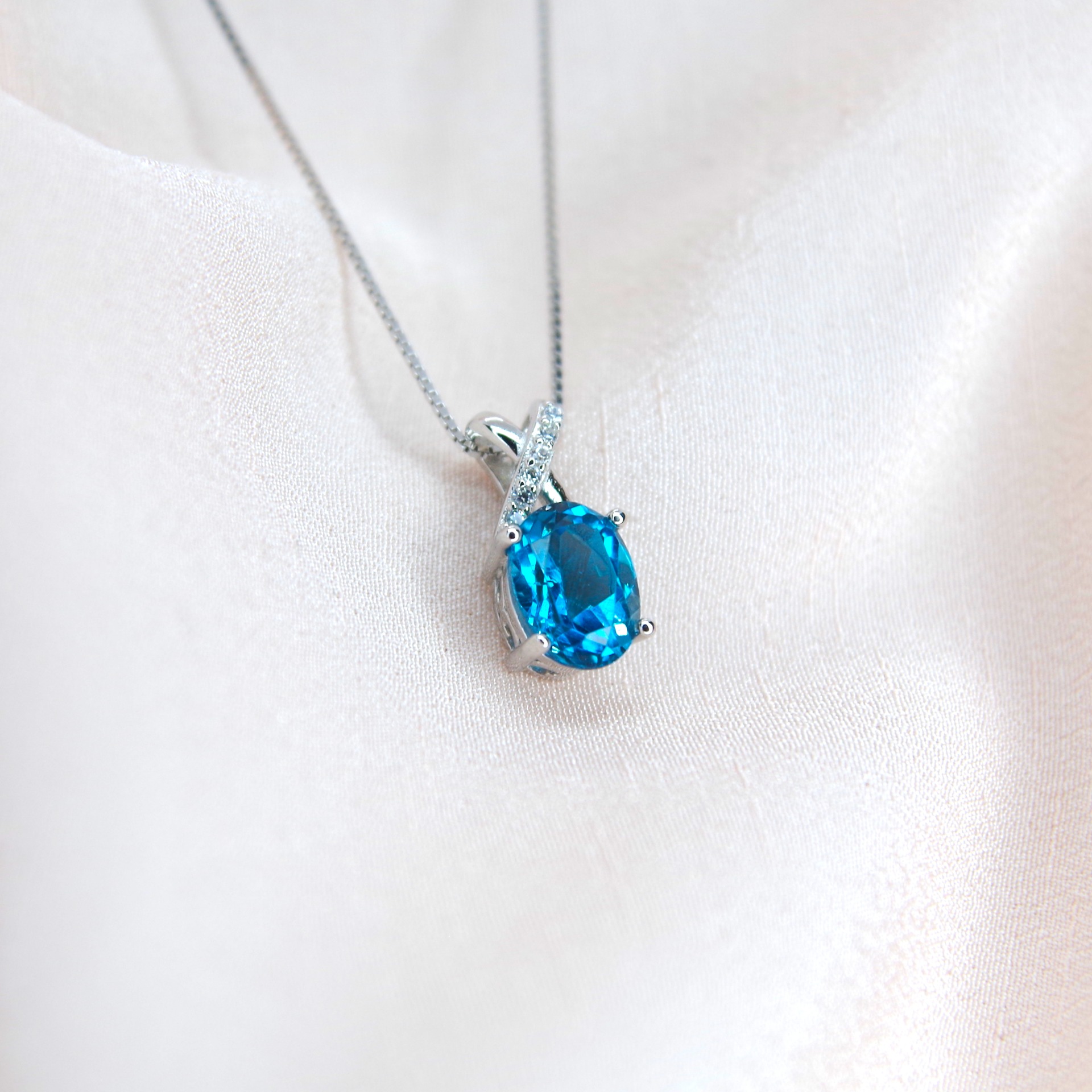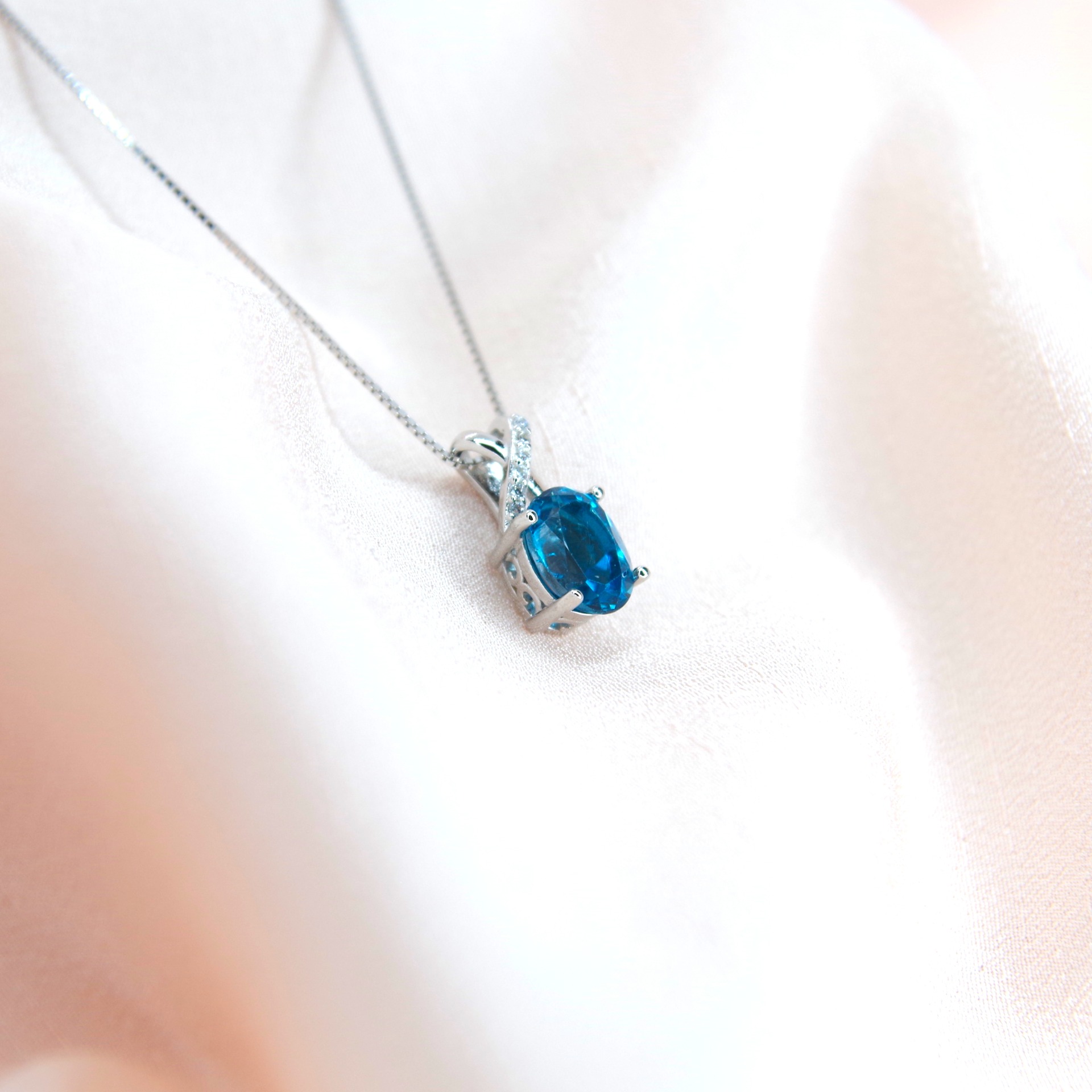 Jemný stříbrný přívěsek s přírodním modrým topazem a zirkony. Pozlacený 14k bílým zlatem.