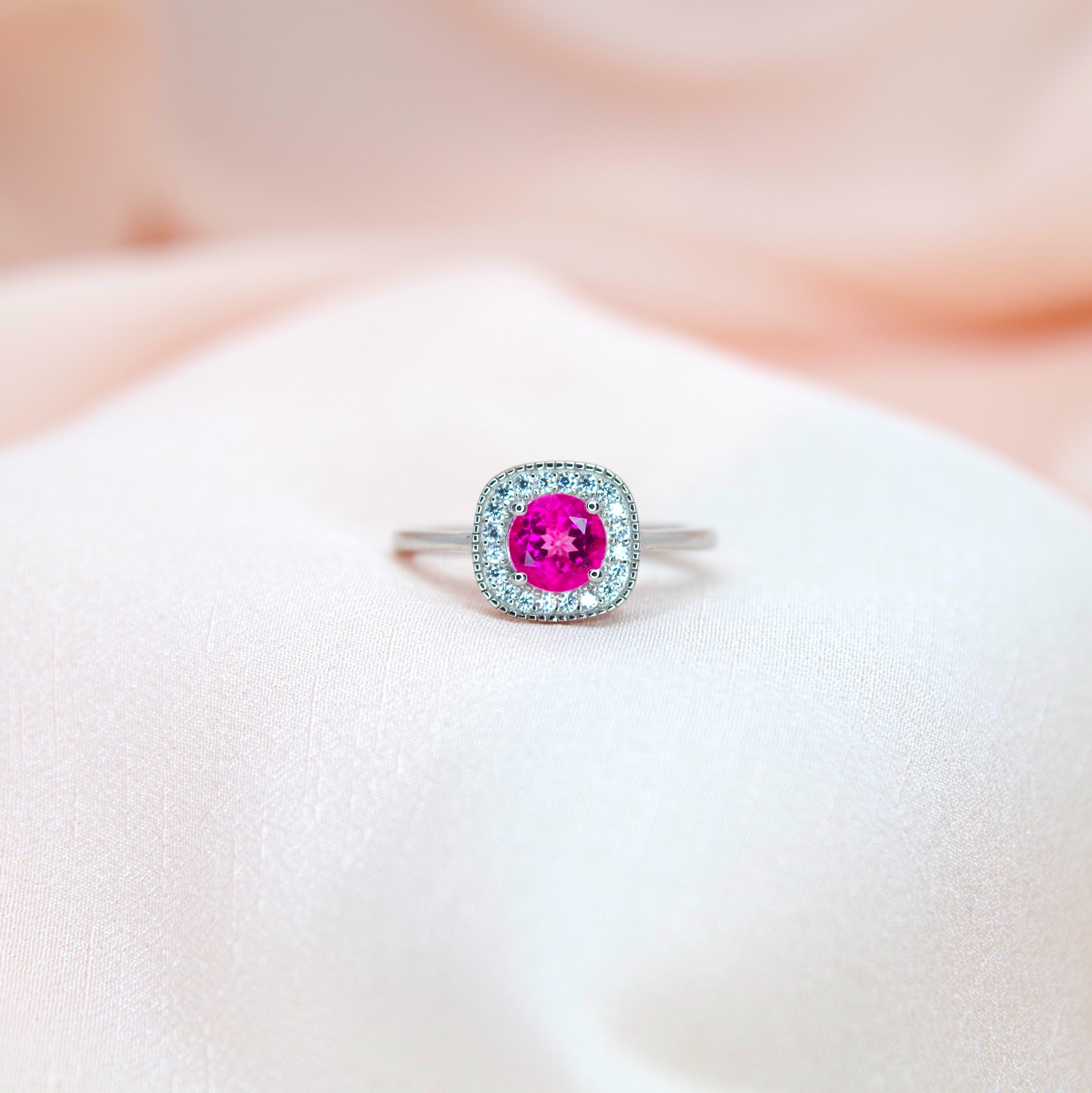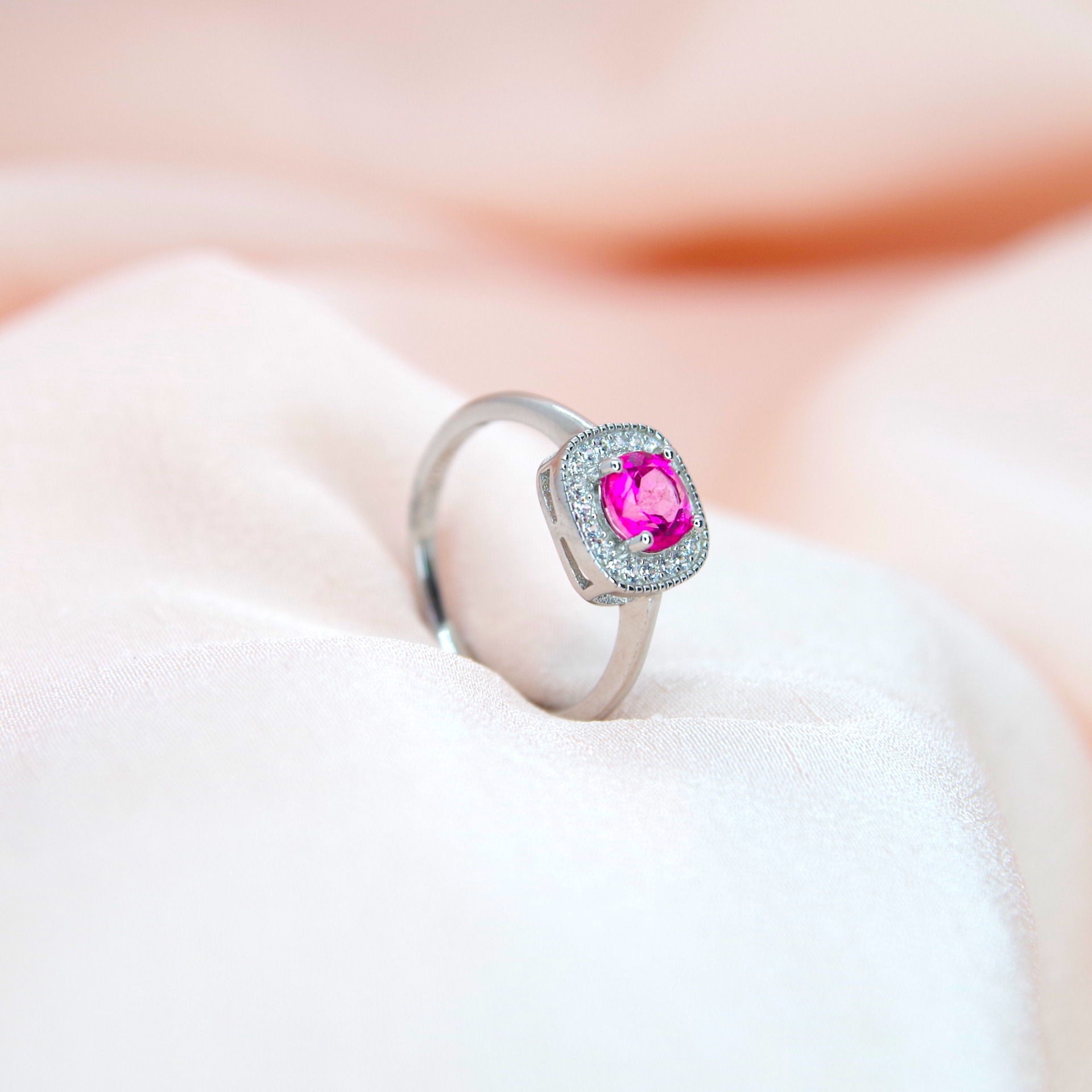 Jemný stříbrný prsten s přírodním růžovým topazem, pozlacený 14k bílým zlatem.