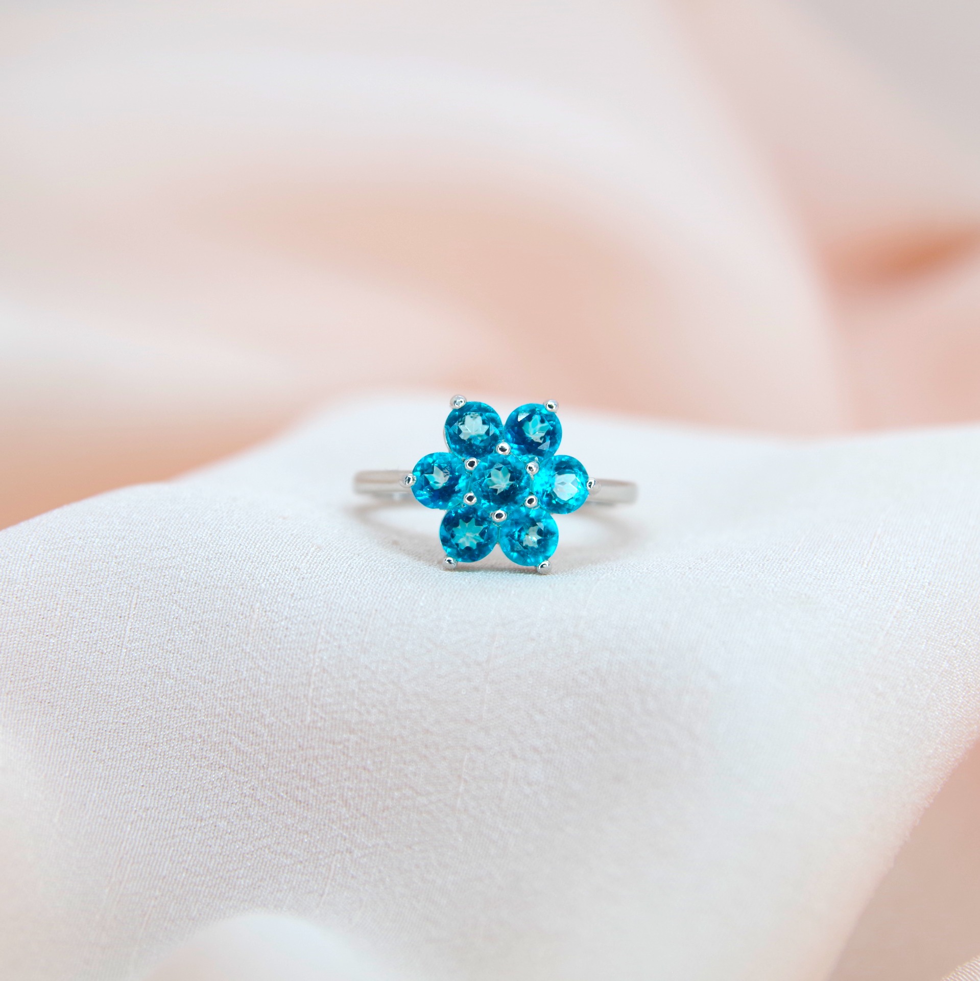 Jemný stříbrný prsten s přírodním modrým topazem ve tvaru květu, pozlacený 14k bílým zlatem.