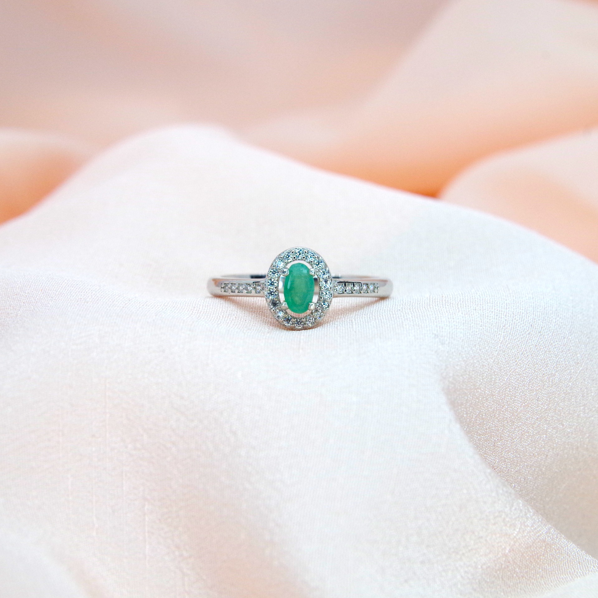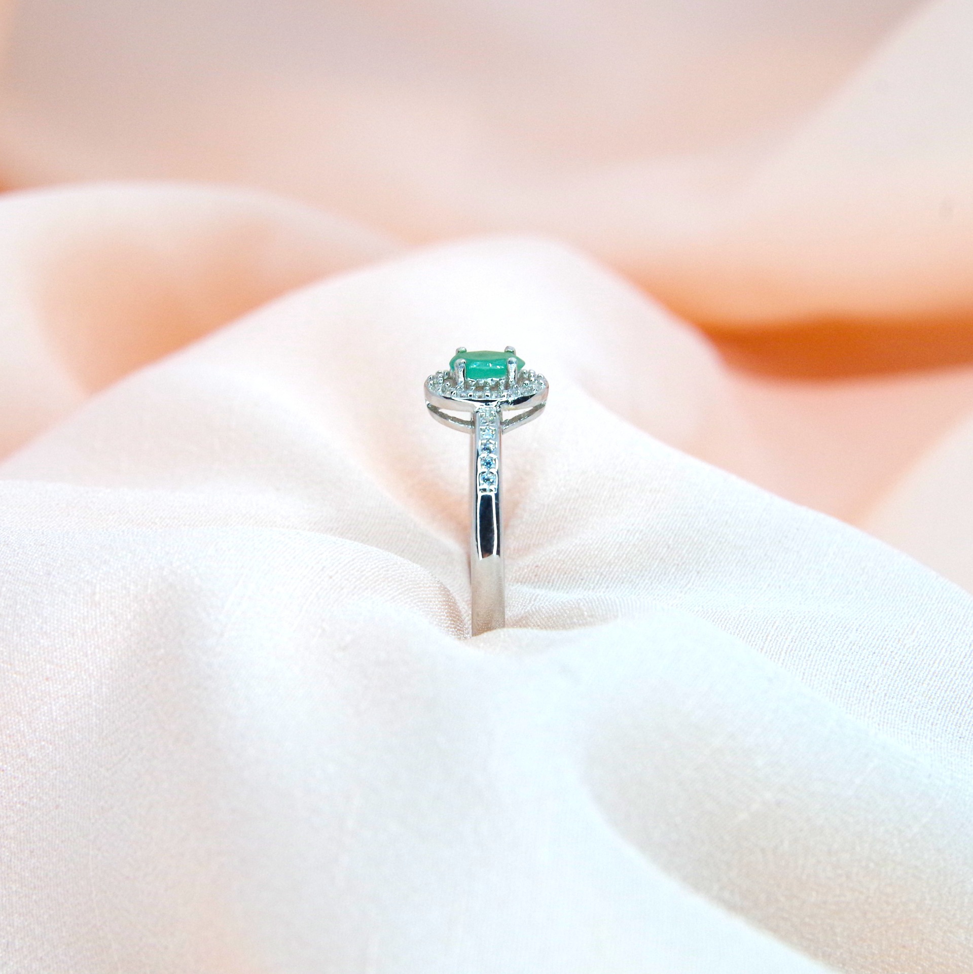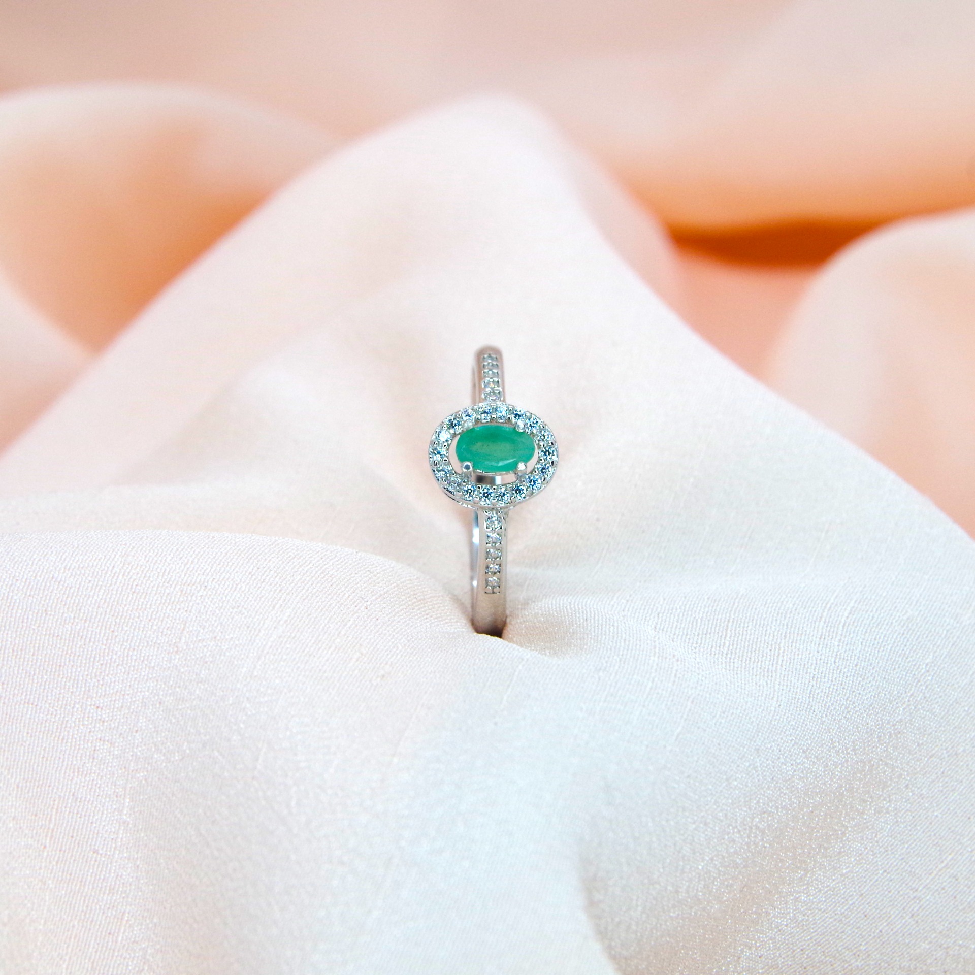 Jemný stříbrný prsten s přírodním smaragdem (emeraldem) a zirkony, pozlacený 14k bílým zlatem.