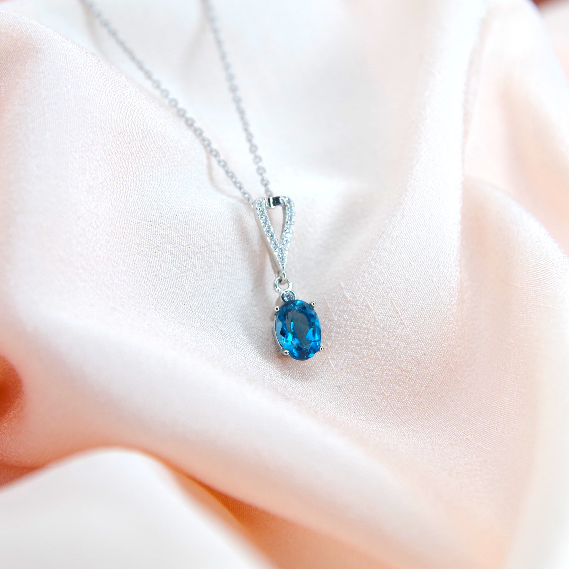 Krásný stříbrný přívěsek s přírodním modrým topazem a zirkony. Pozlacený 14k bílým zlatem.