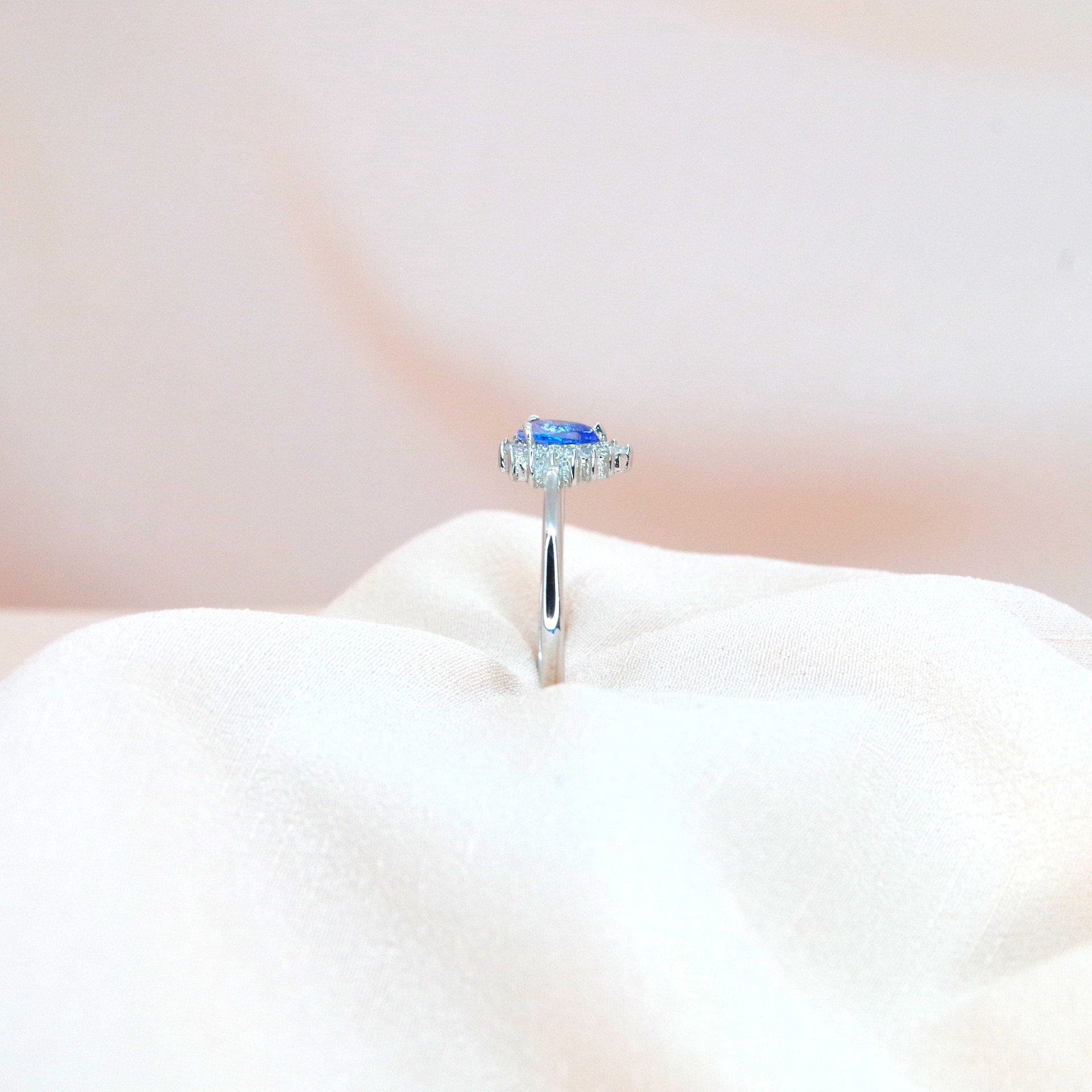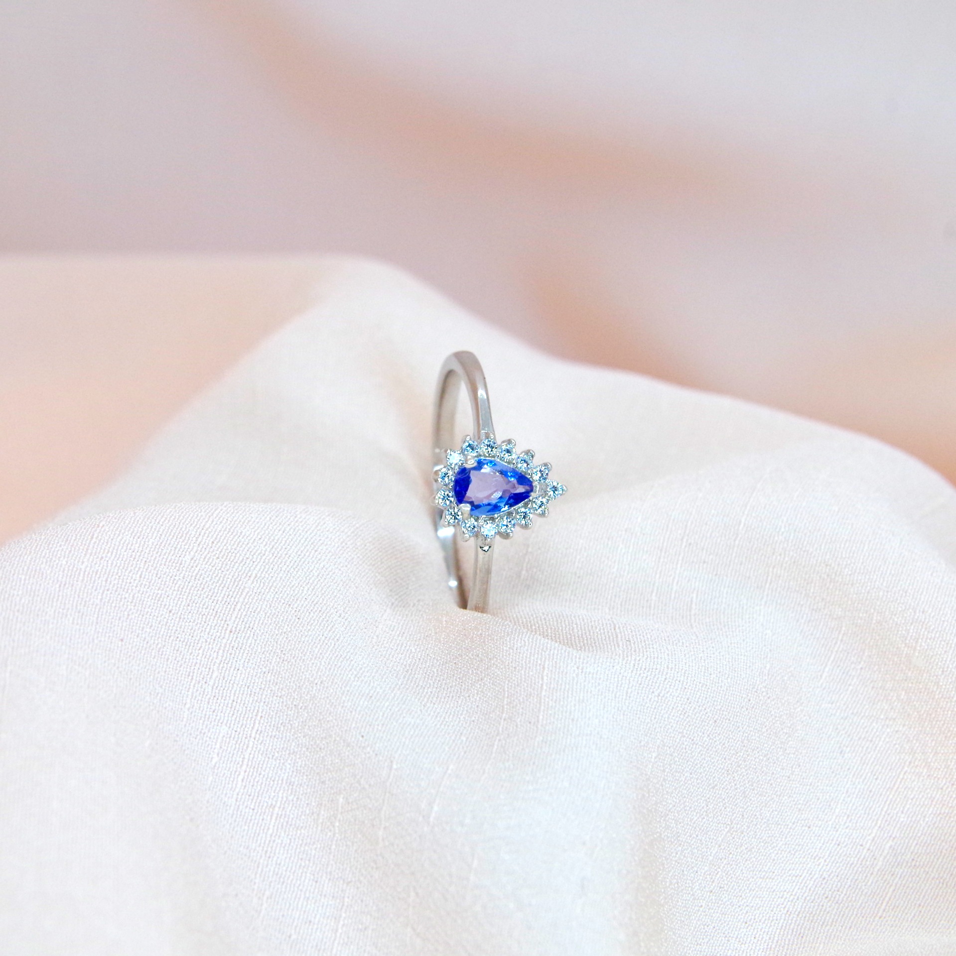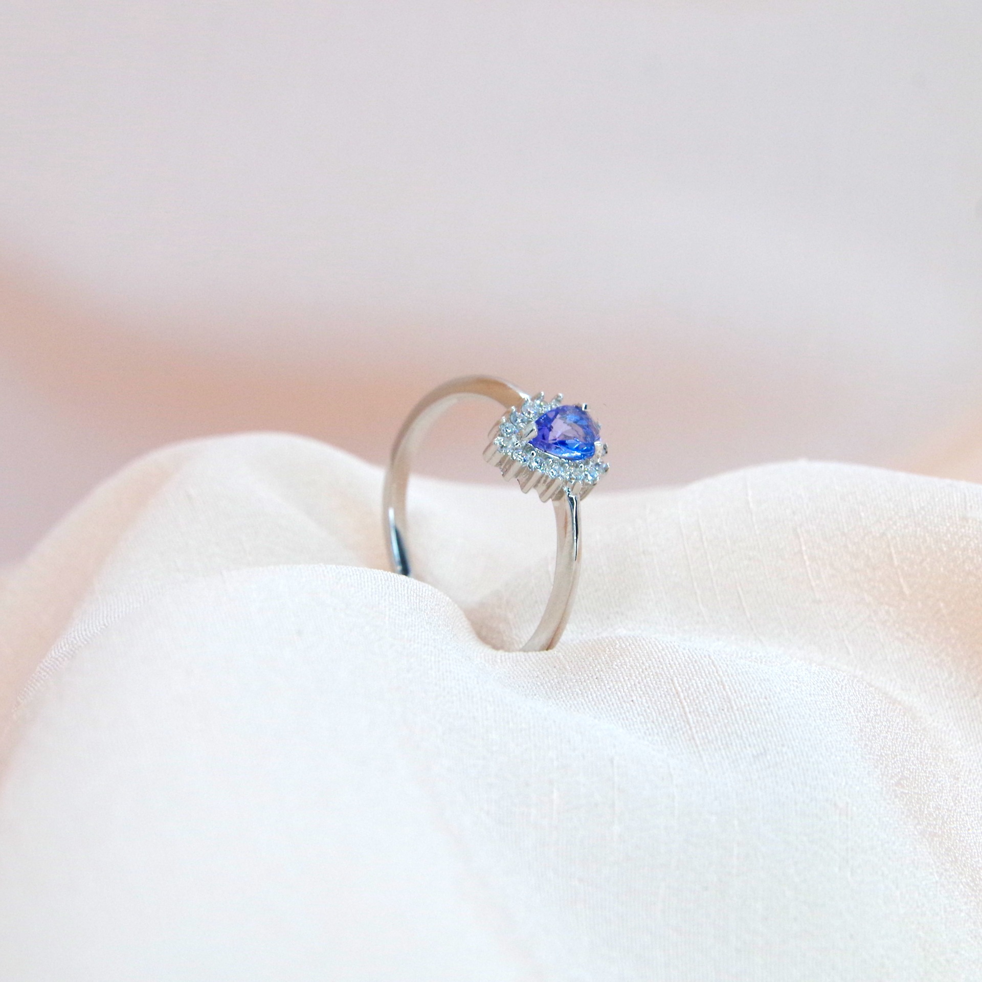 Půvabný stříbrný prsten s přírodním tanzanitem a zirkony, pozlacený 14k bílým zlatem.