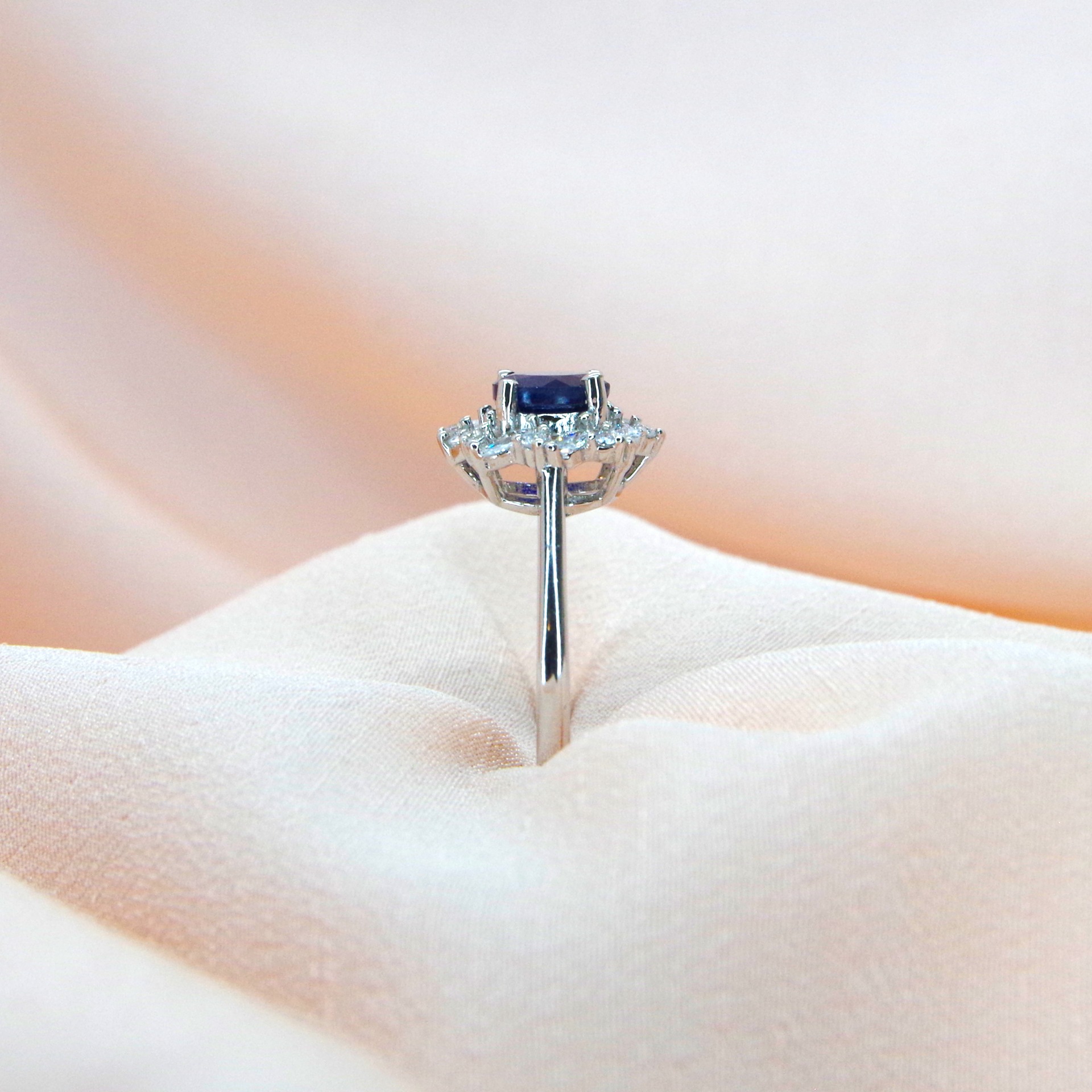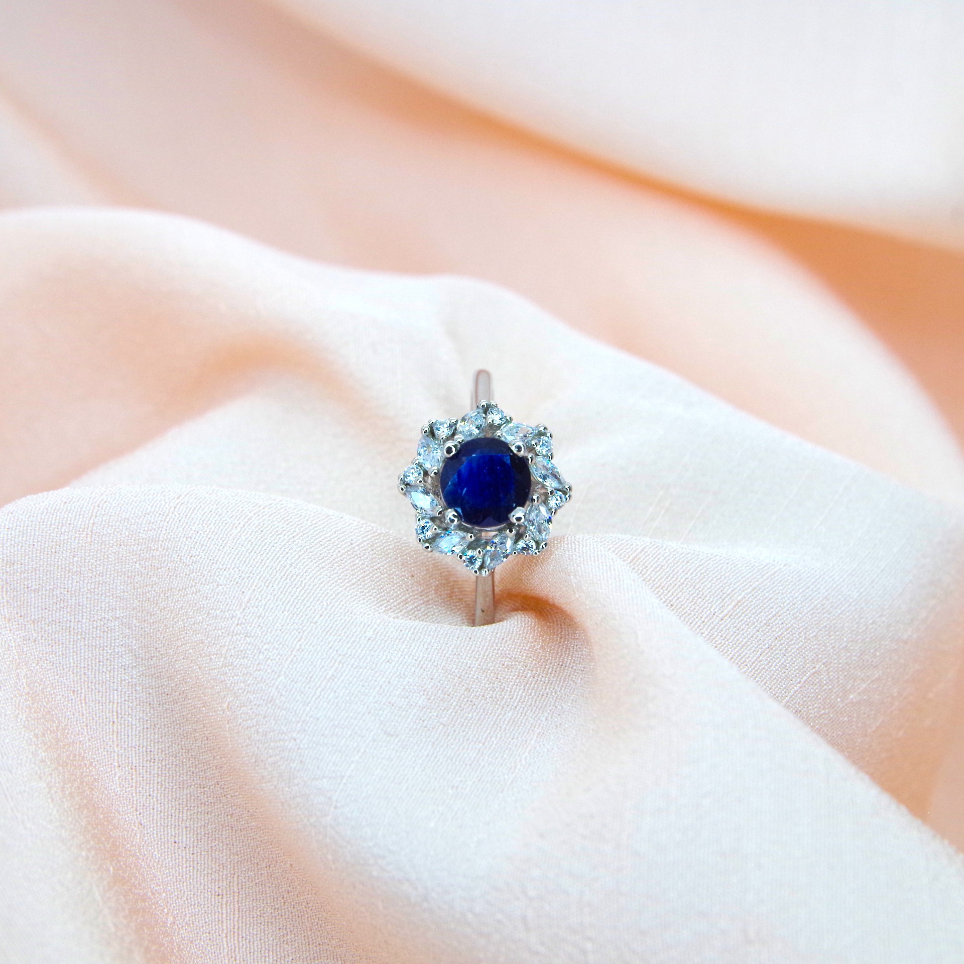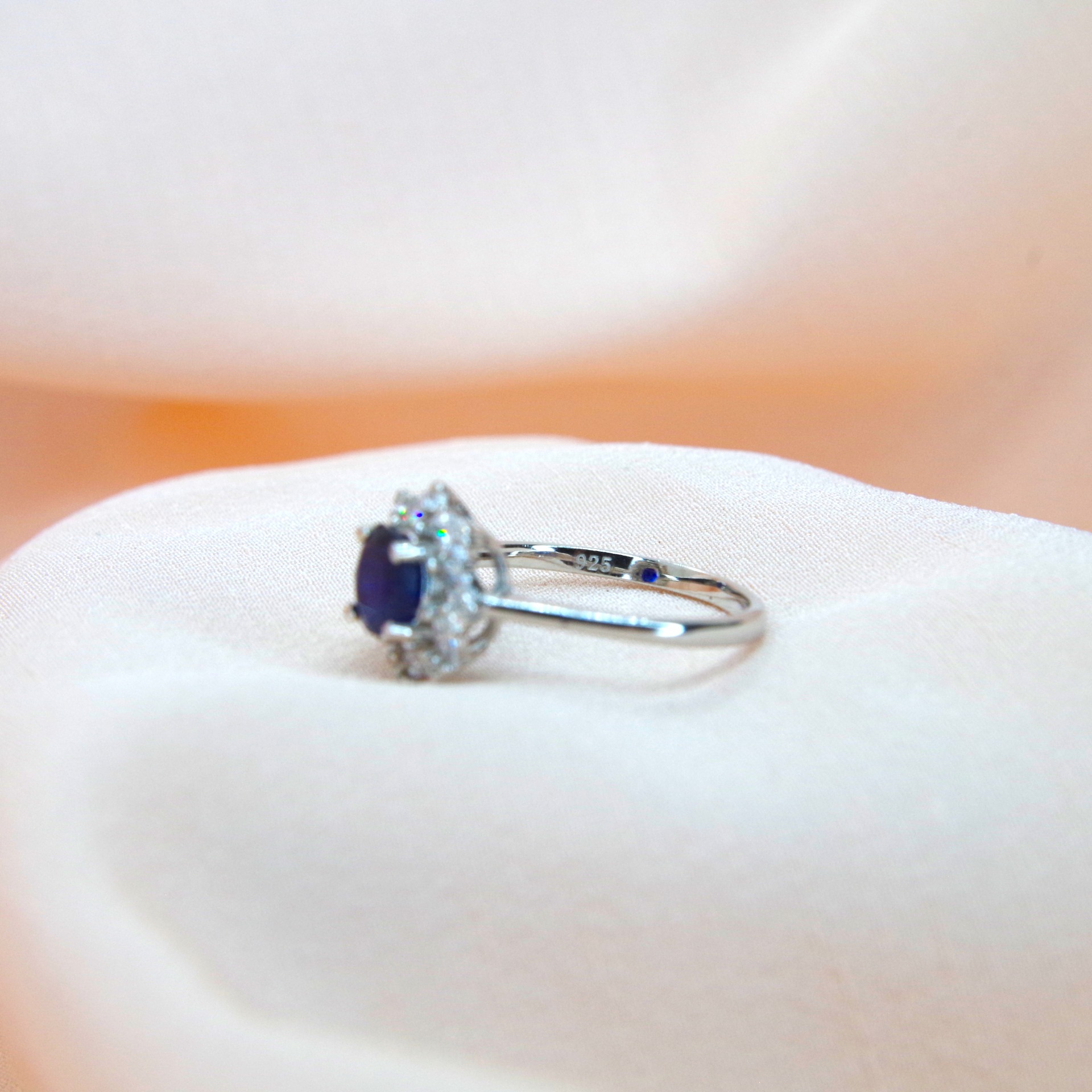 Krásný stříbrný prsten s přírodním safírem a zirkony, pozlacený 14k bílým zlatem.