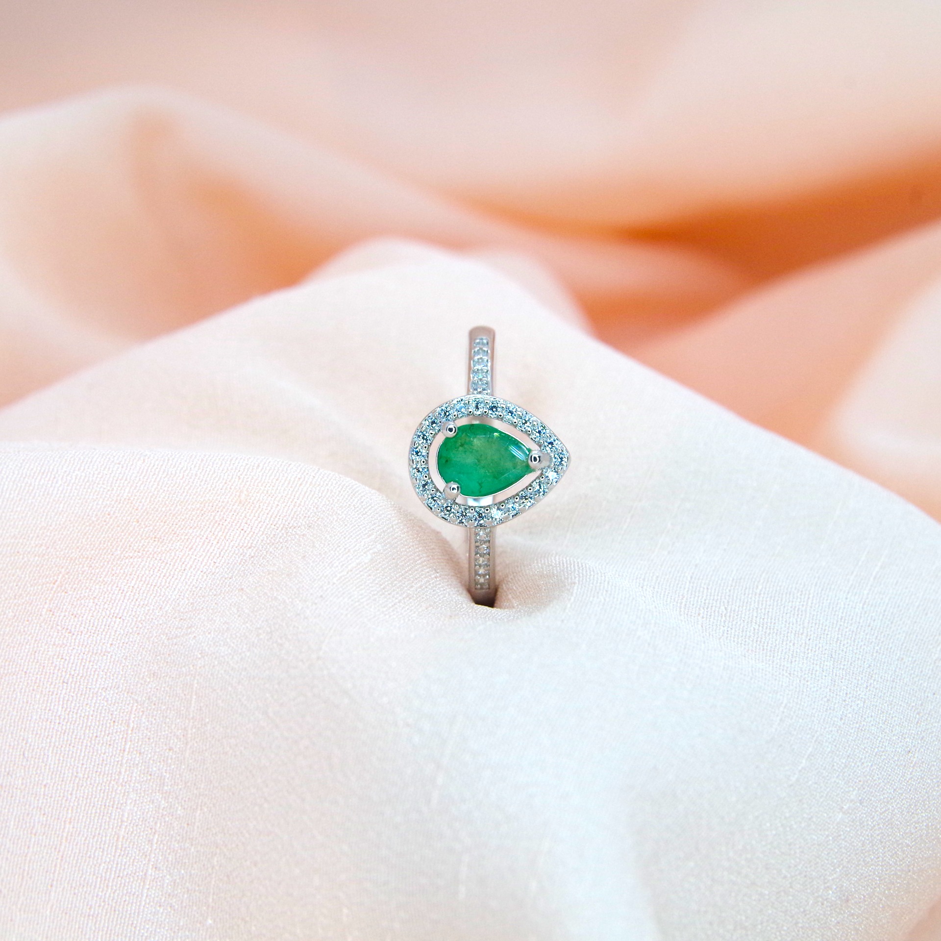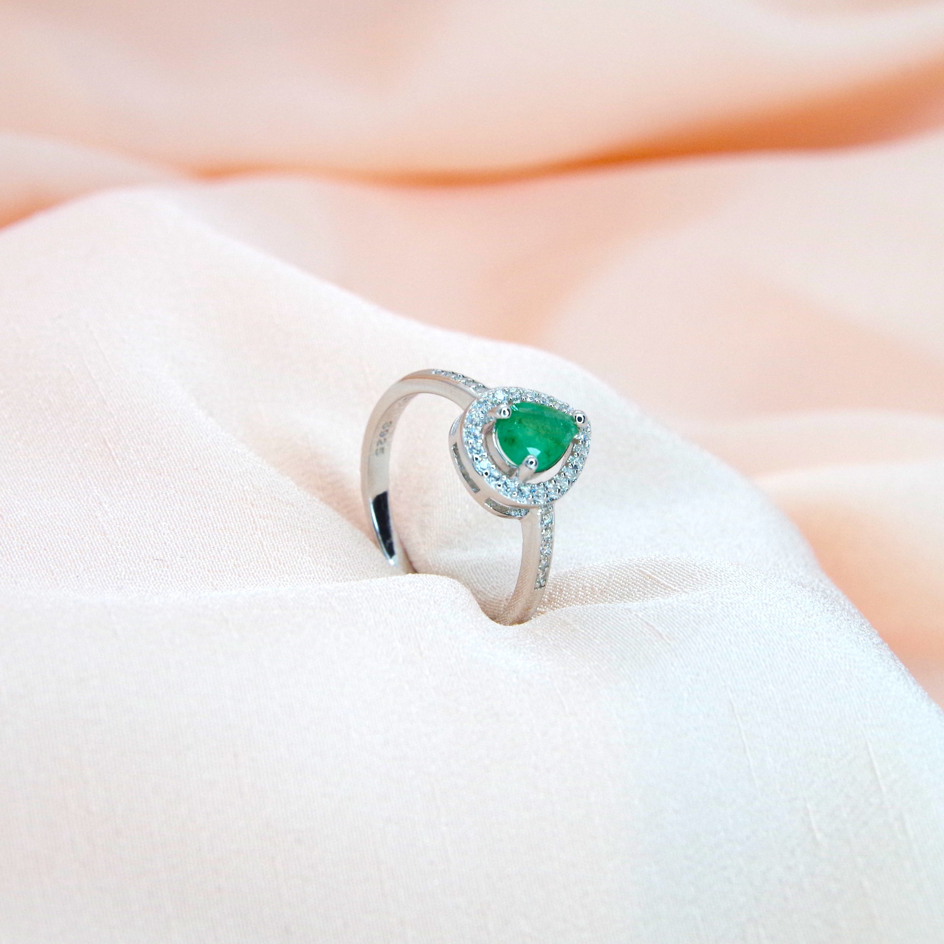 Půvabný stříbrný prsten s přírodním smaragdem (emeraldem) a zirkony, pozlacený 14k bílým zlatem.