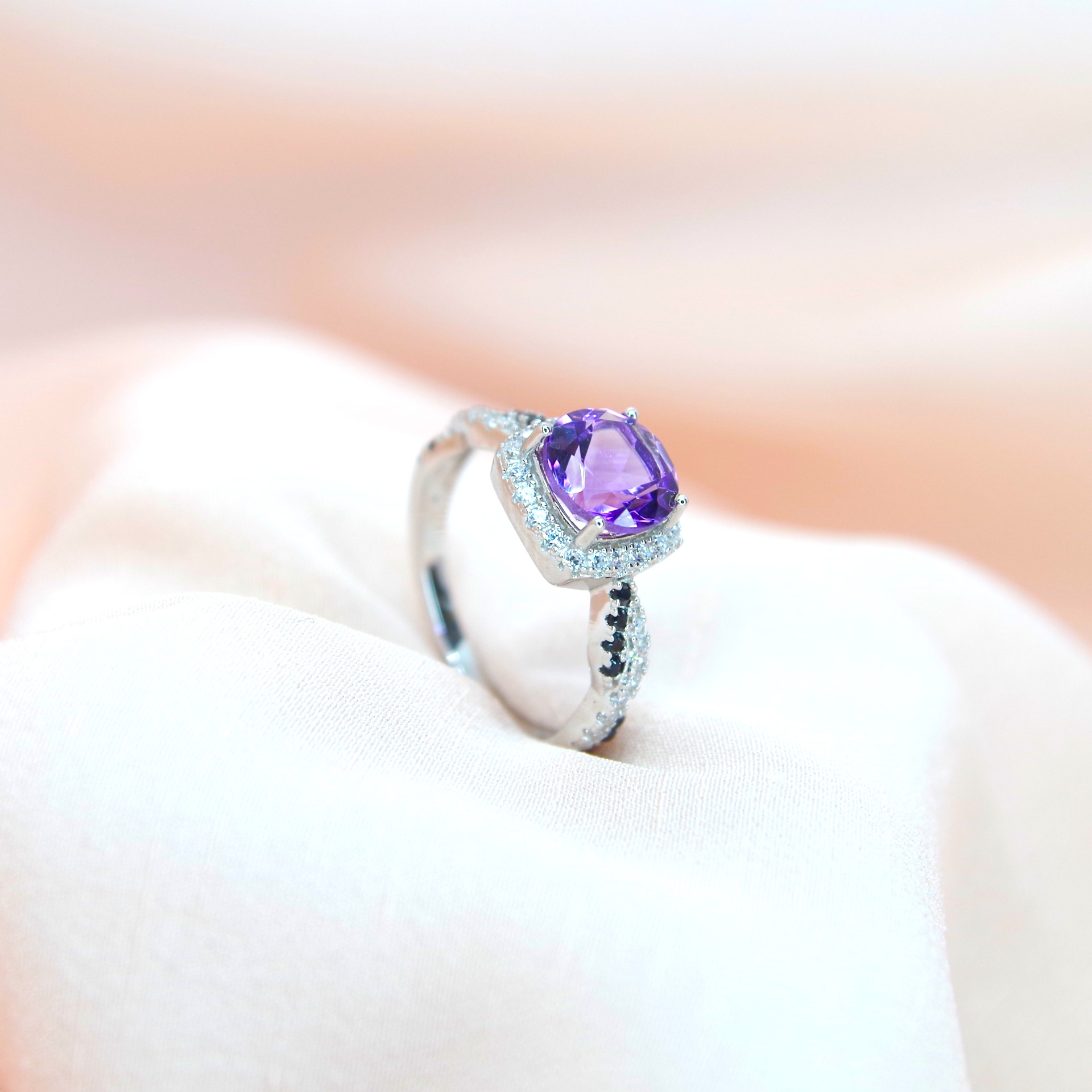 Luxusní stříbrný prsten s přírodním ametystem, černými spinely a třpytivými zirkony, pozlacený 14k bílým zlatem.