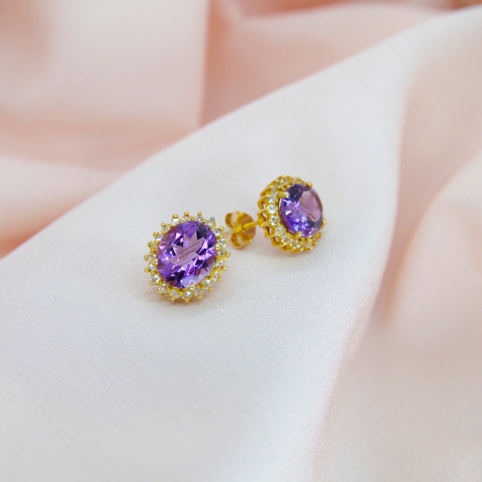 Luxusní stříbrné náušnice s přírodním ametystem, pozlacené 14k žlutým zlatem.