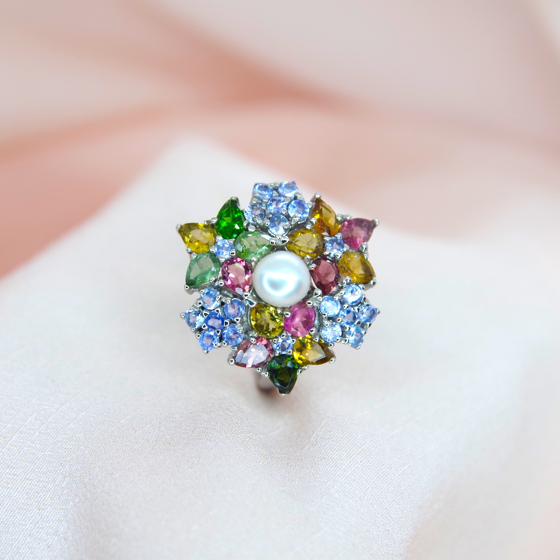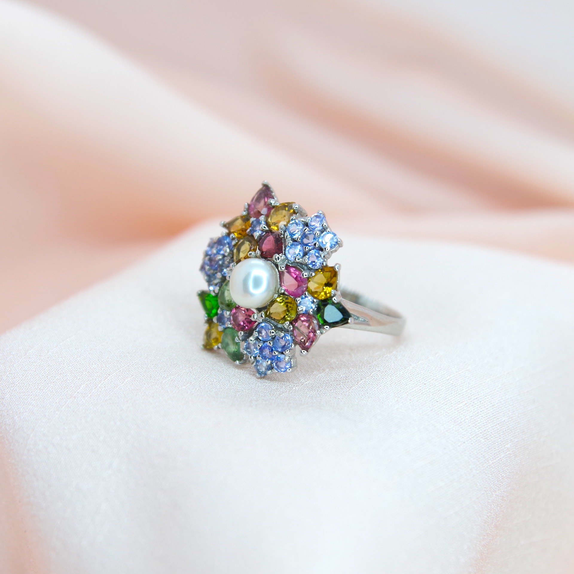 Luxusní barevný prsten s pravými kameny, ve tvaru květin, pozlacené 14k bílým zlatem.