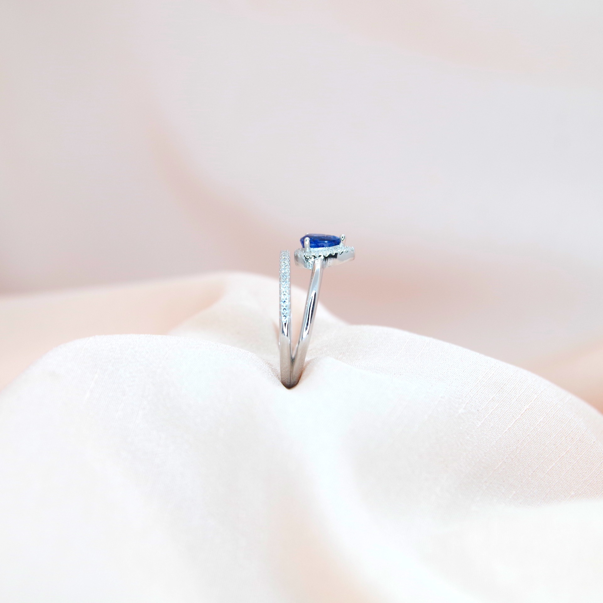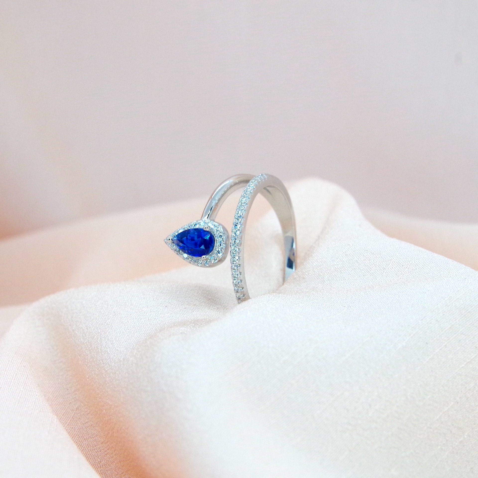 Oslňující stříbrný prsten s přírodním kyanitem a zirkony, pozlacený 14k bílým zlatem.