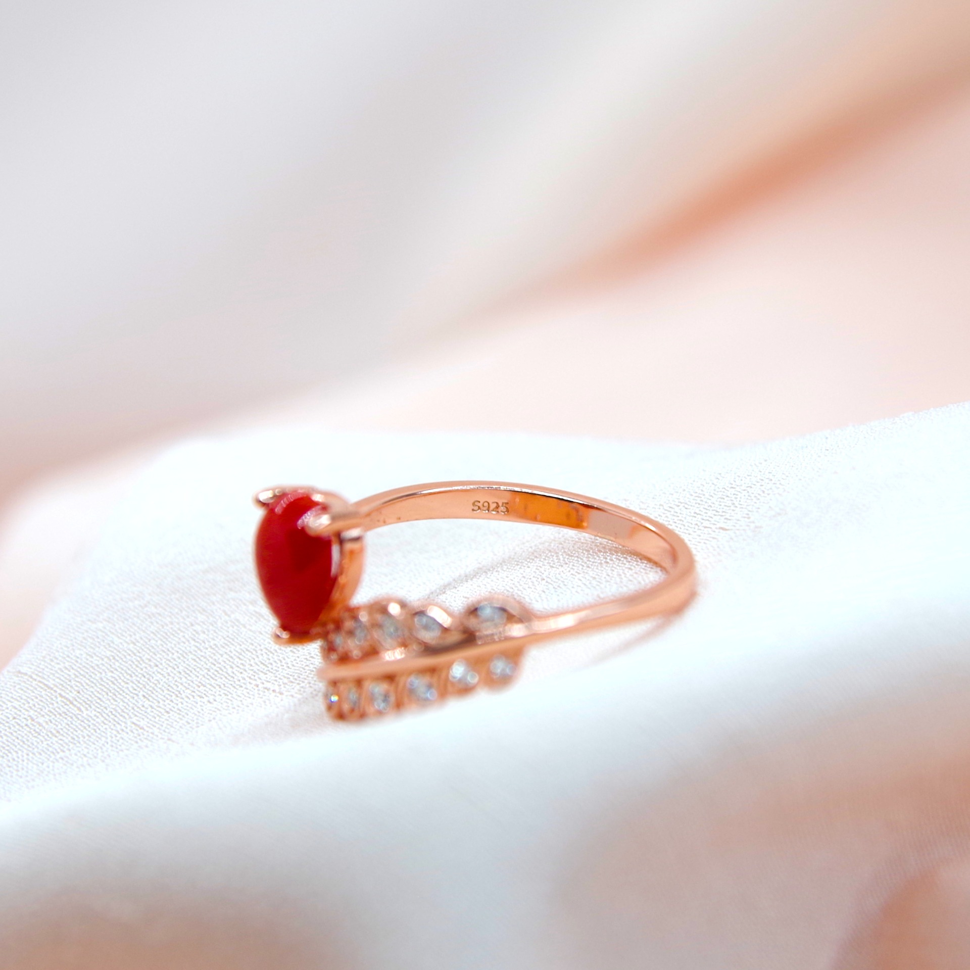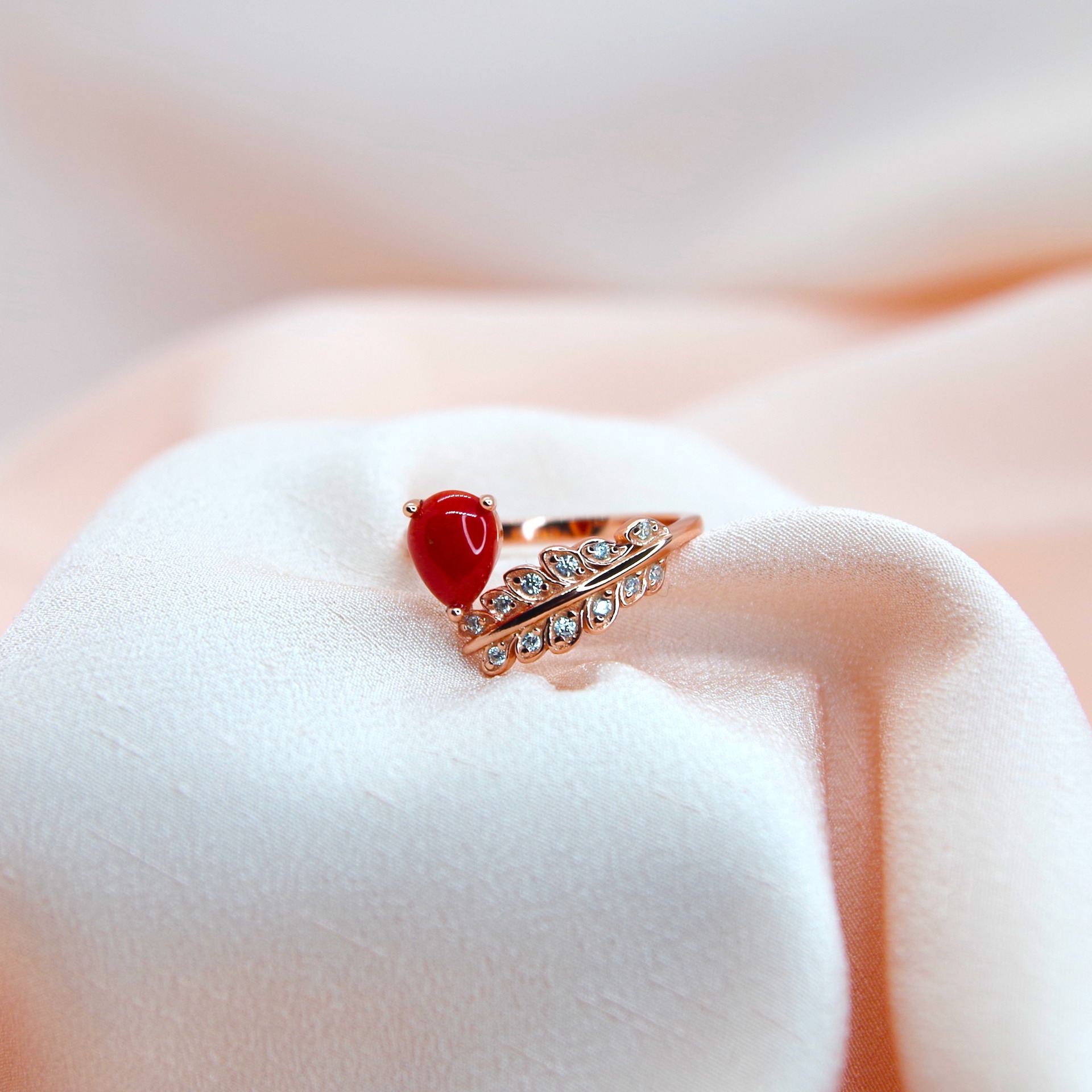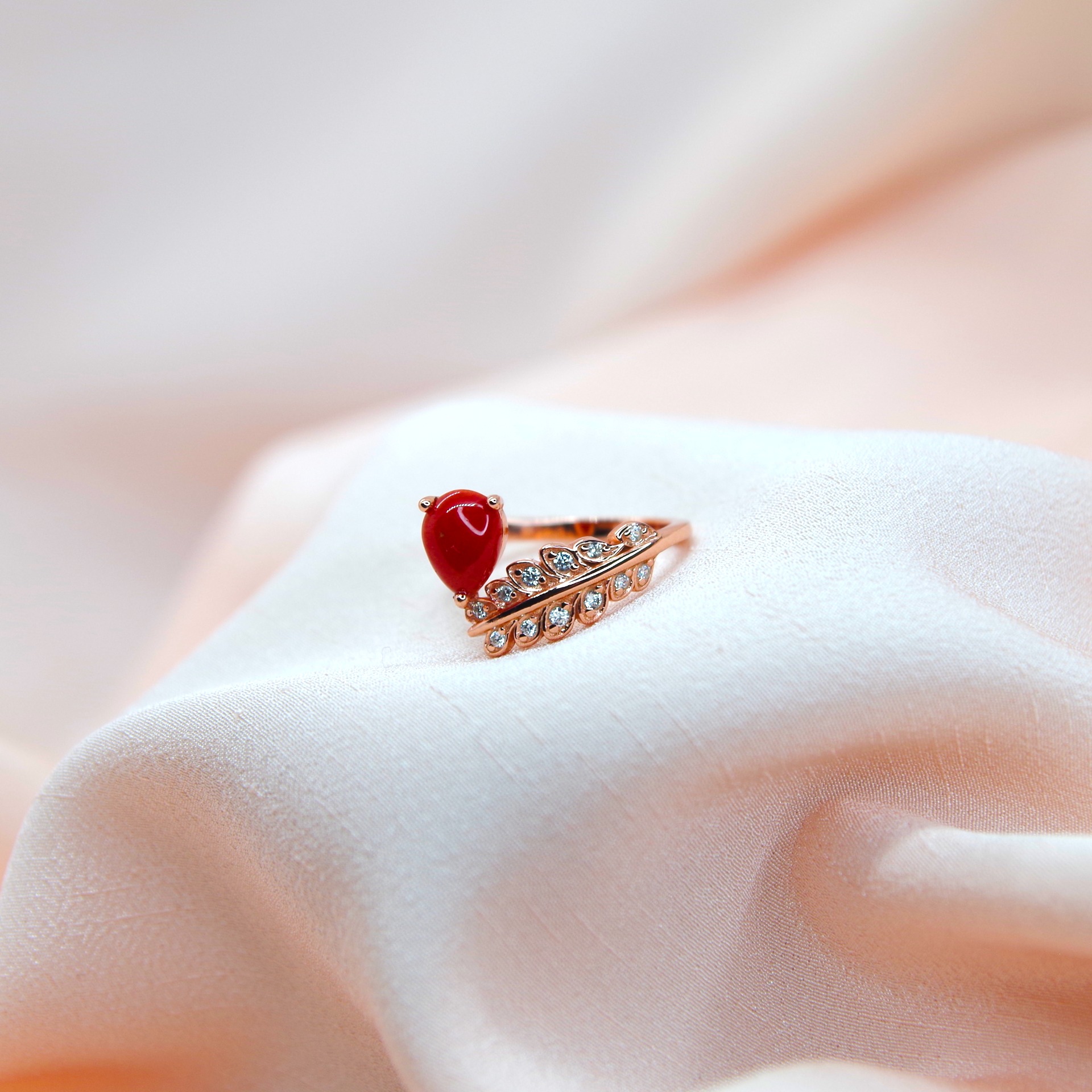 Zářivý stříbrný prsten s přírodním korálem, pozlacený 14k růžovým zlatem.