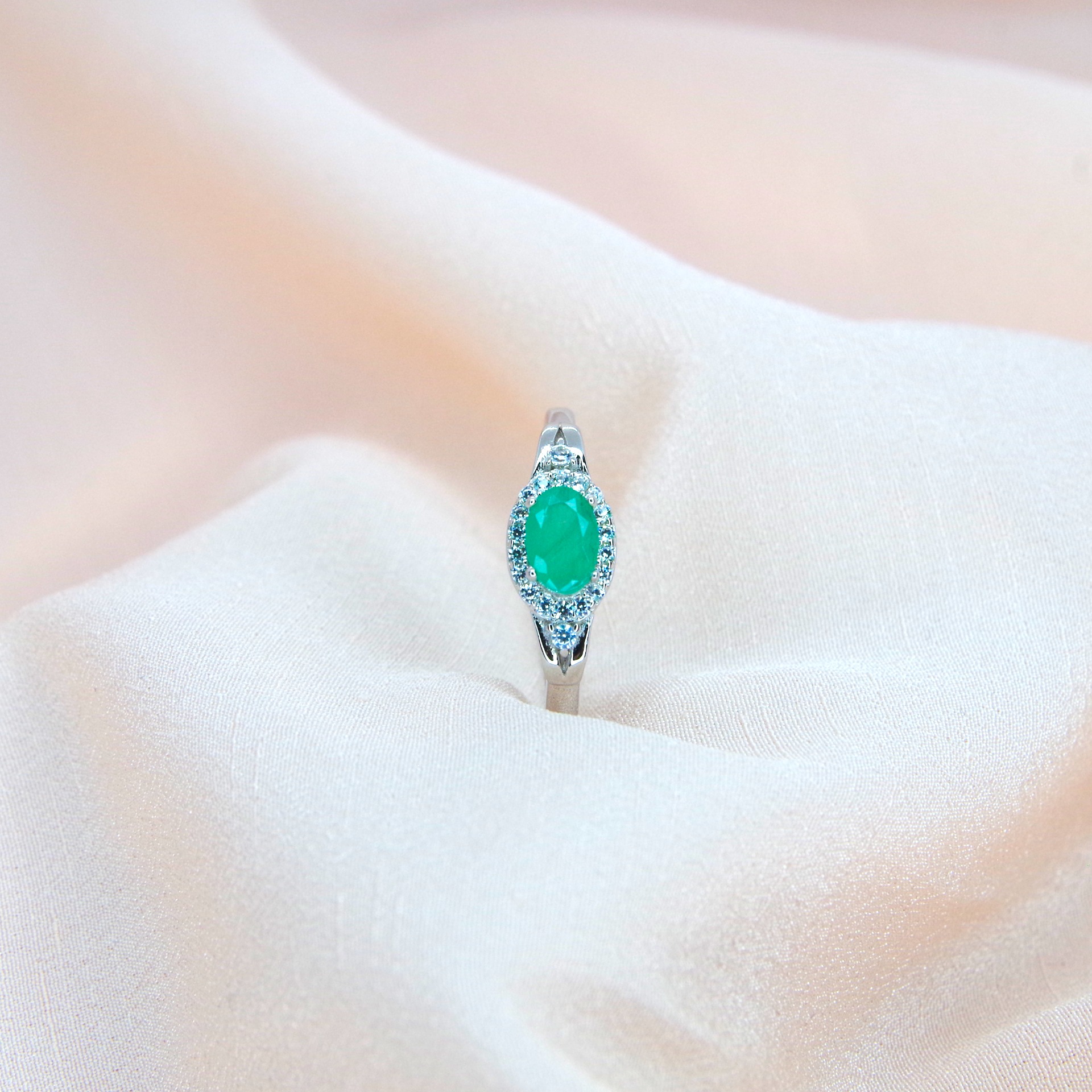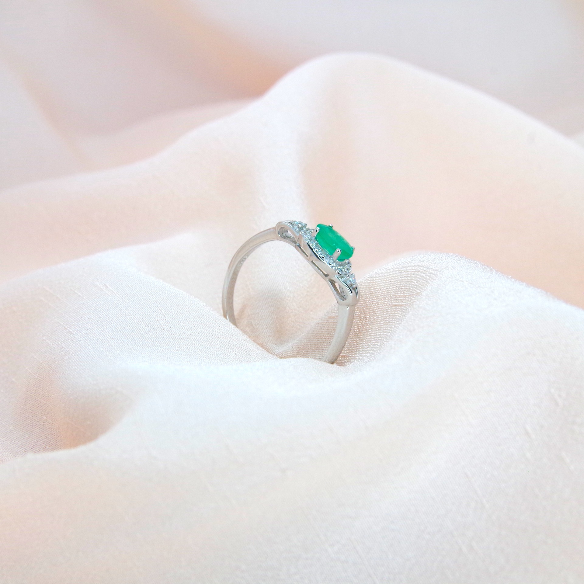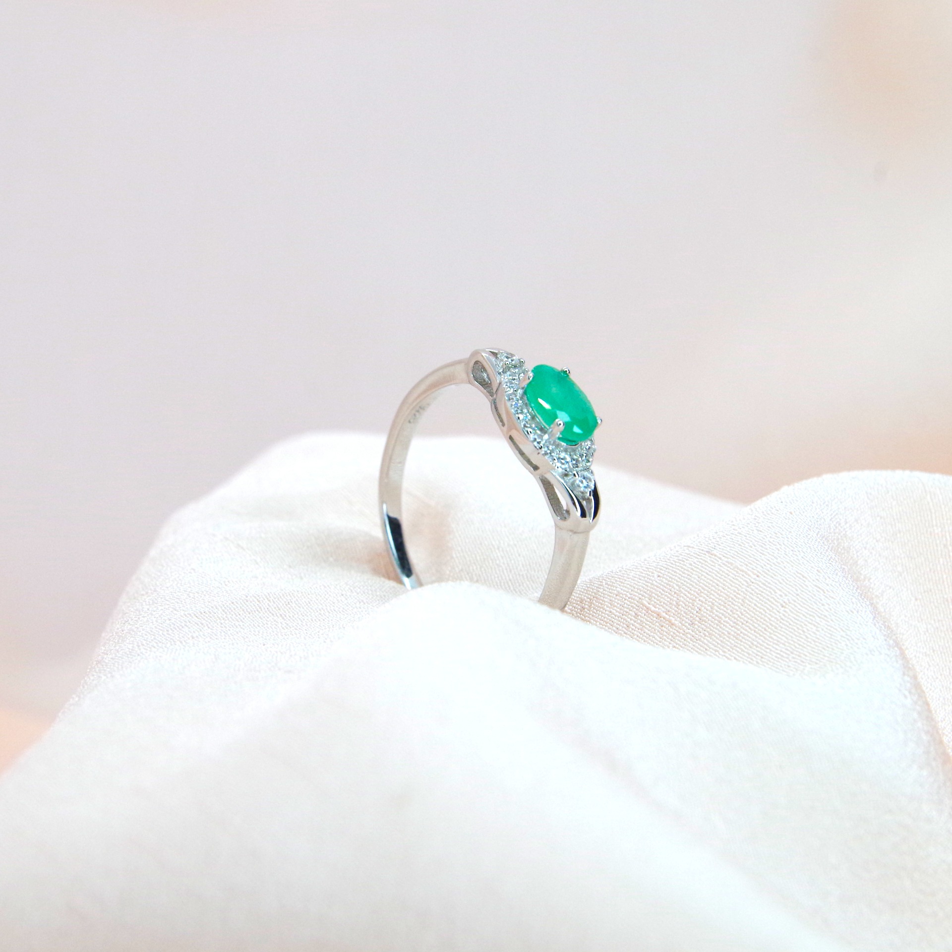 Půvabný stříbrný prsten s přírodním smaragdem (emeraldem) a zirkony, pozlacený 14k bílým zlatem.