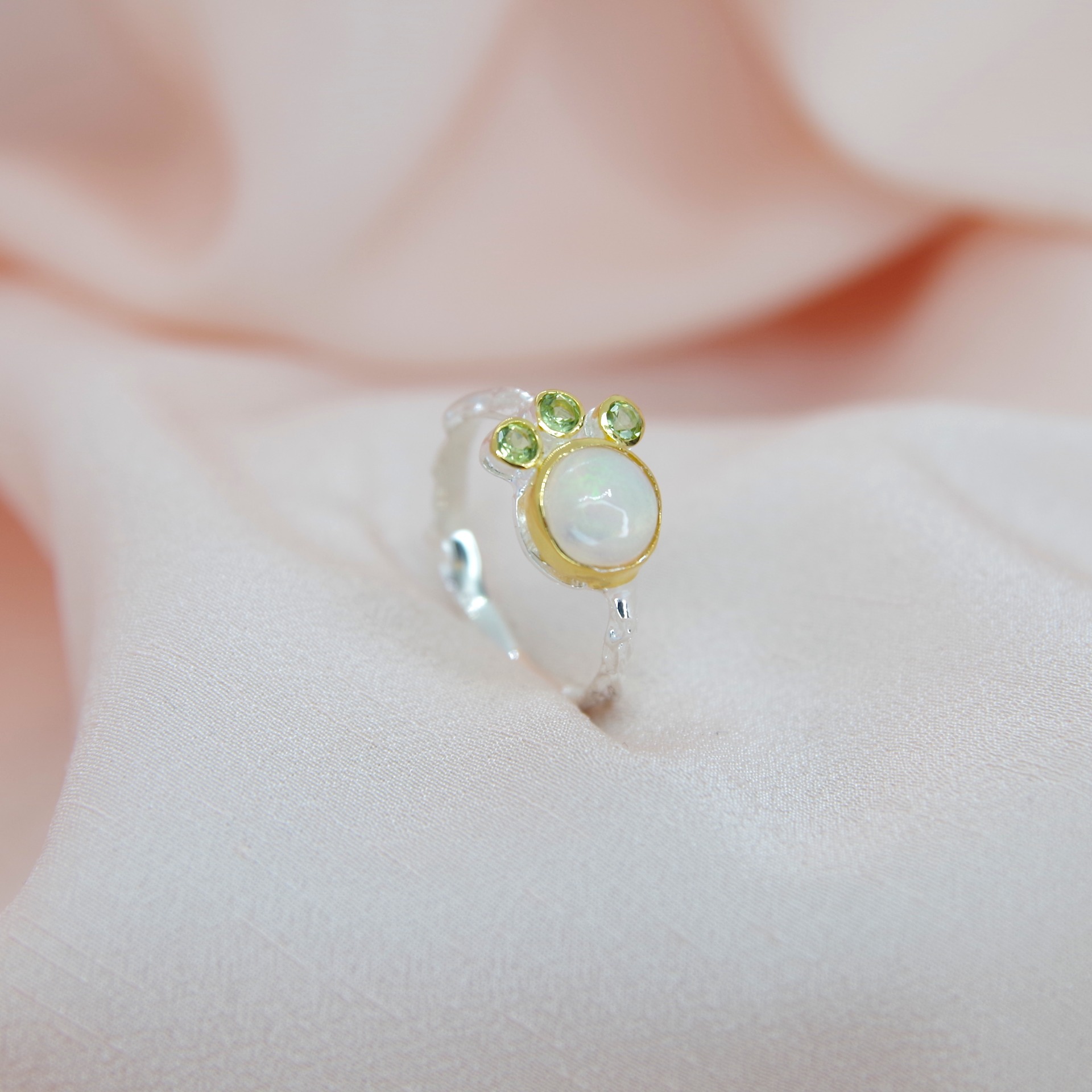 Řemeslně zpracovaný stříbrný prsten s přírodním opálem a olivíny, pozlacený 14k zlatem. Jedinečný kus.