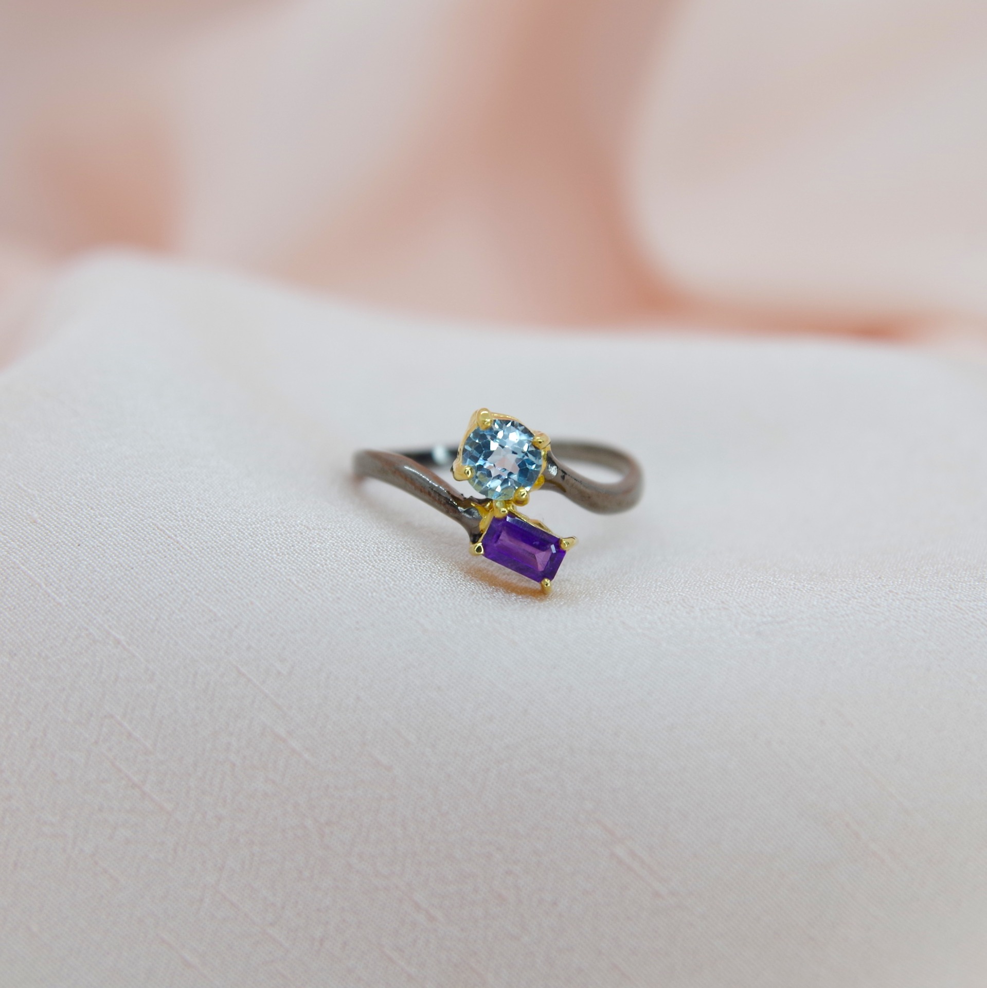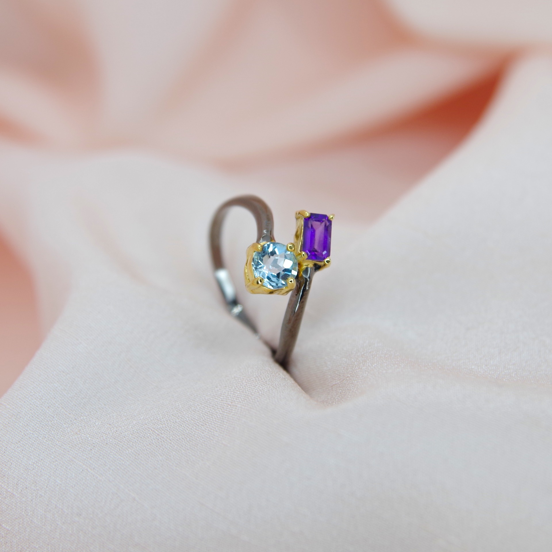 Řemeslně zpracovaný stříbrný prsten s přírodním modrým topazem a ametystem, pozlacený 14k zlatem a černým rhodiem. Jedinečný kus.