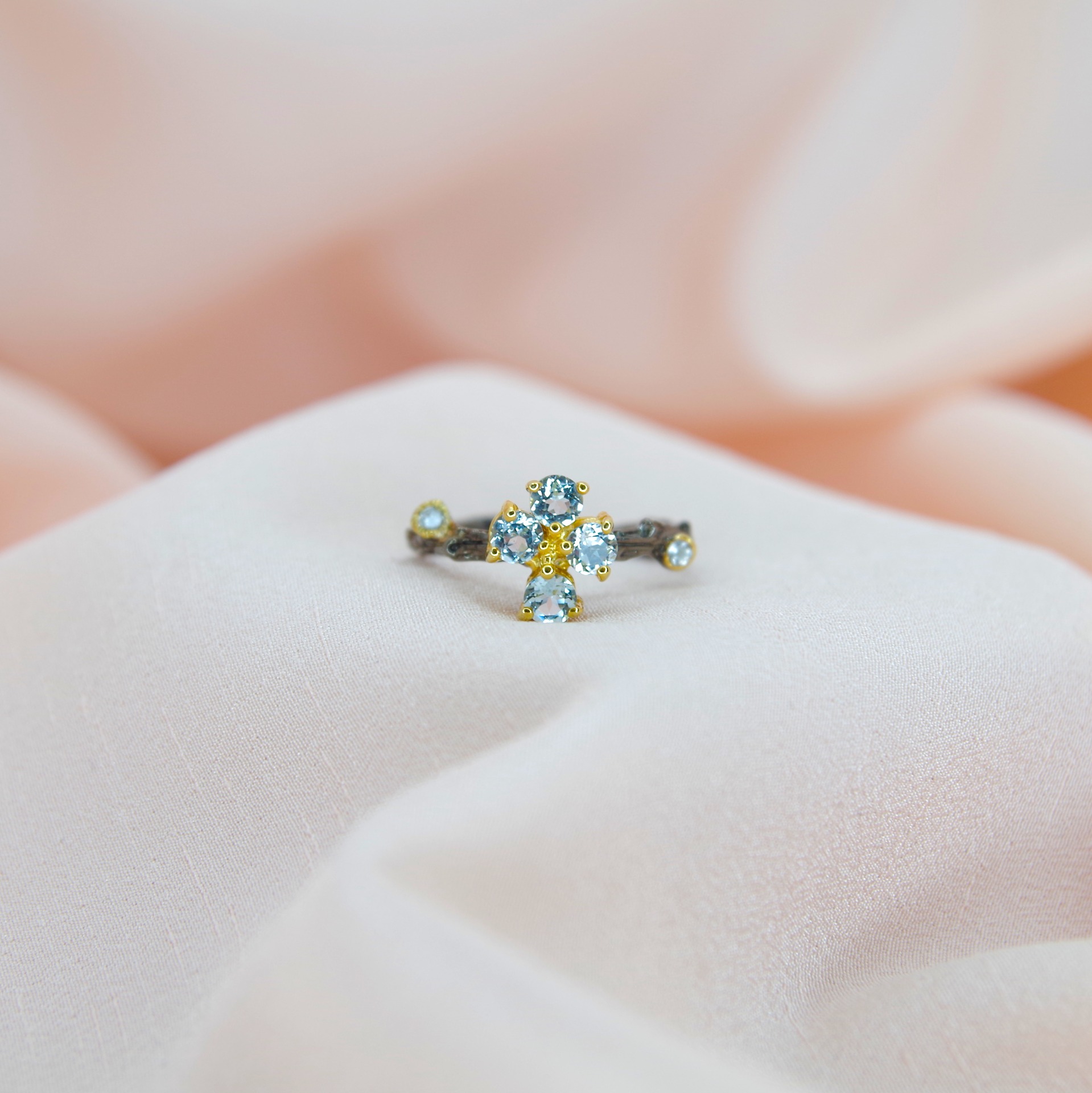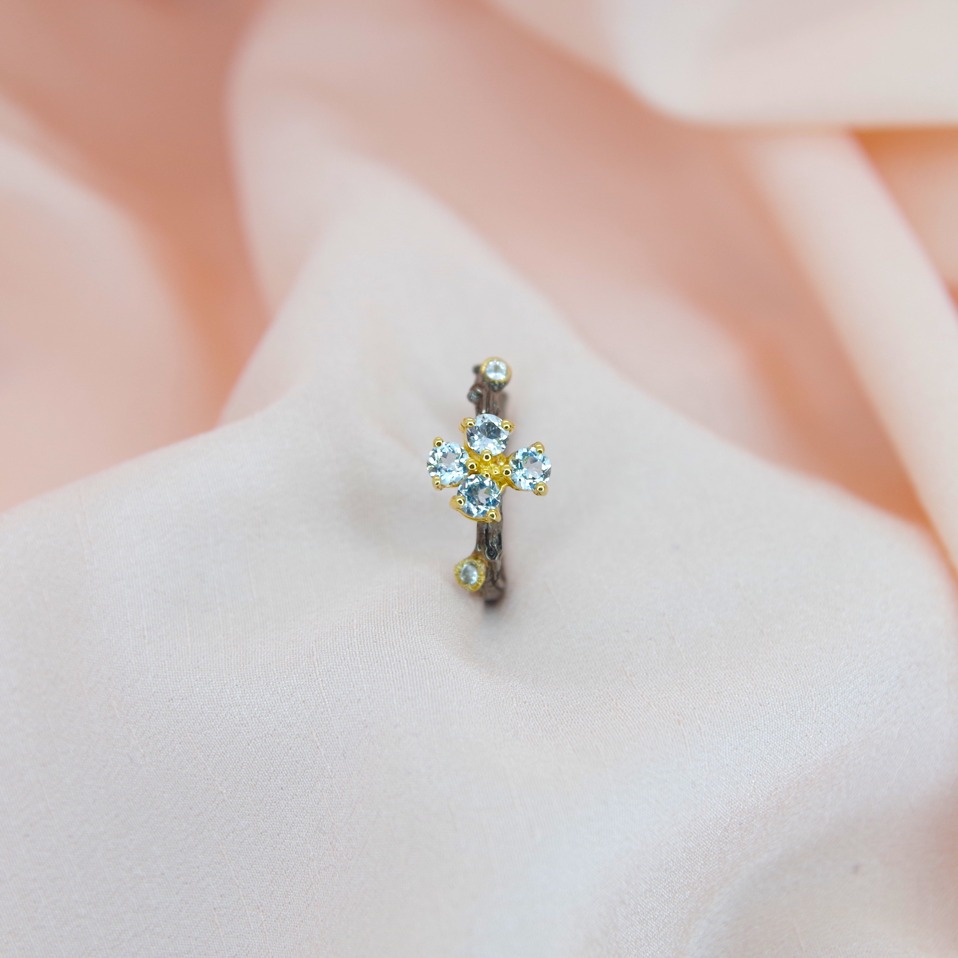 Řemeslně zpracovaný stříbrný prsten s přírodními modrými topazy, povrchově upravený 14k zlatem a černým rhodiem. Jedinečný kus.
