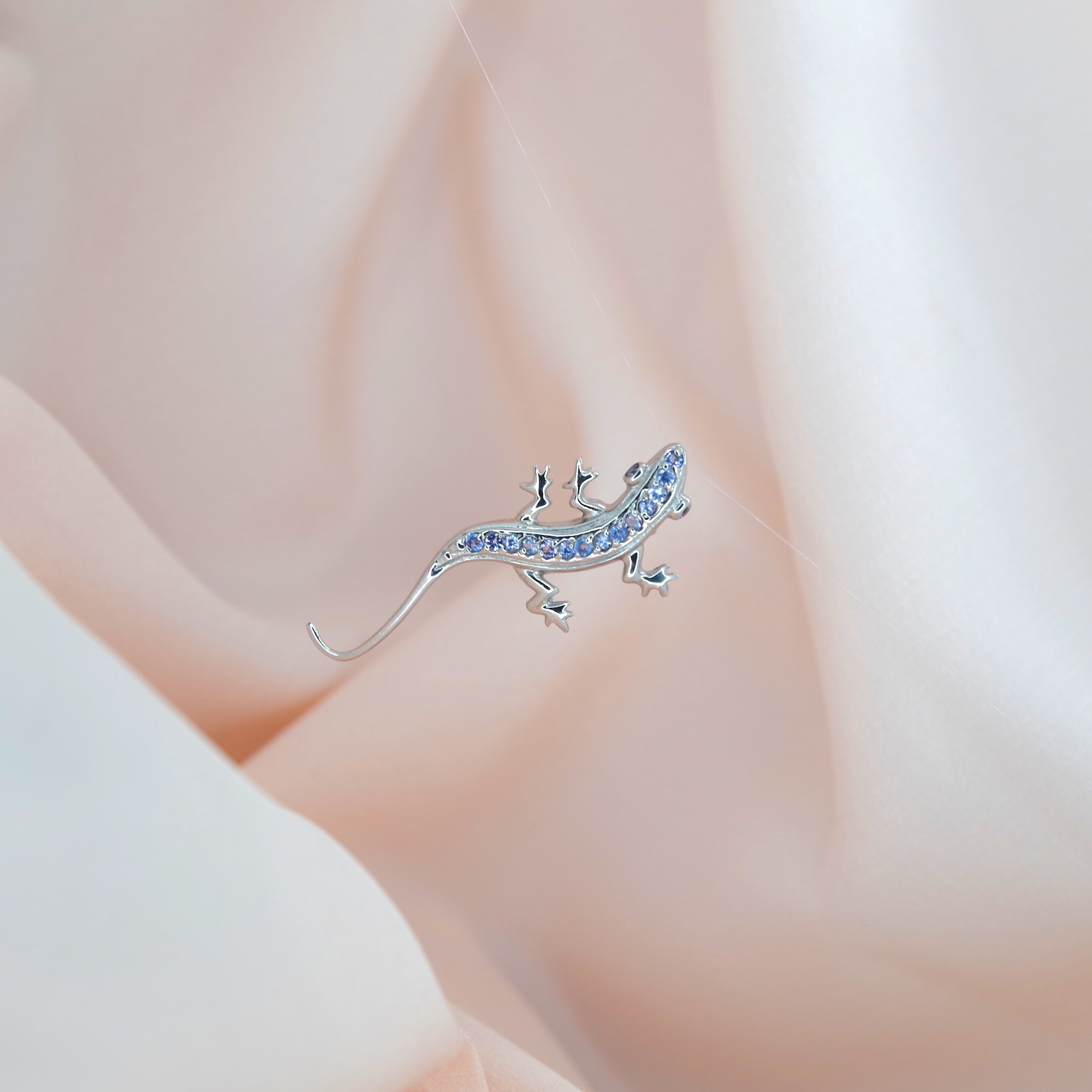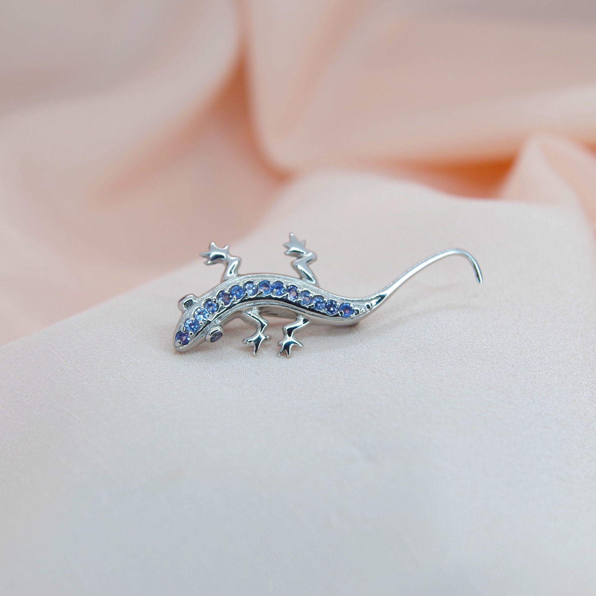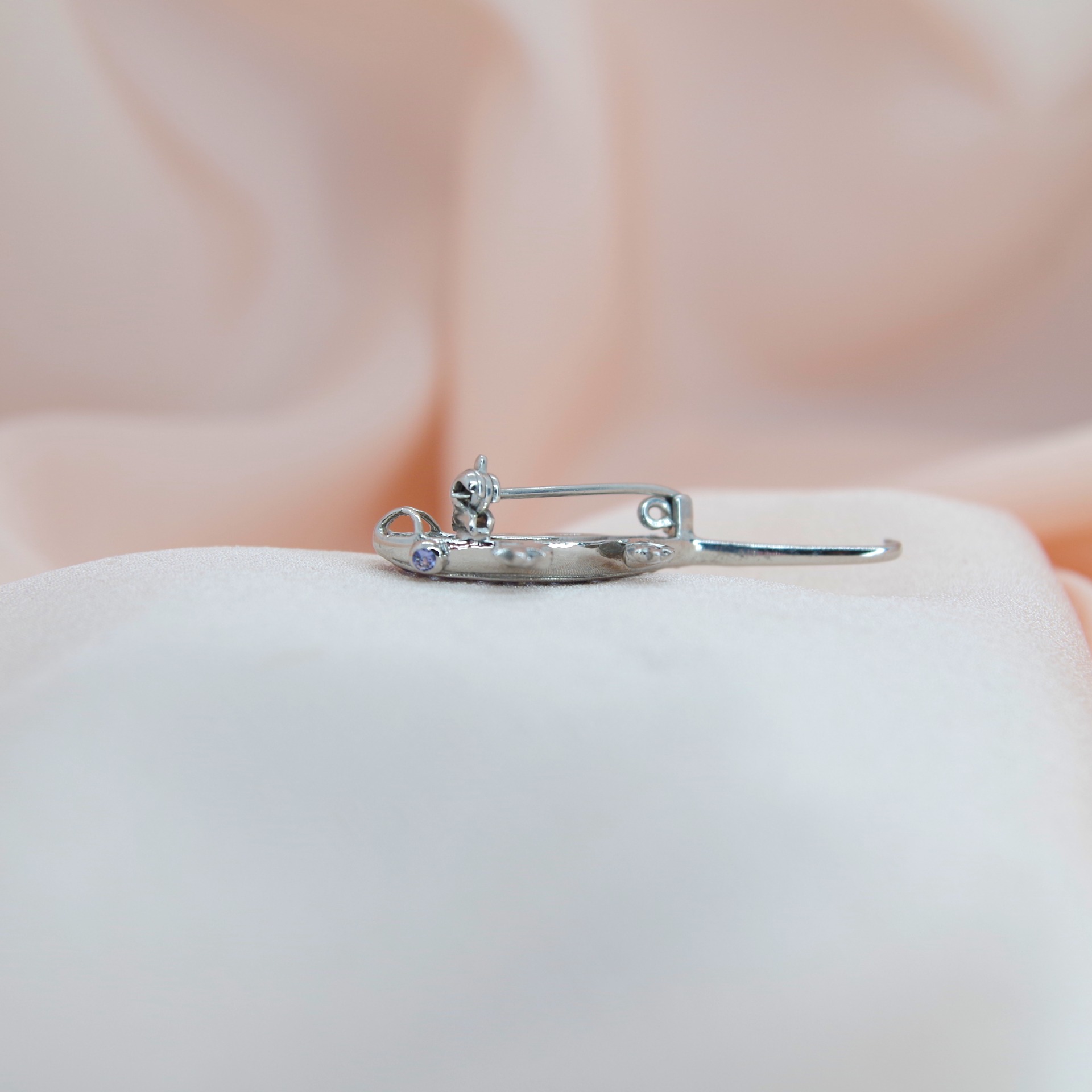 Stříbrná brož s přírodním tanzanitem. Pozlacená 14k bílým zlatem.