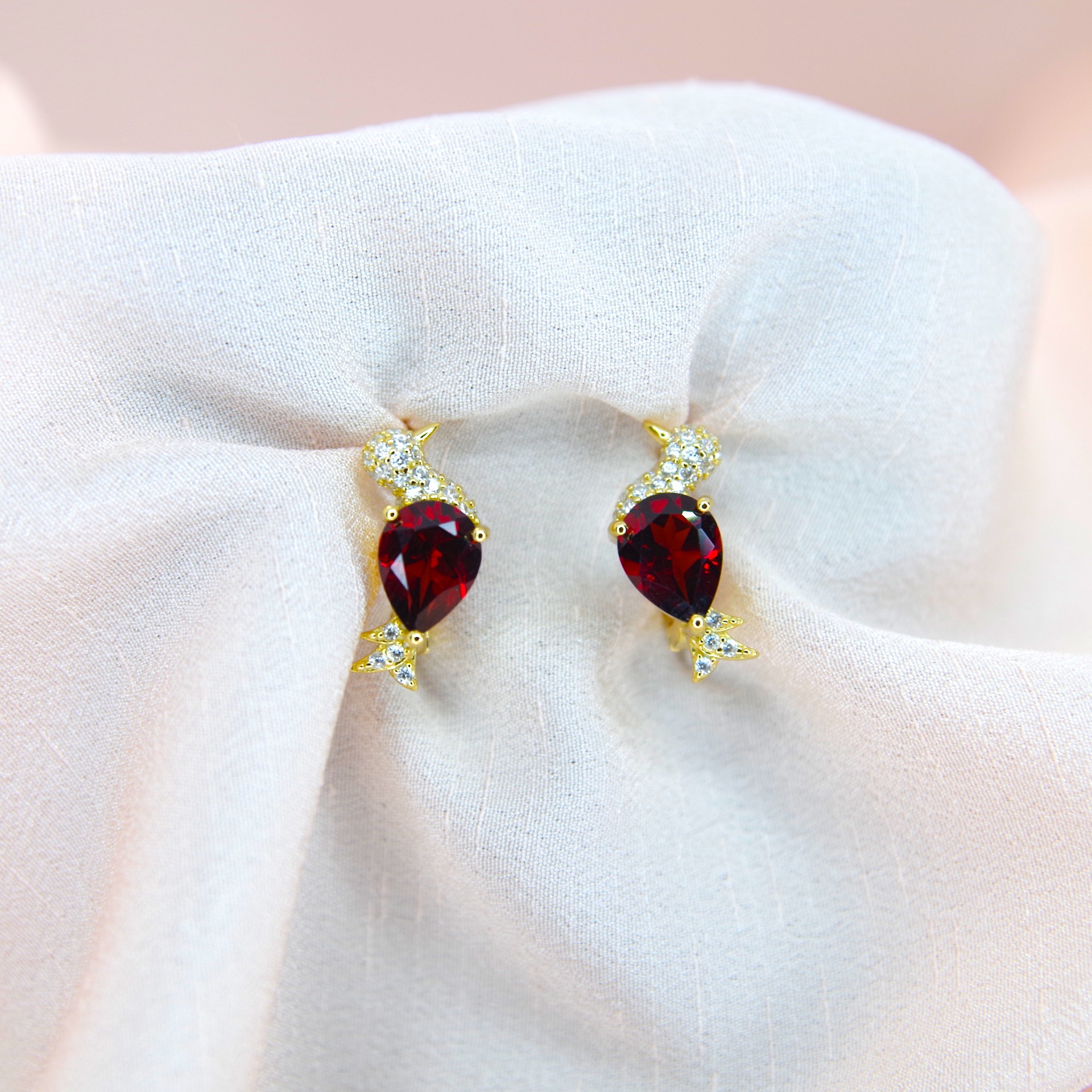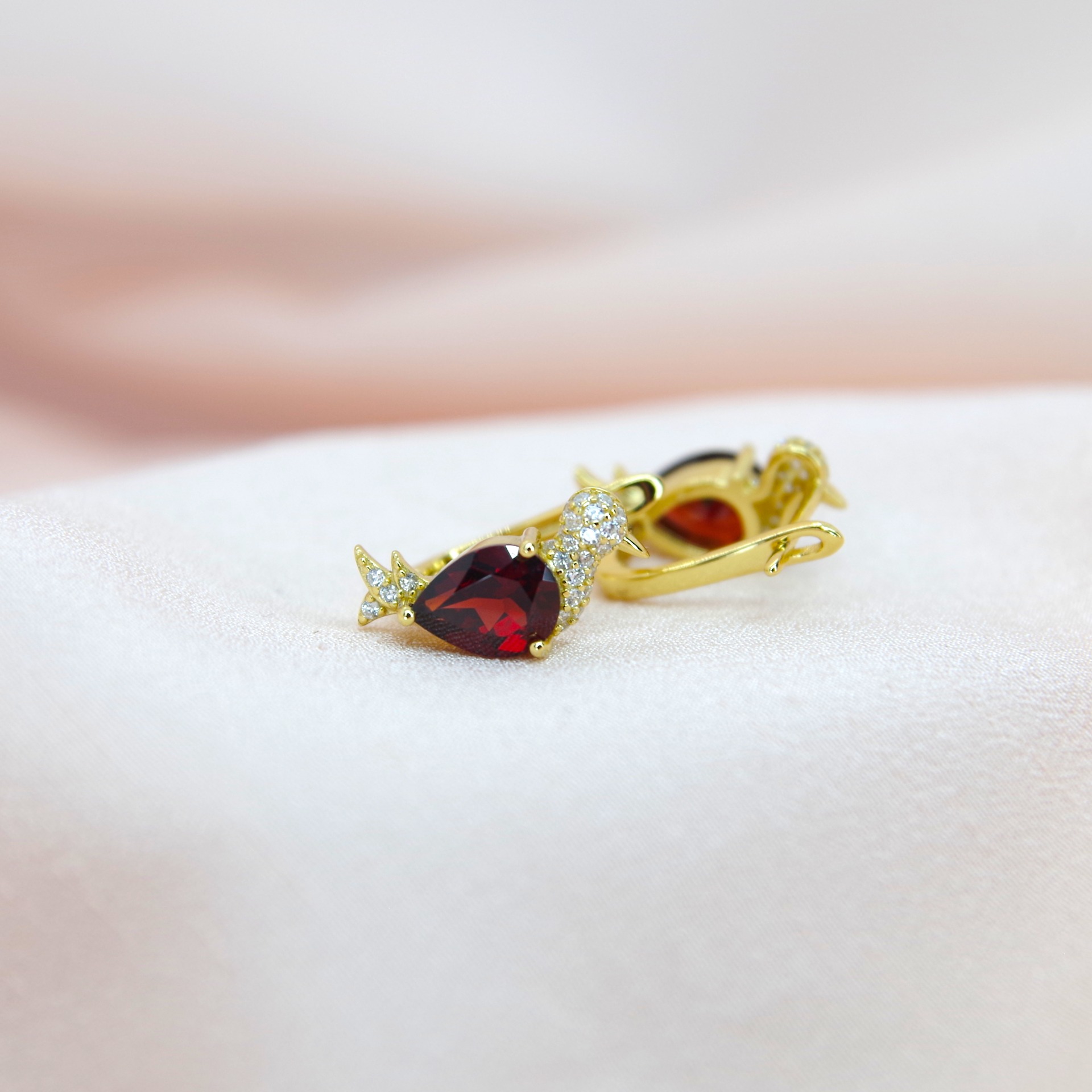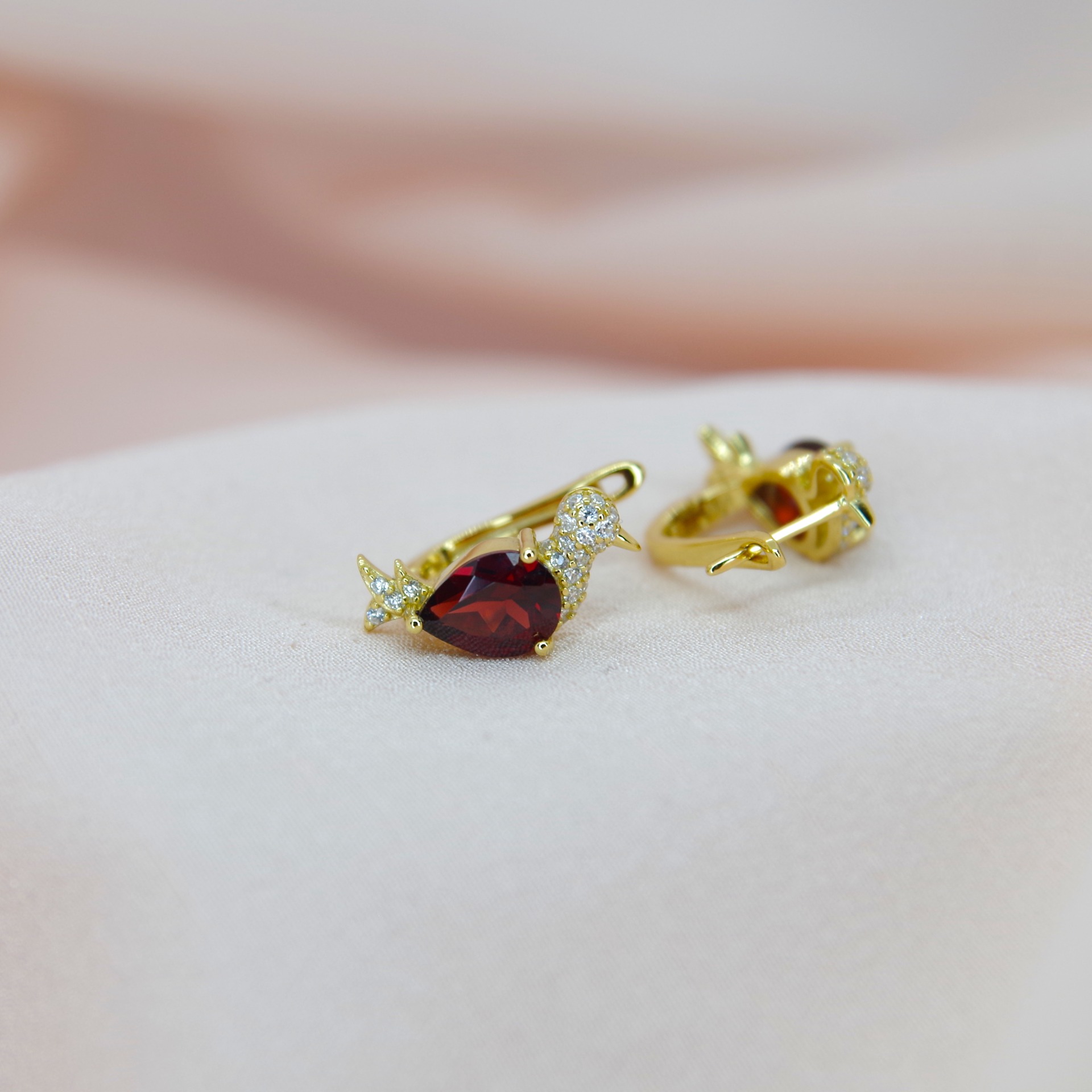 Krásné jarní stříbrné náušnice s přírodním mozambickým granátem a zirkony, pozlacené 14k zlatem.