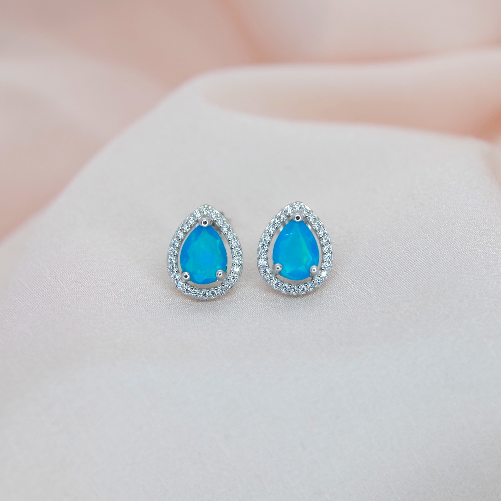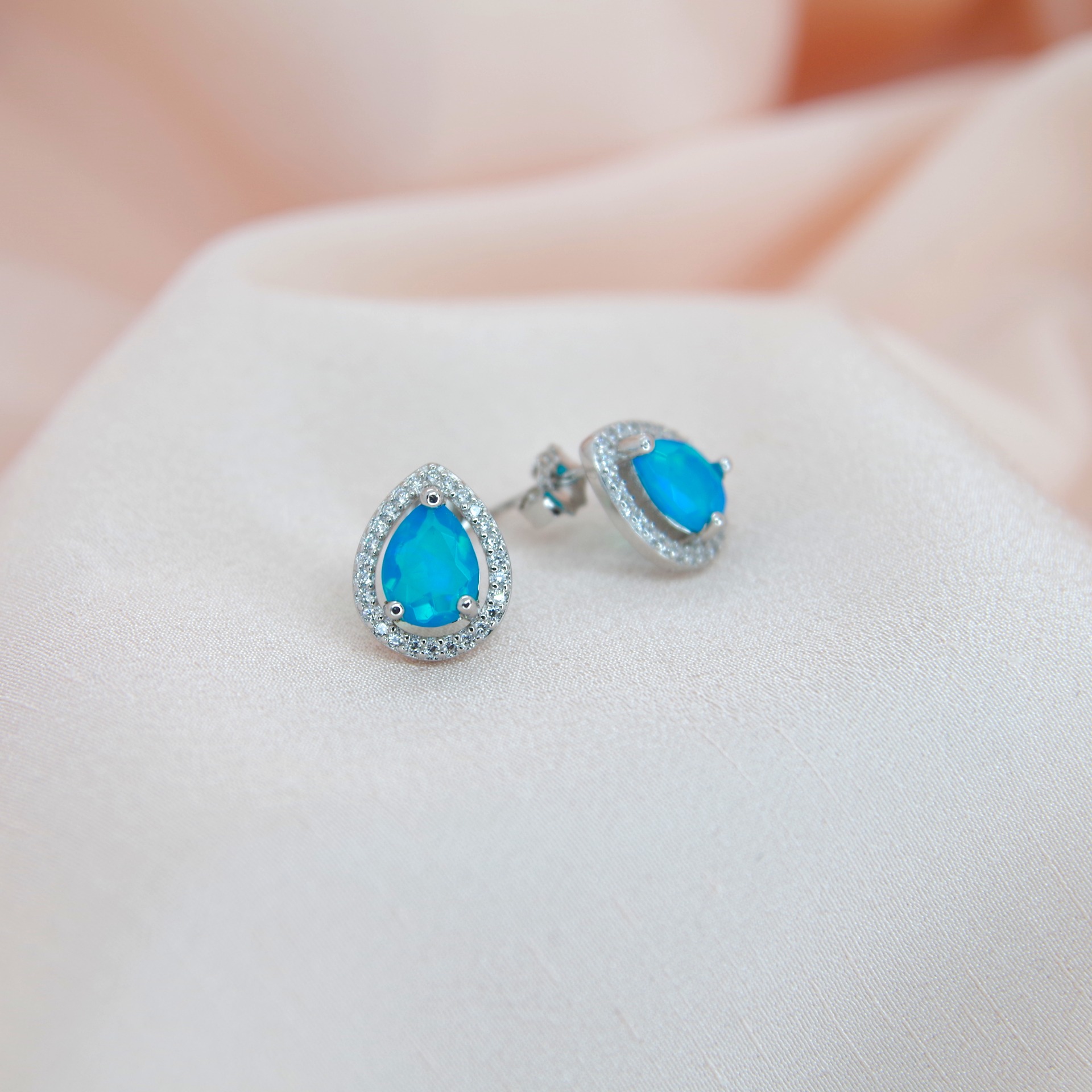 Zářivé stříbrné náušnice s pravými modrými opály, pozlacené 14k bílým zlatem.