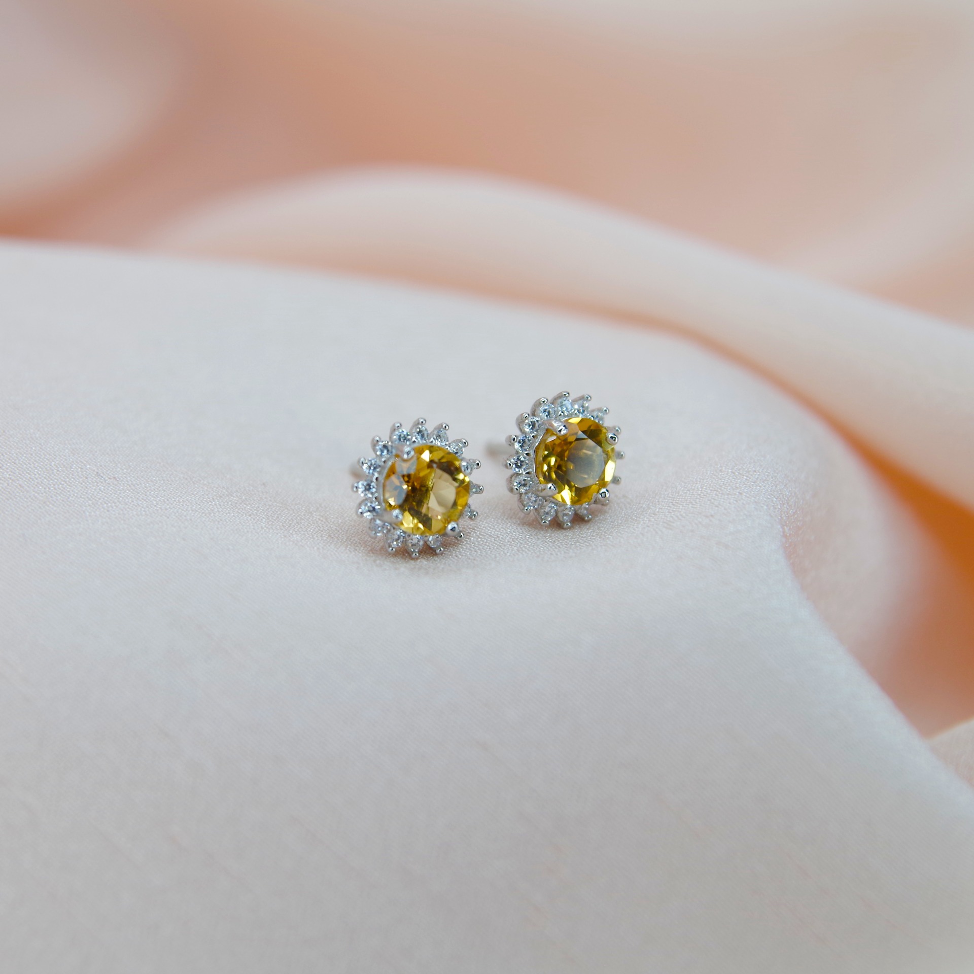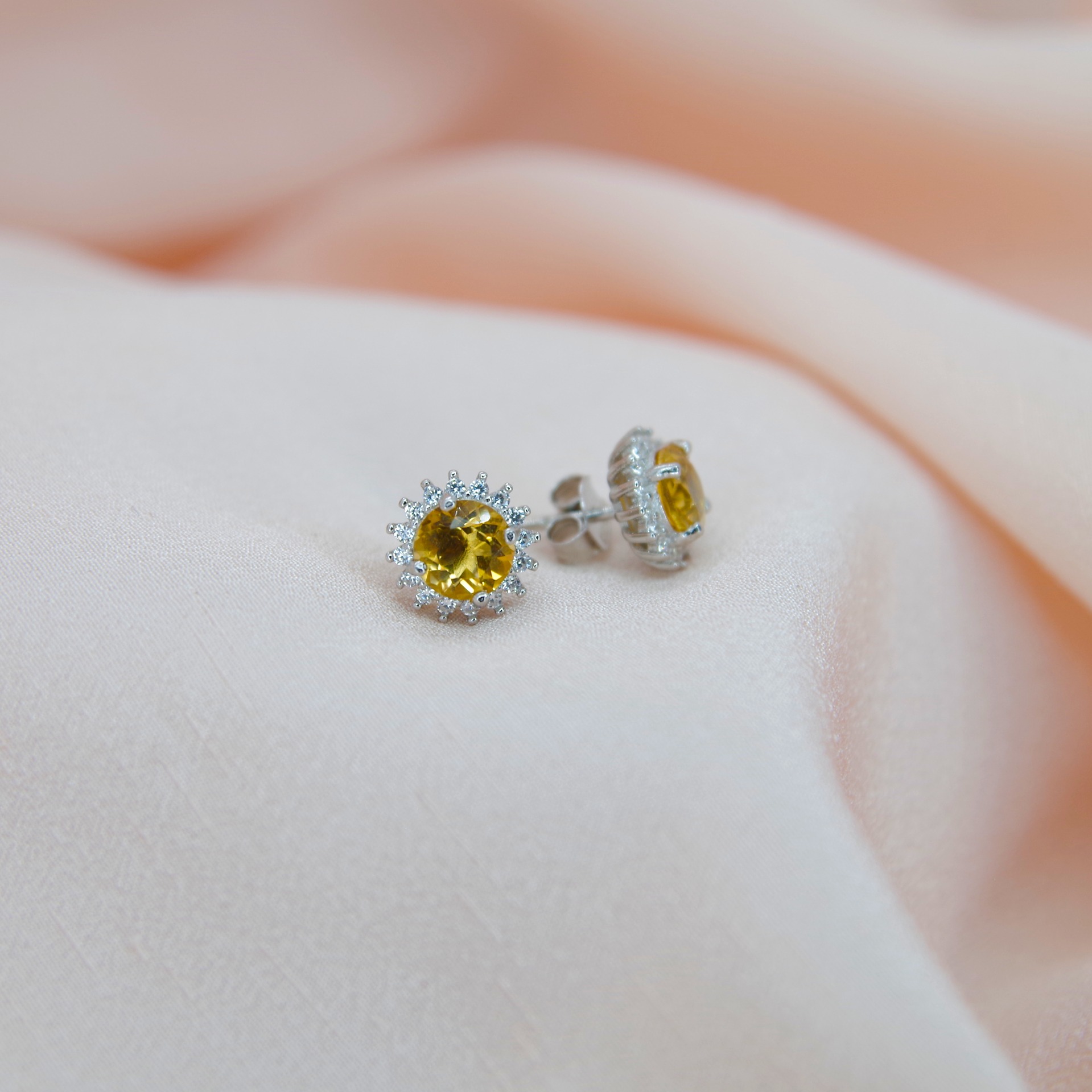 Krásné stříbrné náušnice s přírodními citríny a zirkony, pozlacené 14k bílým zlatem.