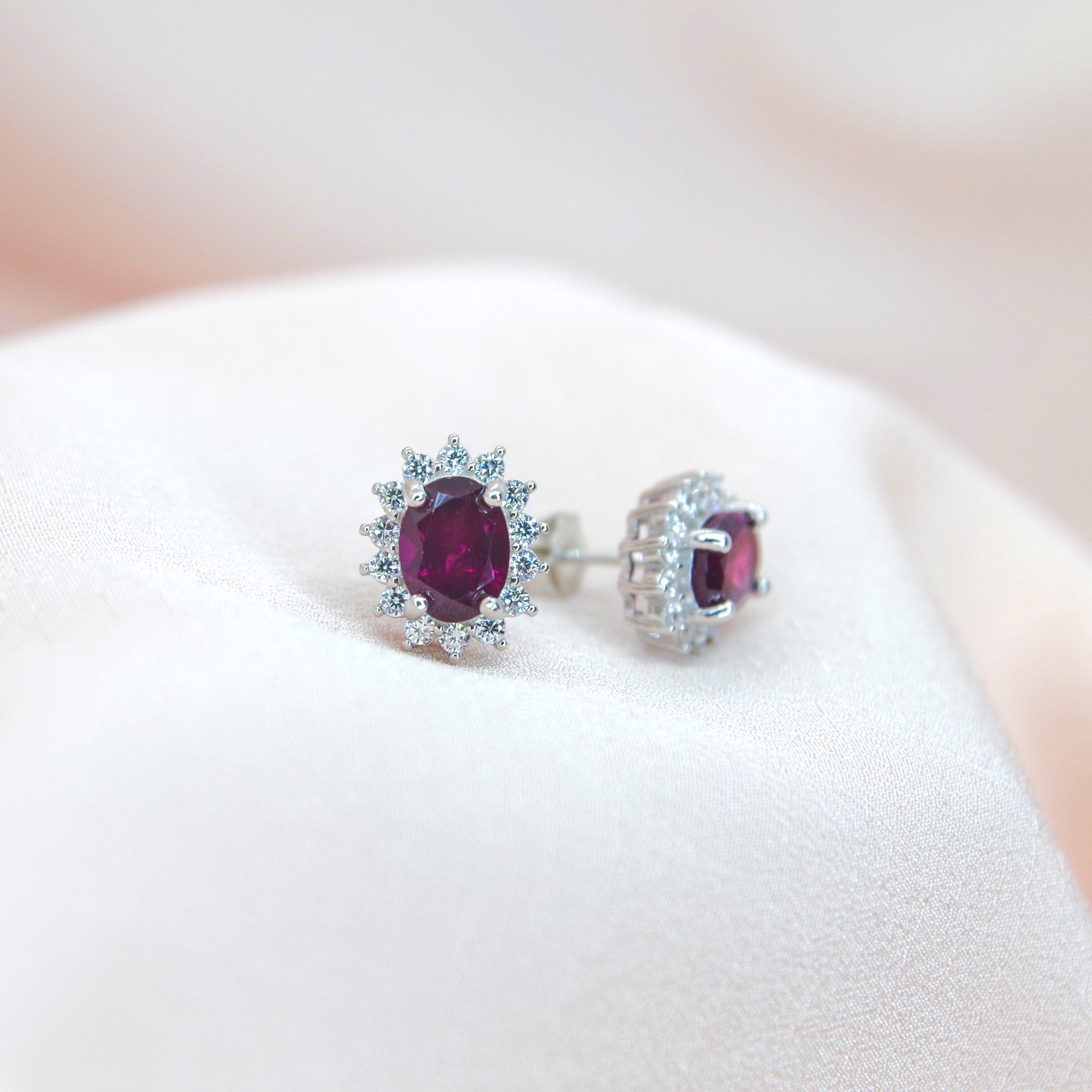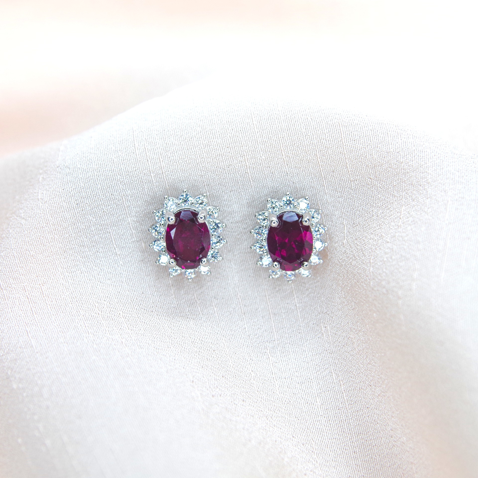 Jemné stříbrné náušnice s pravými rodolit granáty, pozlacené 14k bílým zlatem.