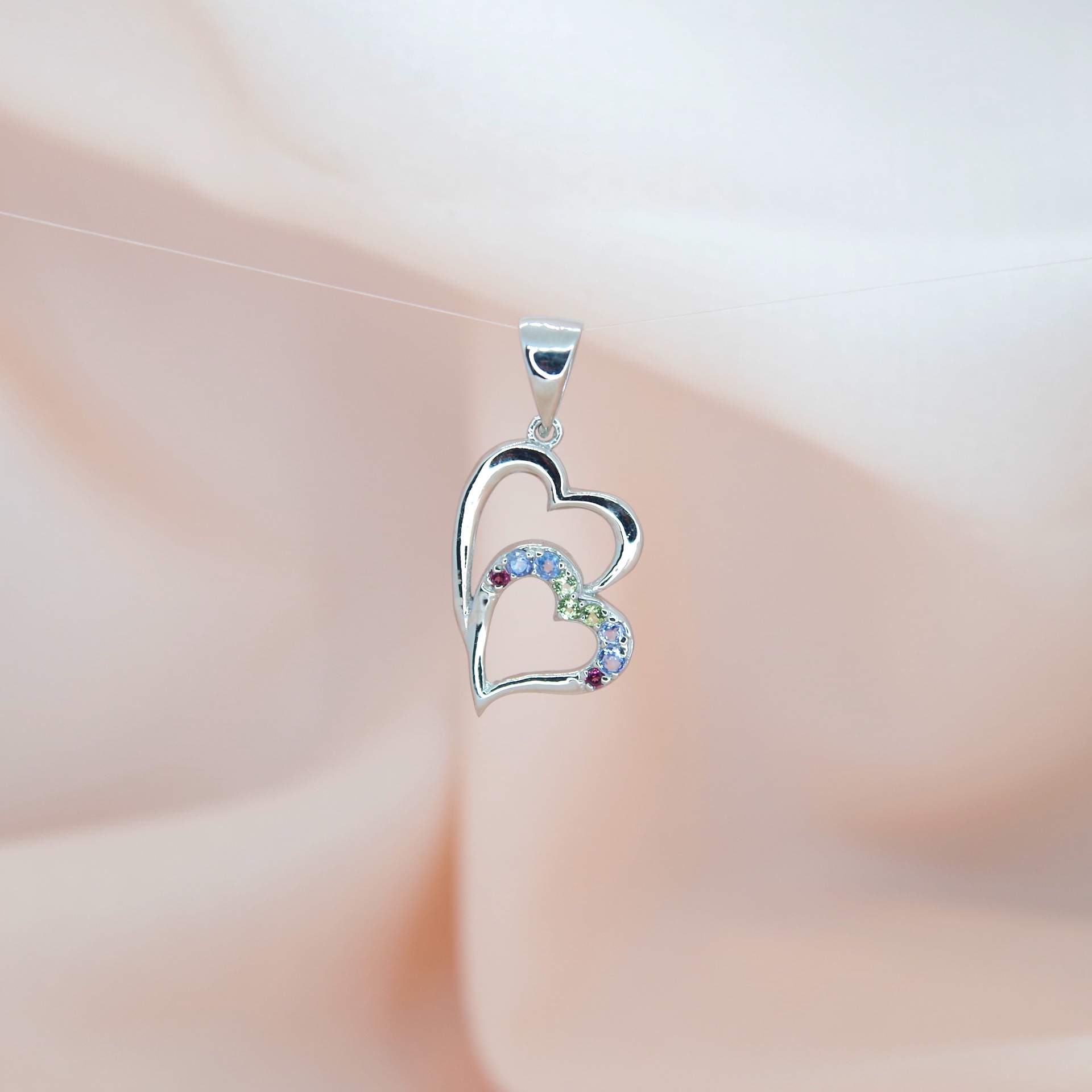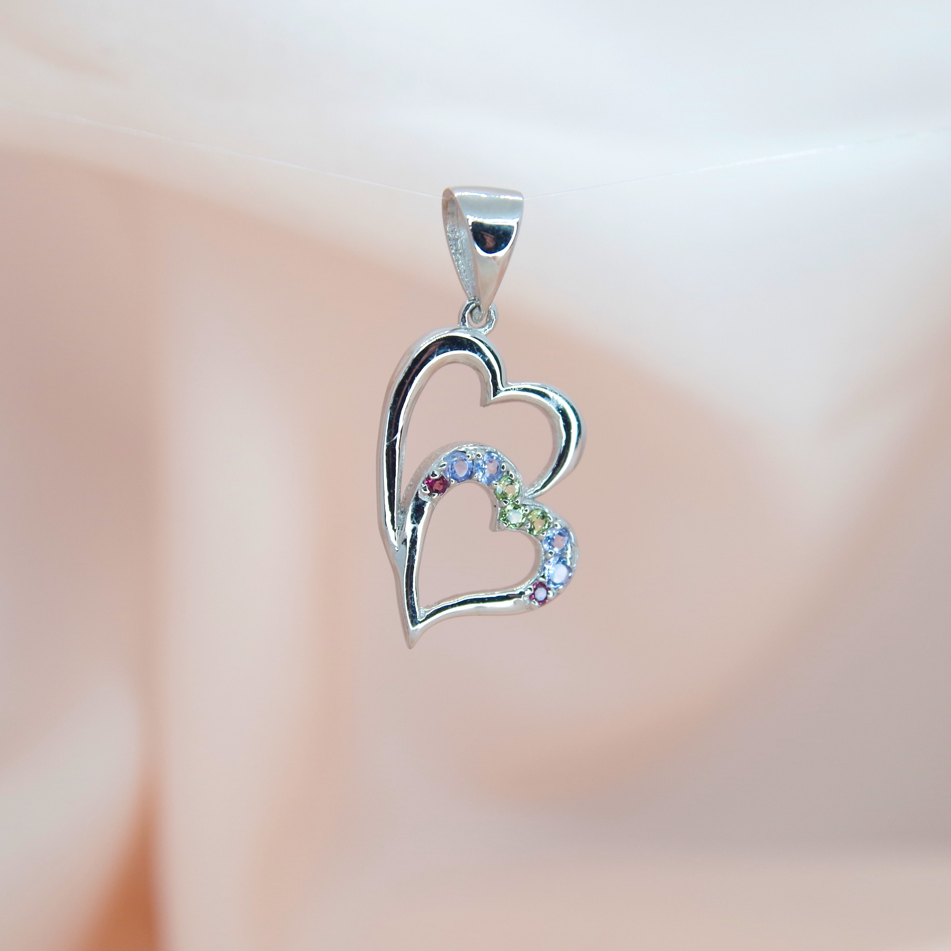 Elegantní stříbrný přívěsek s pravými tanzanity, granáty a olivíny. Pozlacený 14k bílým zlatem.