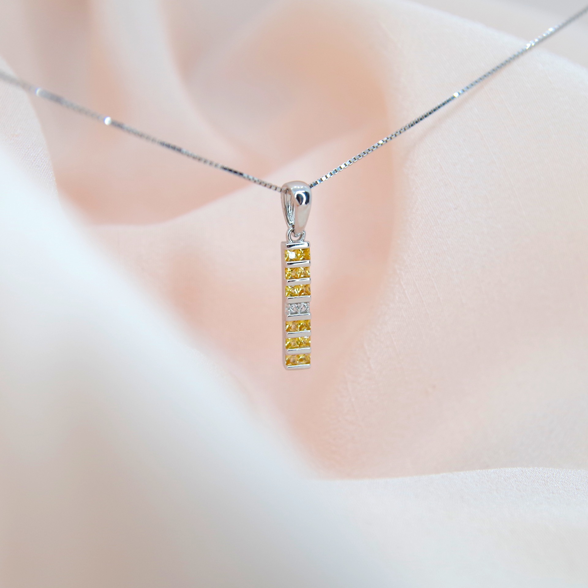 Stříbrný přívěsek s pravým žlutým safírem a řetízkem, pozlaceno 14K bílým zlatem.