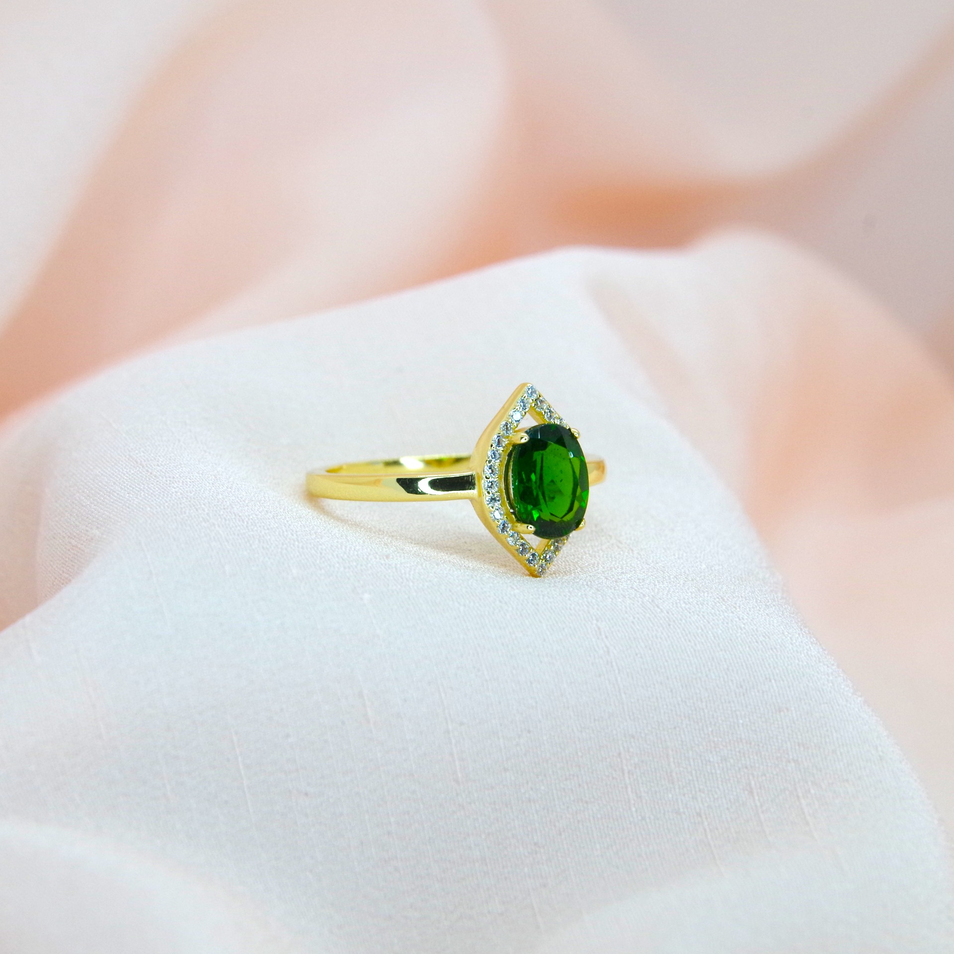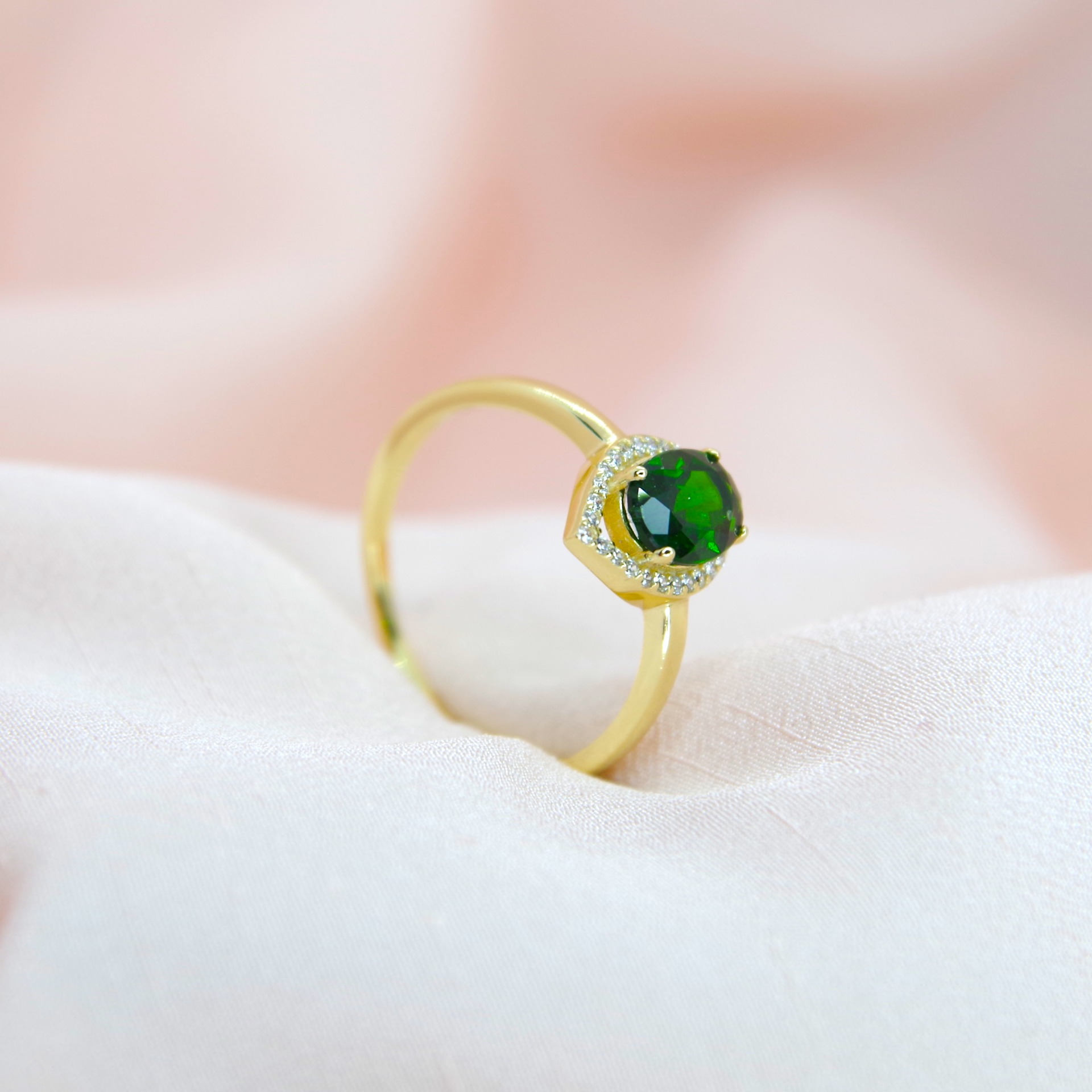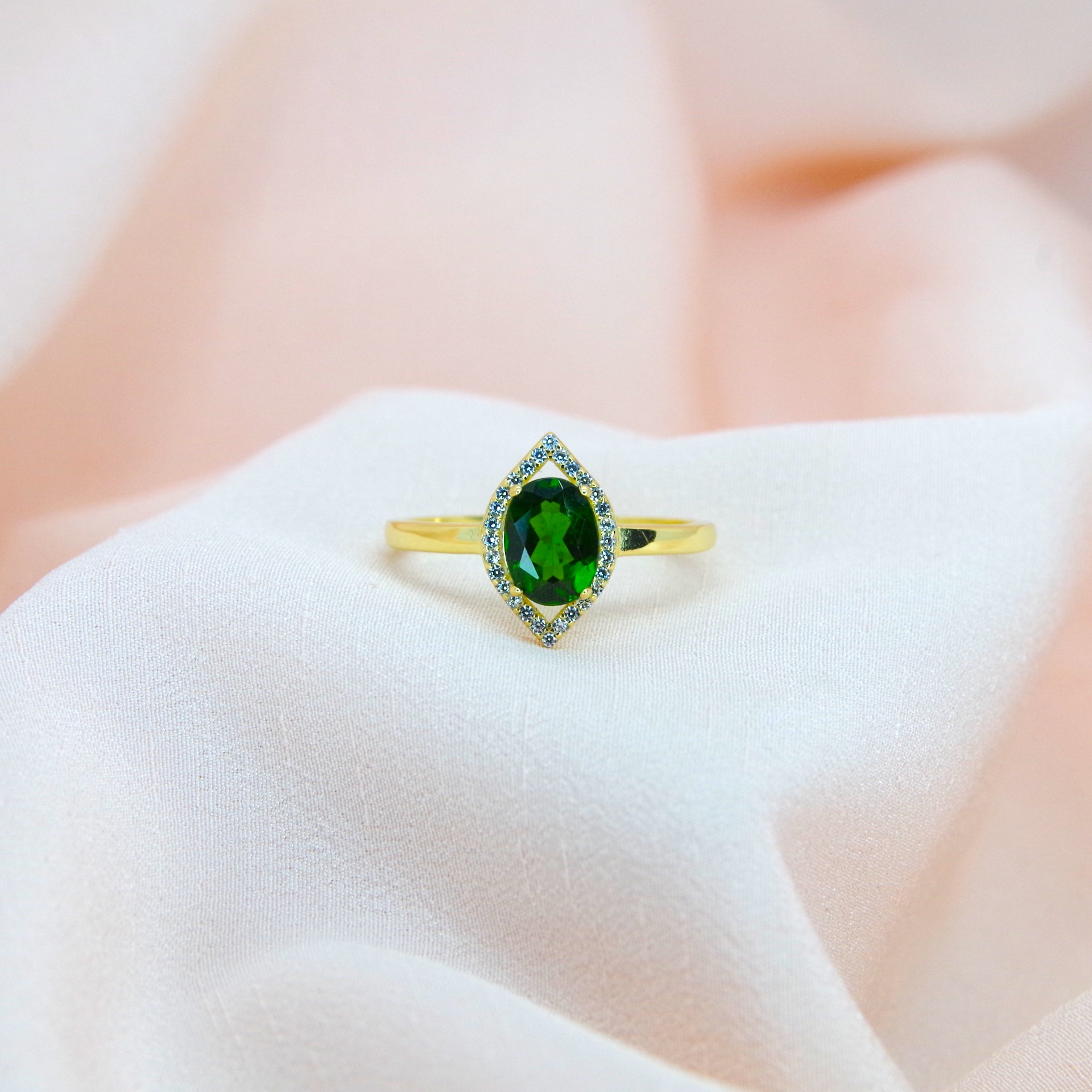 Zářivý stříbrný prsten s přírodním chrom diopsidem, pozlacený 14k zlatem.
