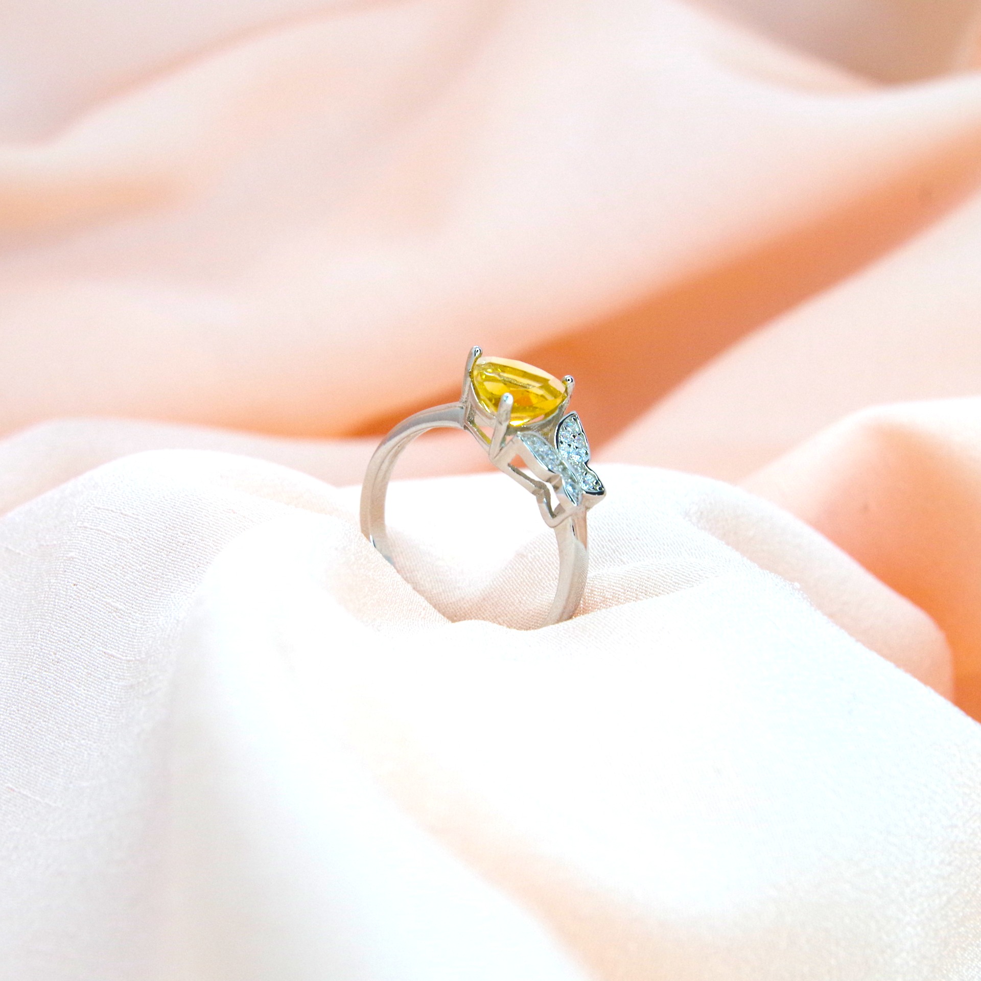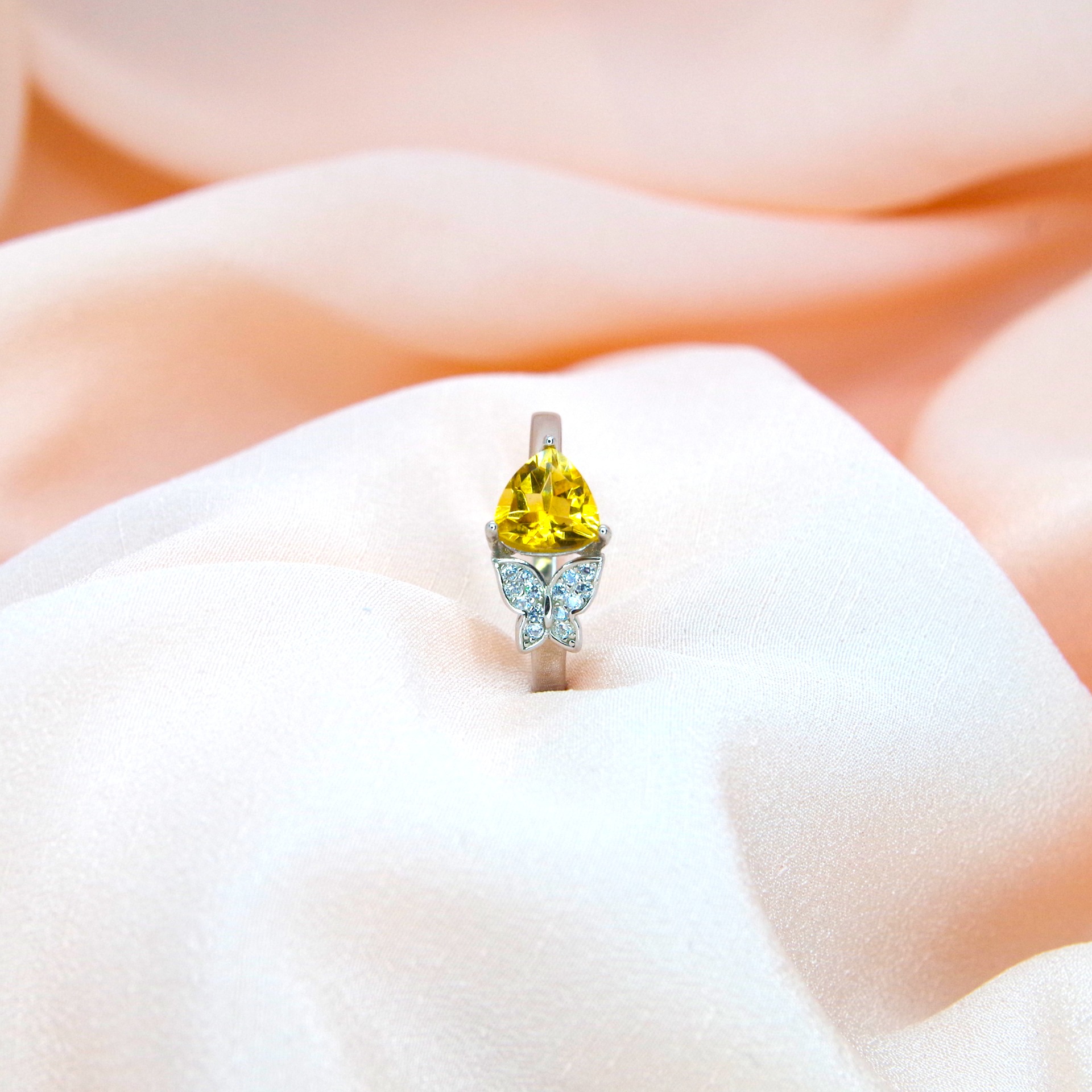Krásný stříbrný prsten s přírodním citrínem a zirkony, ve tvaru motýlka, pozlacený 14k bílým zlatem.