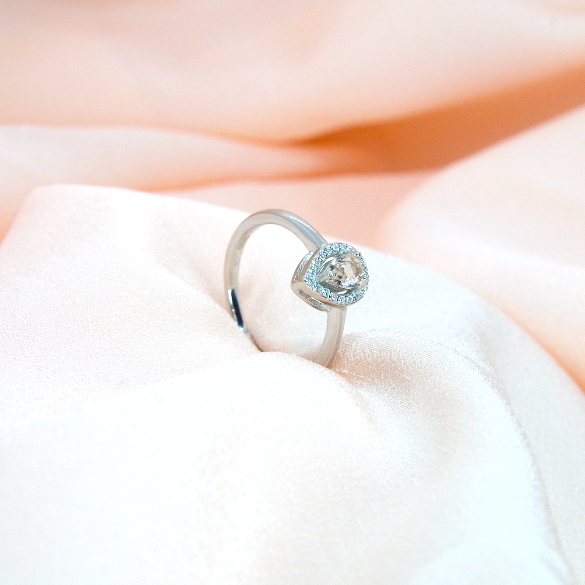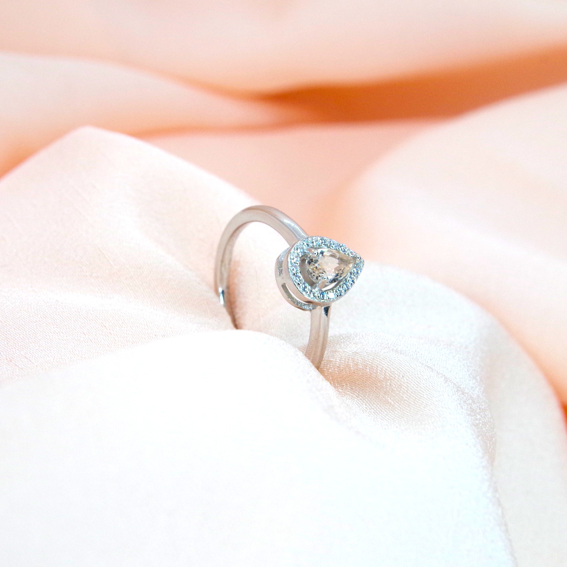 Elegantní stříbrný prsten s přírodním morganitem a zirkony, pozlacený 14k bílým zlatem.