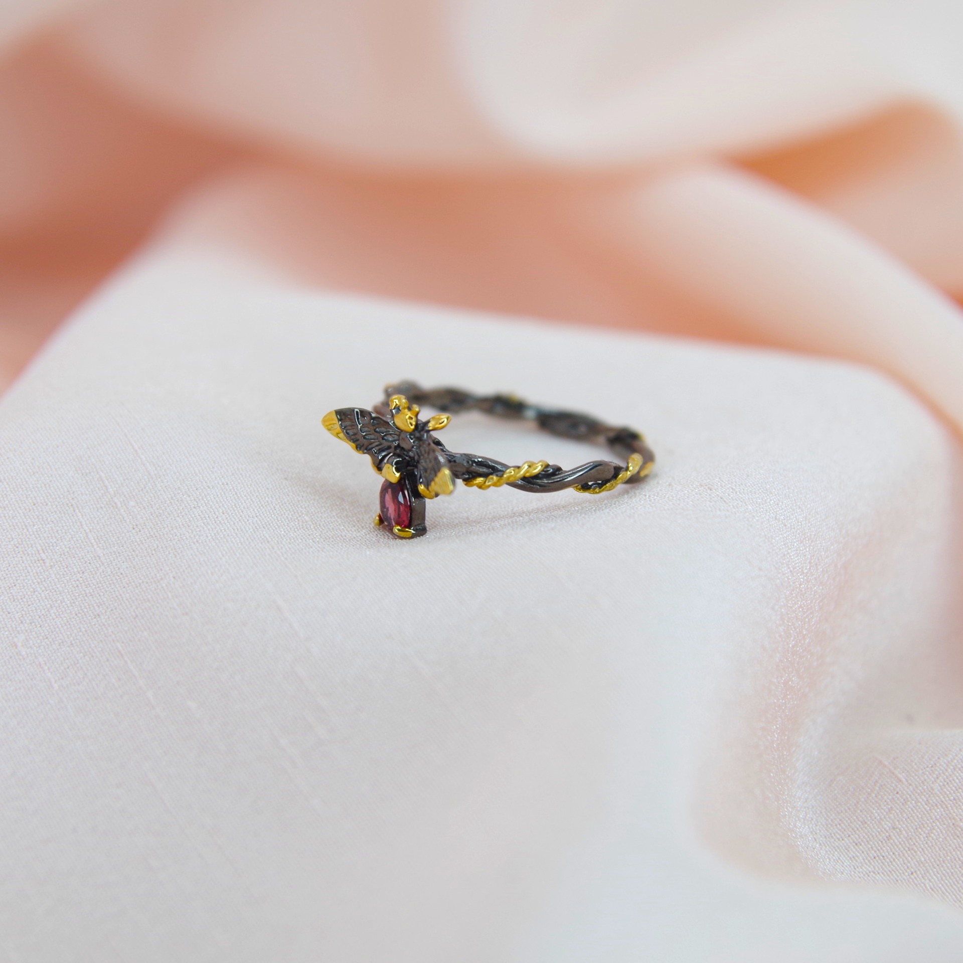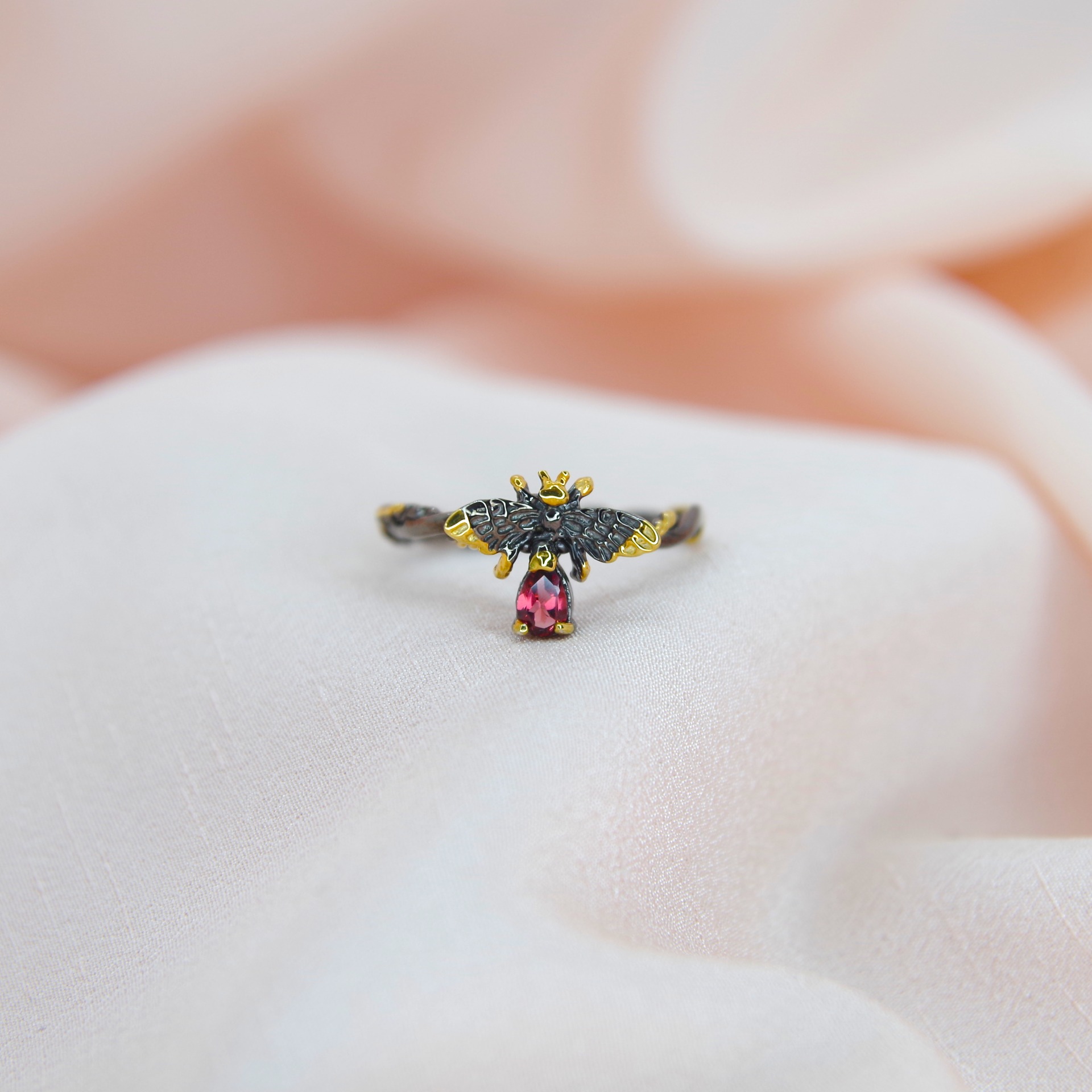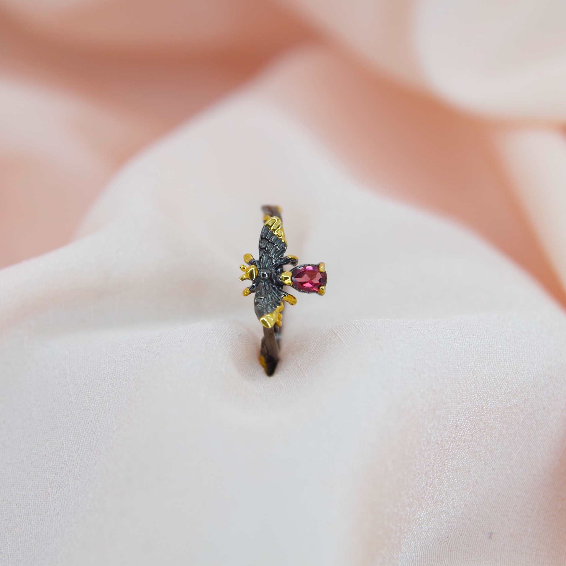 Řemeslně zpracovaný stříbrný prsten ve tvaru včely s přírodním granátem povrchová úprava 14k zlatem a rhodiem.