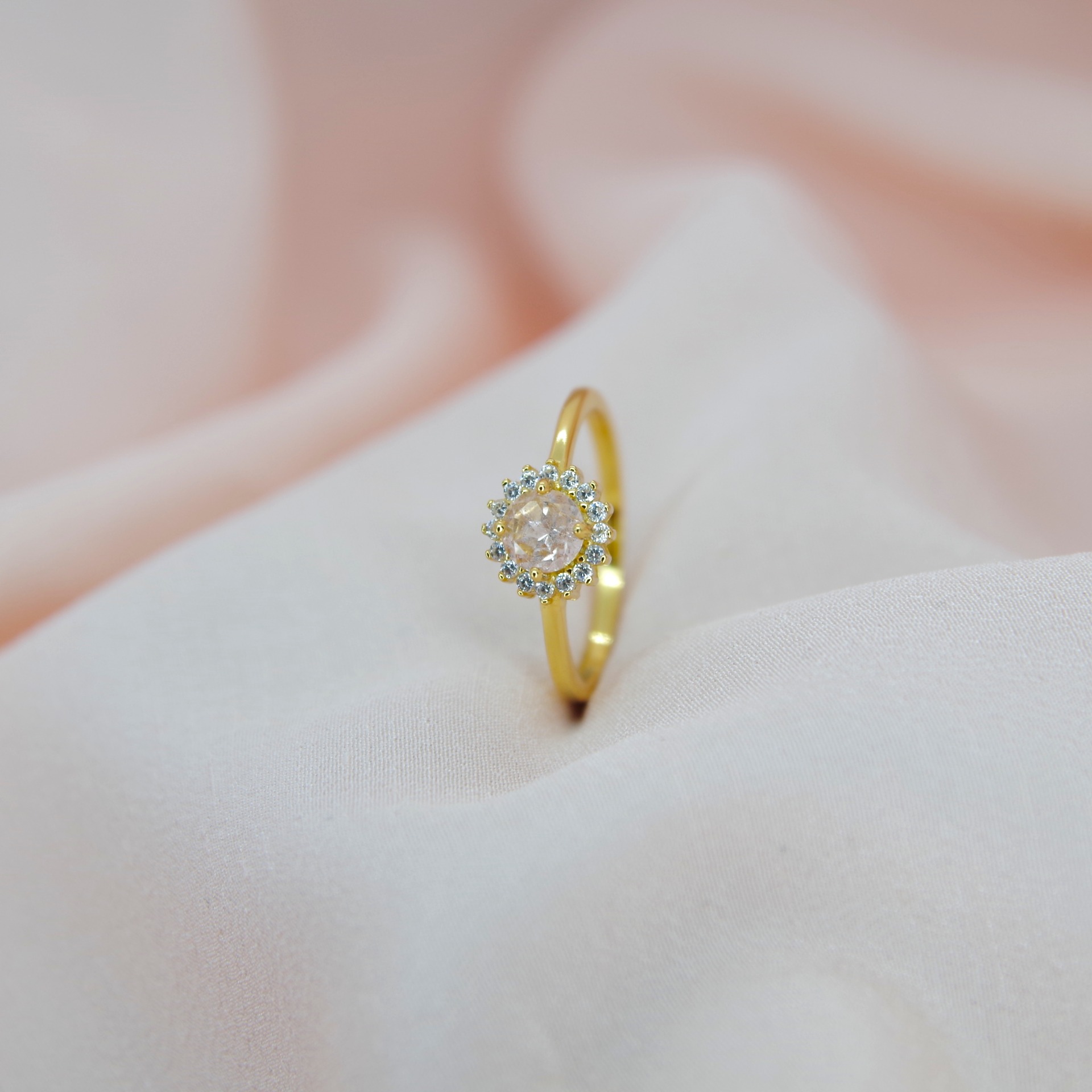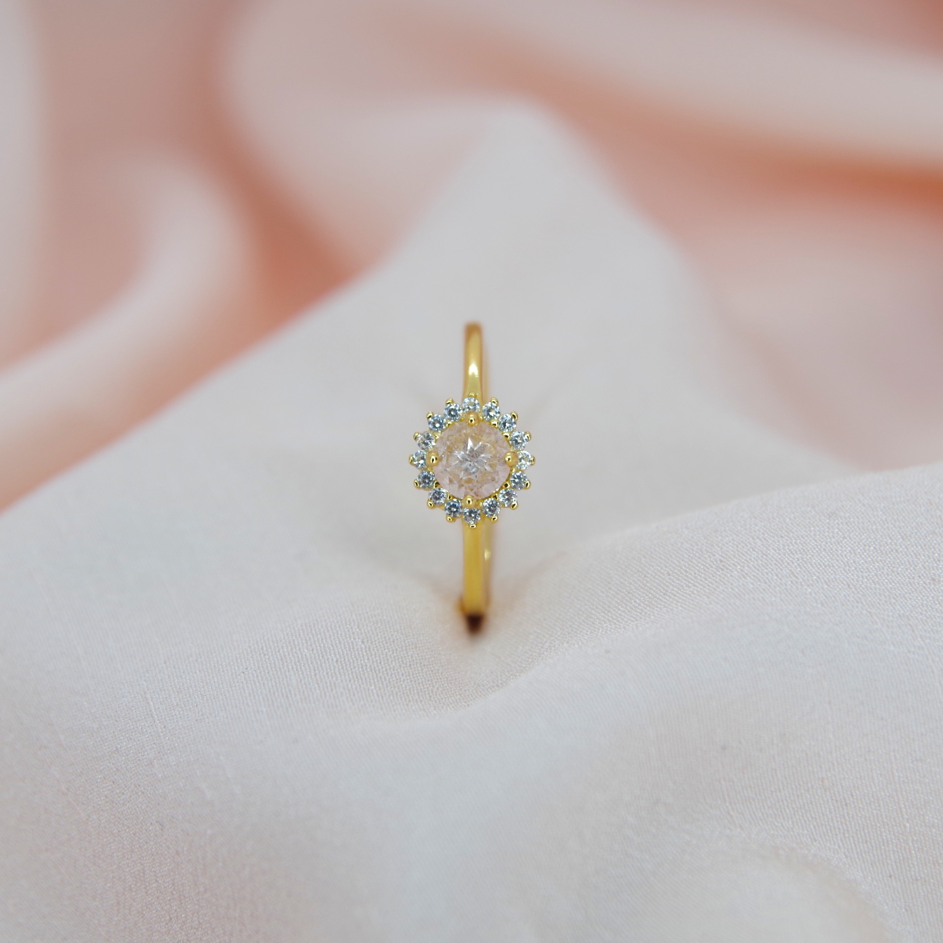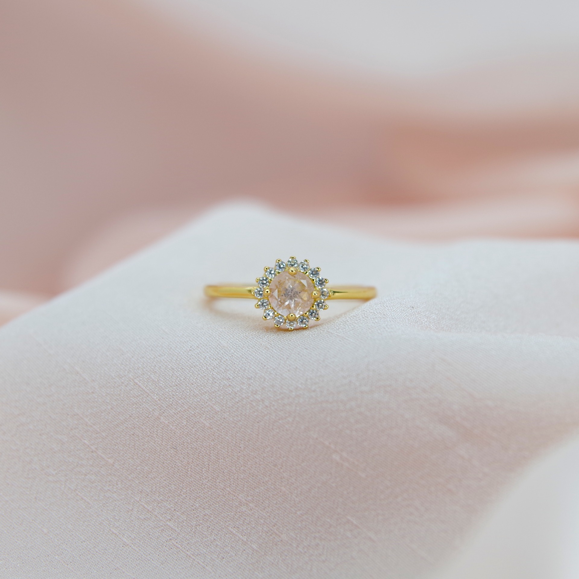 Jemný stříbrný prsten s přírodním morganitem a zirkony, pozlacený 14k zlatem.