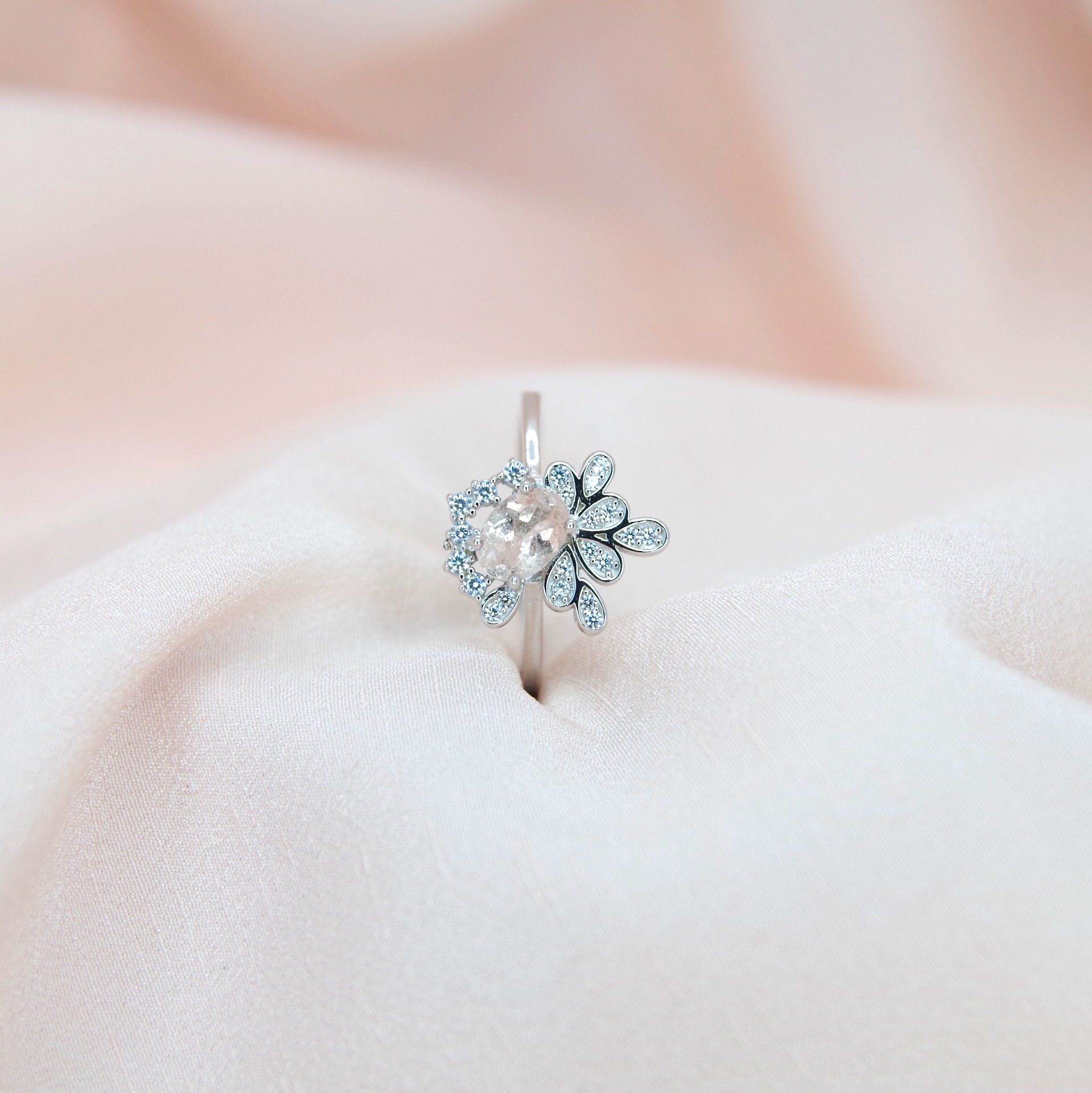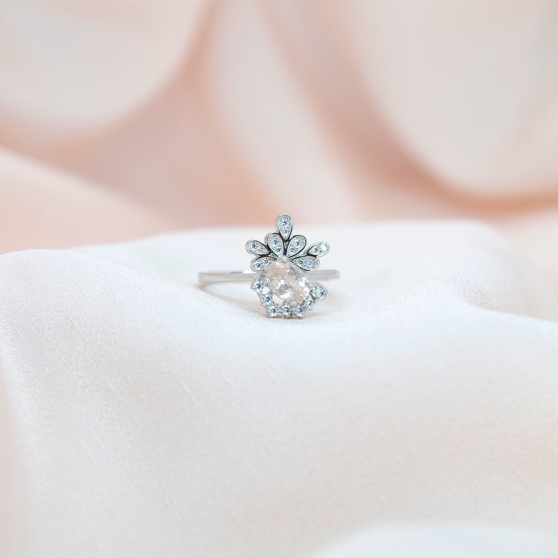 Elegantní stříbrný prsten s přírodním morganitem a zirkony, pozlacený 14k bílým zlatem.