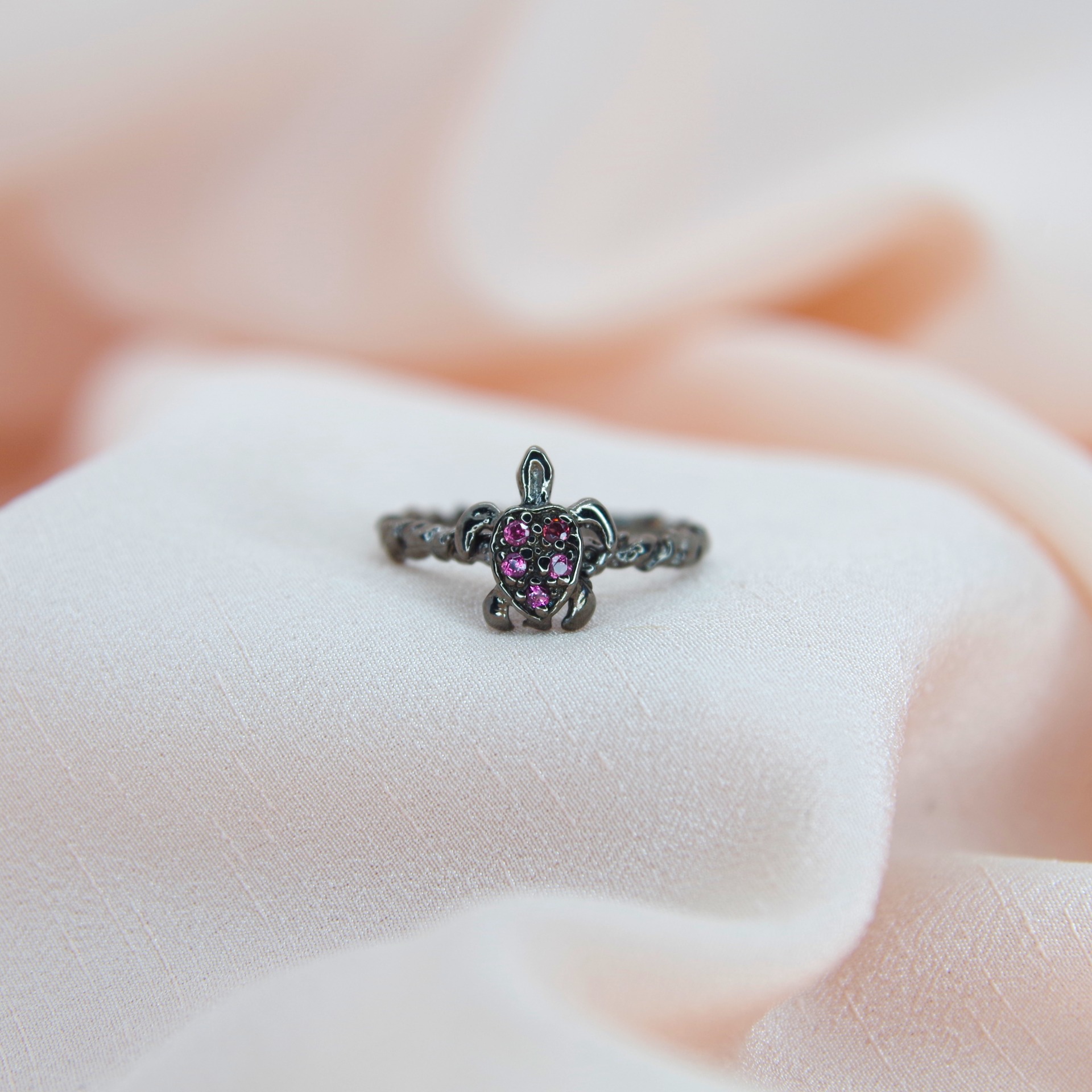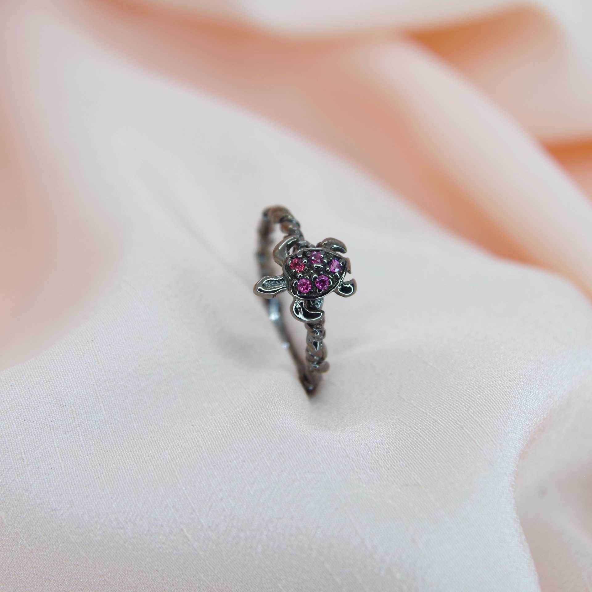 Řemeslně zpracovaný stříbrný prsten s přírodními granáty ve tvaru želvičky, povrchová úprava rhodiem.