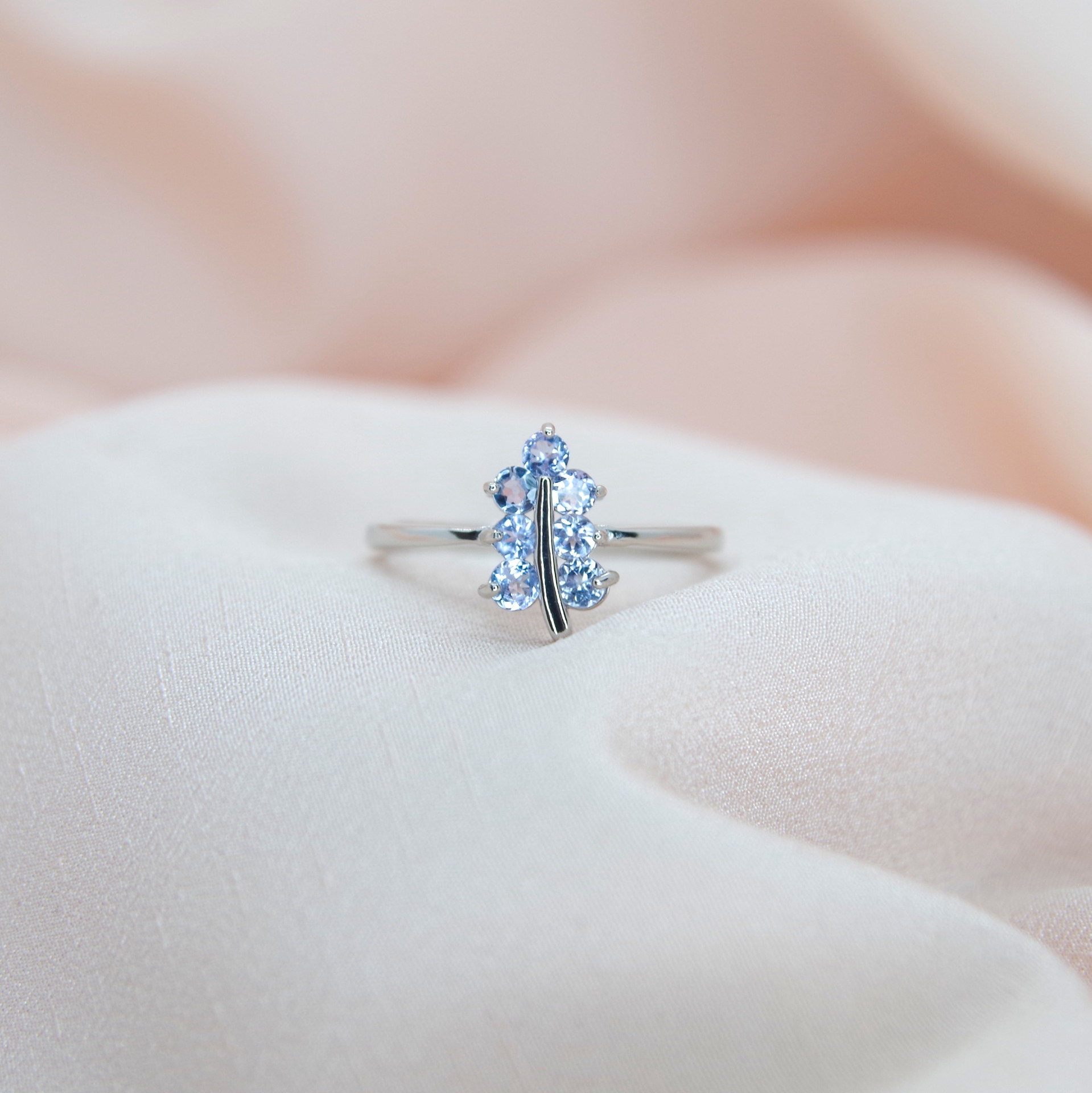 Jemný stříbrný prsten s přírodním tanzanitem, ve tvaru hroznového vína, pozlacený 14k bílým zlatem.