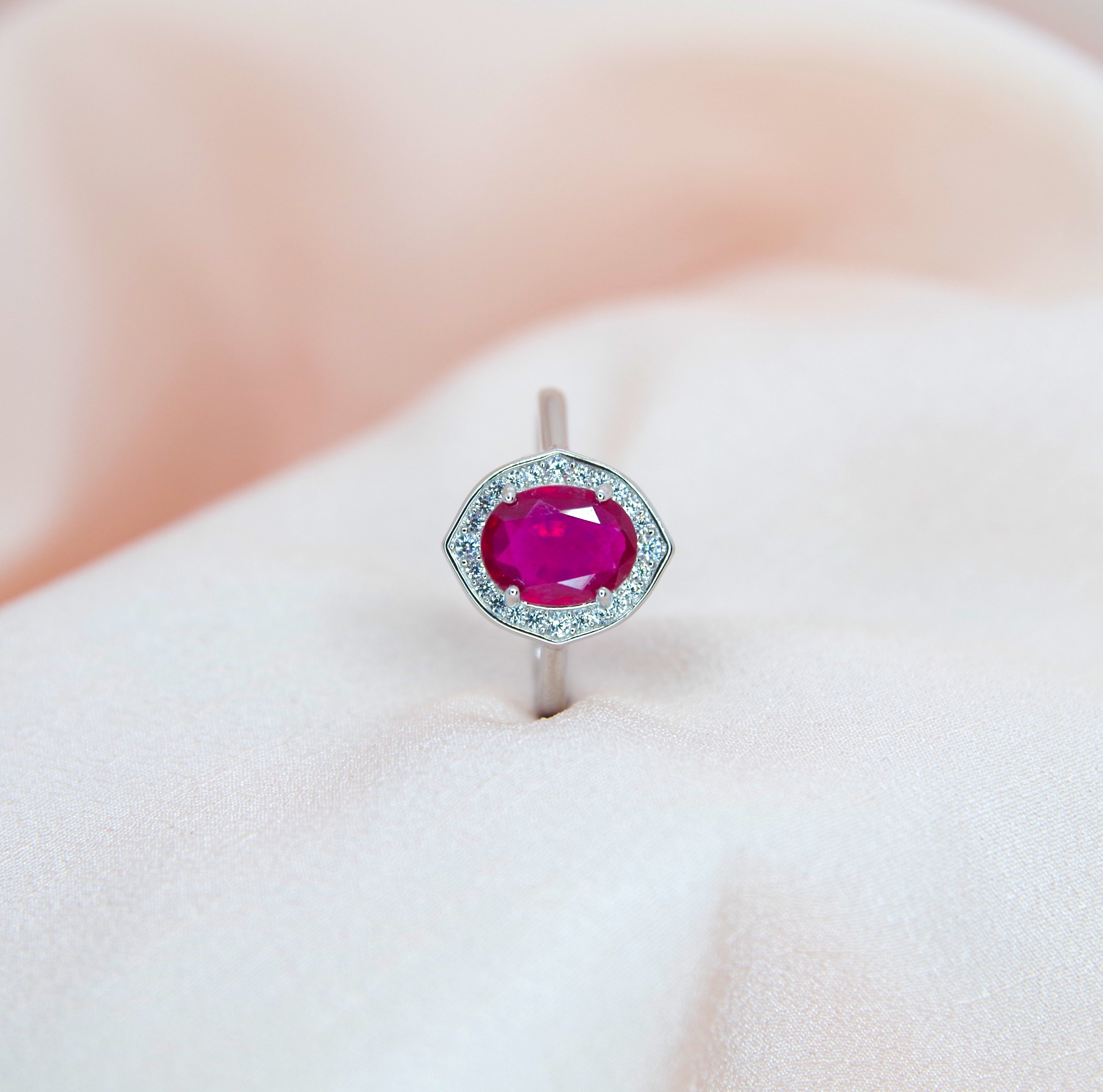 Krásný stříbrný prsten s přírodním rubínem, pozlacený 14k bílým zlatem.