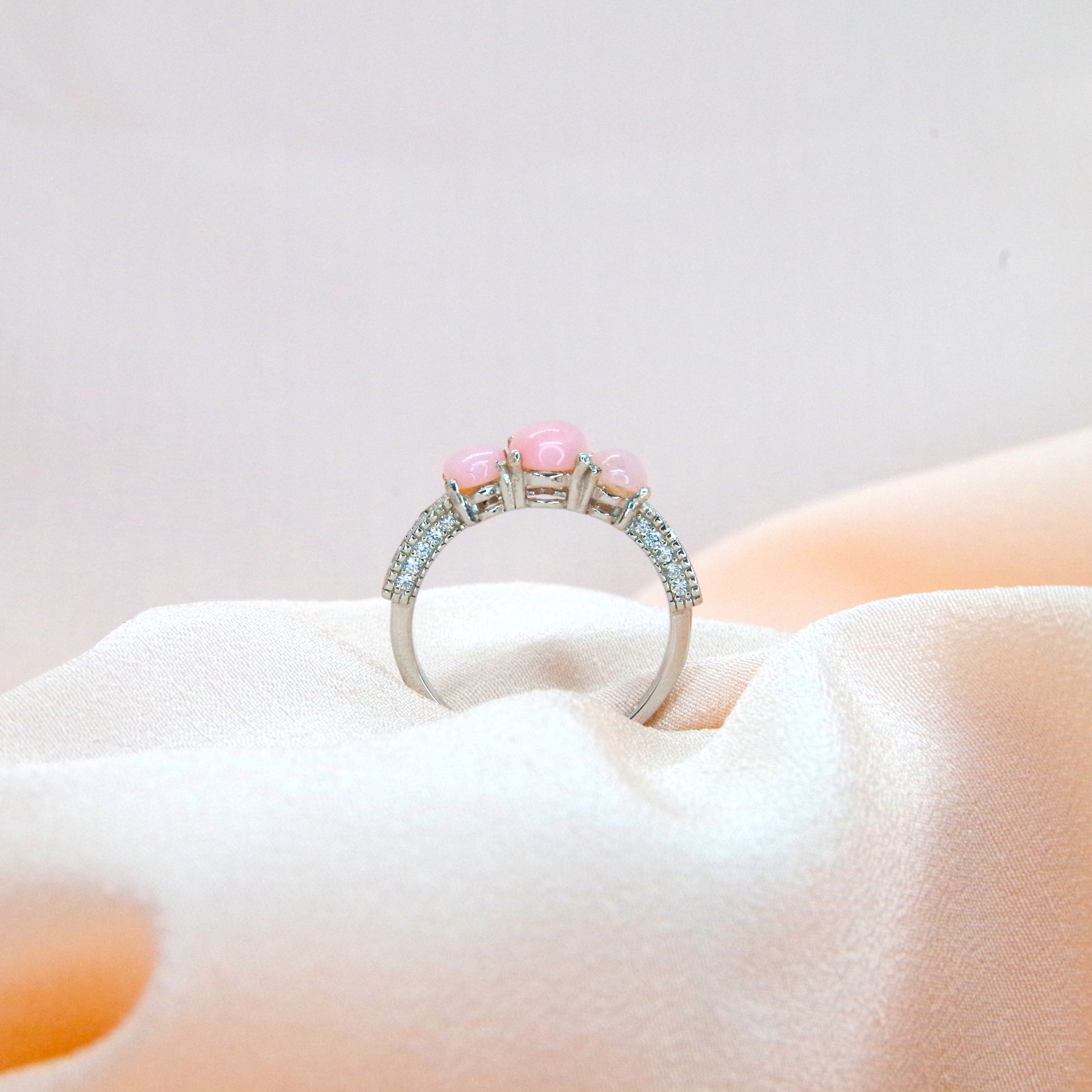 Elegantní stříbrný prsten s přírodním růžovým opálem a třpytivými zirkony