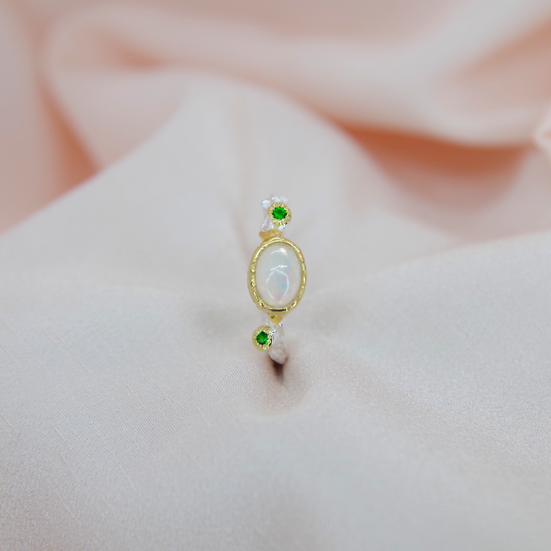 Řemeslně zpracovaný stříbrný prsten s přírodním opálem a chromdiopsidem, pozlacený 14k zlatem. Jedinečný kus.