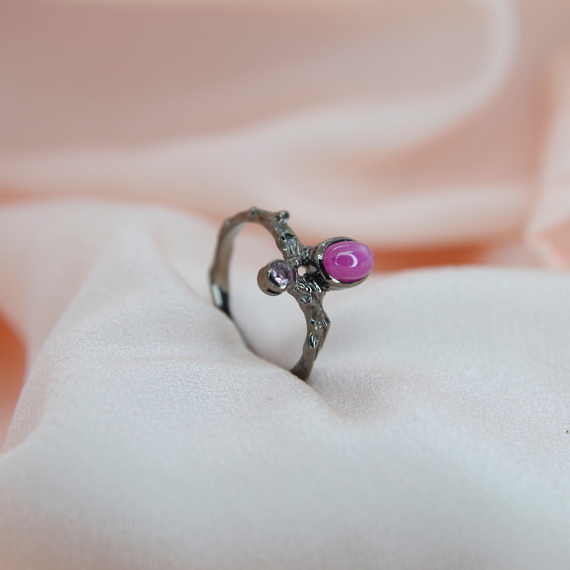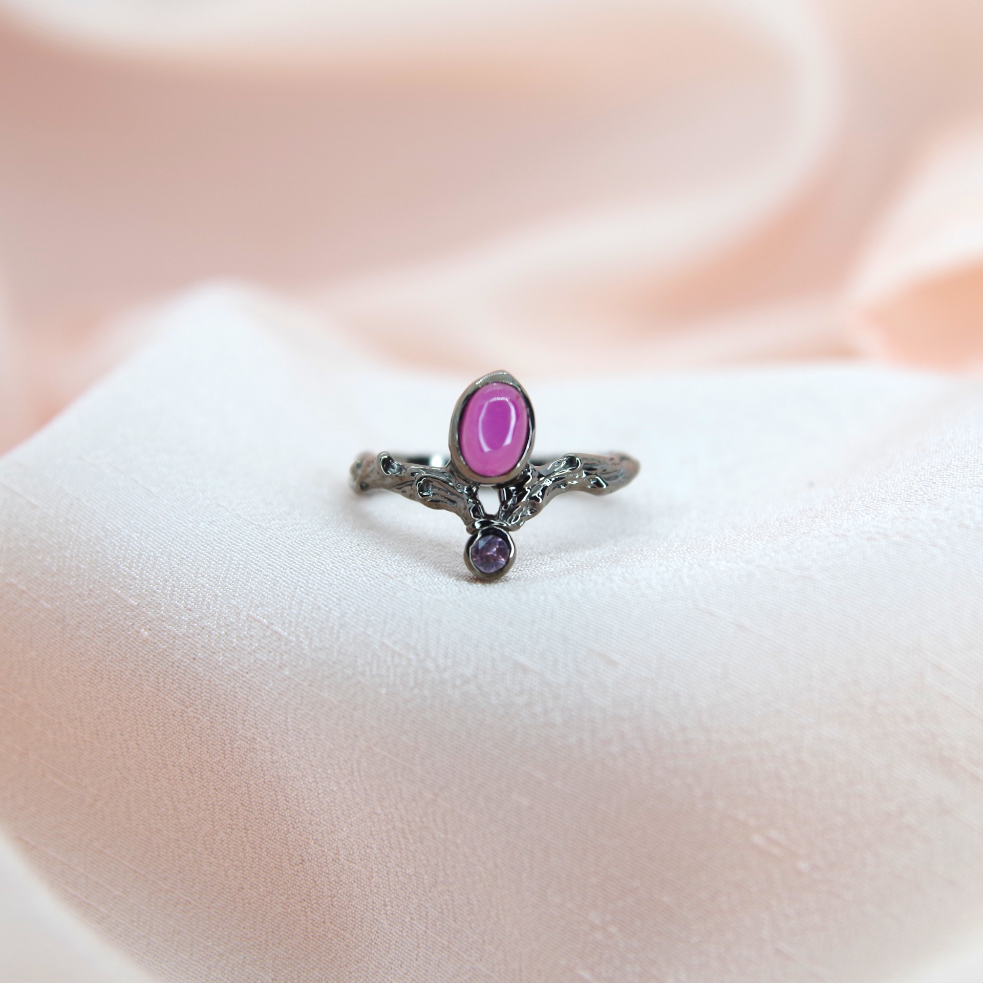 Řemeslně zpracovaný stříbrný prsten s přírodním rubínem, povrchová úprava rhodium. Jedinečný kus.