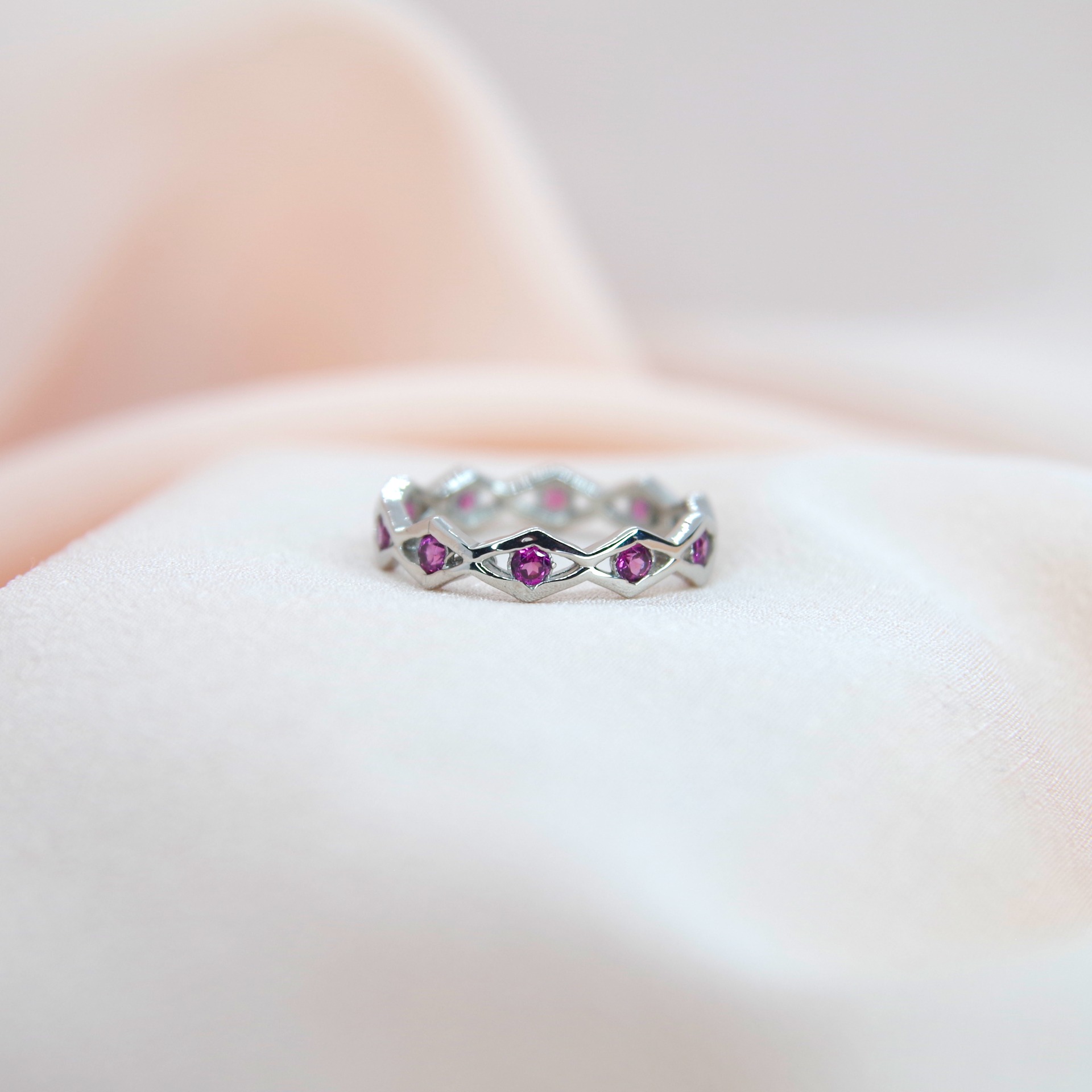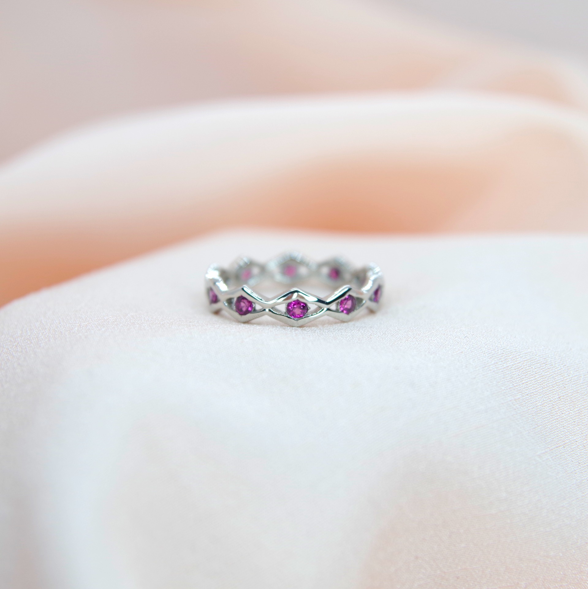 Stylový stříbrný prsten s přírodními granáty, pozlacený 14k bílým zlatem.