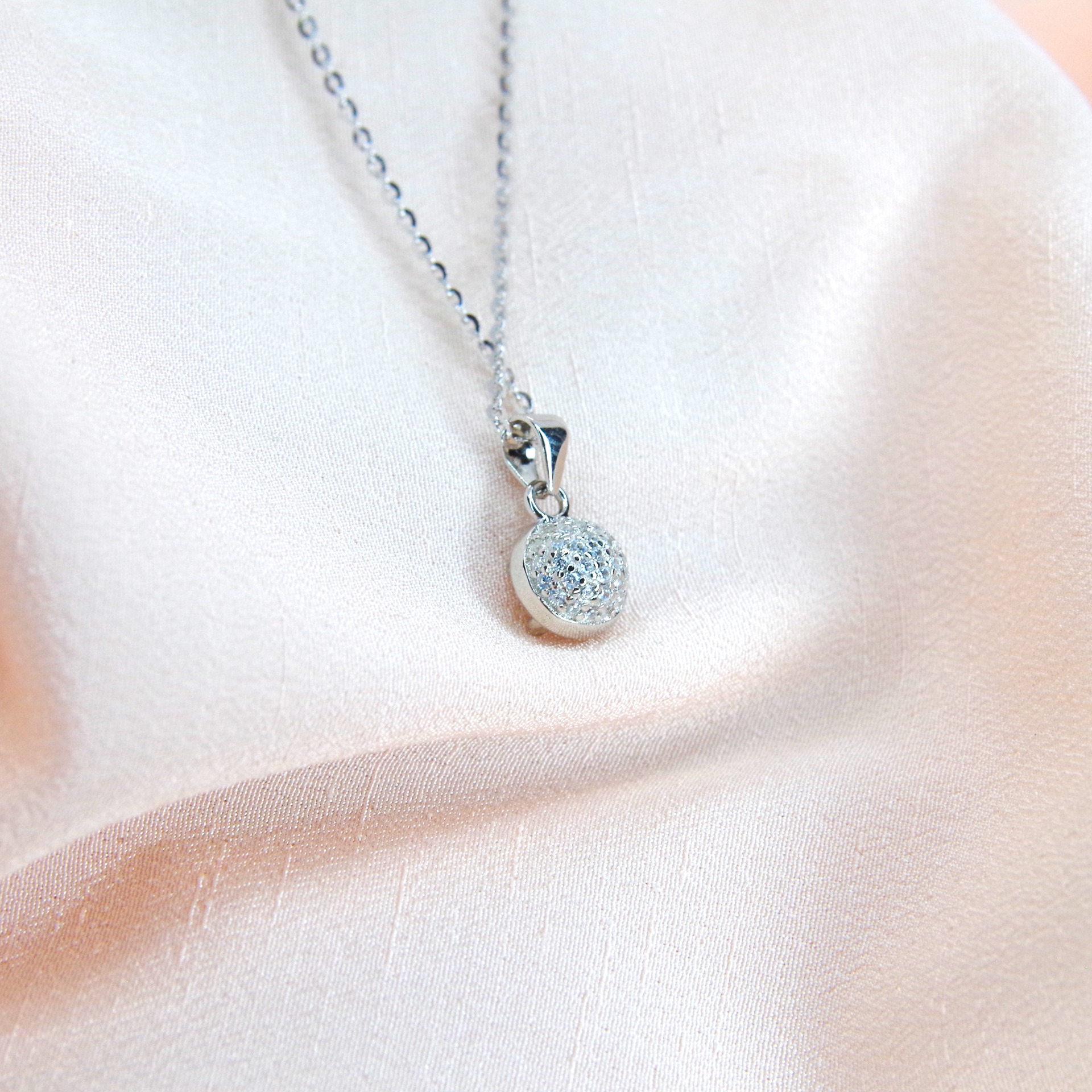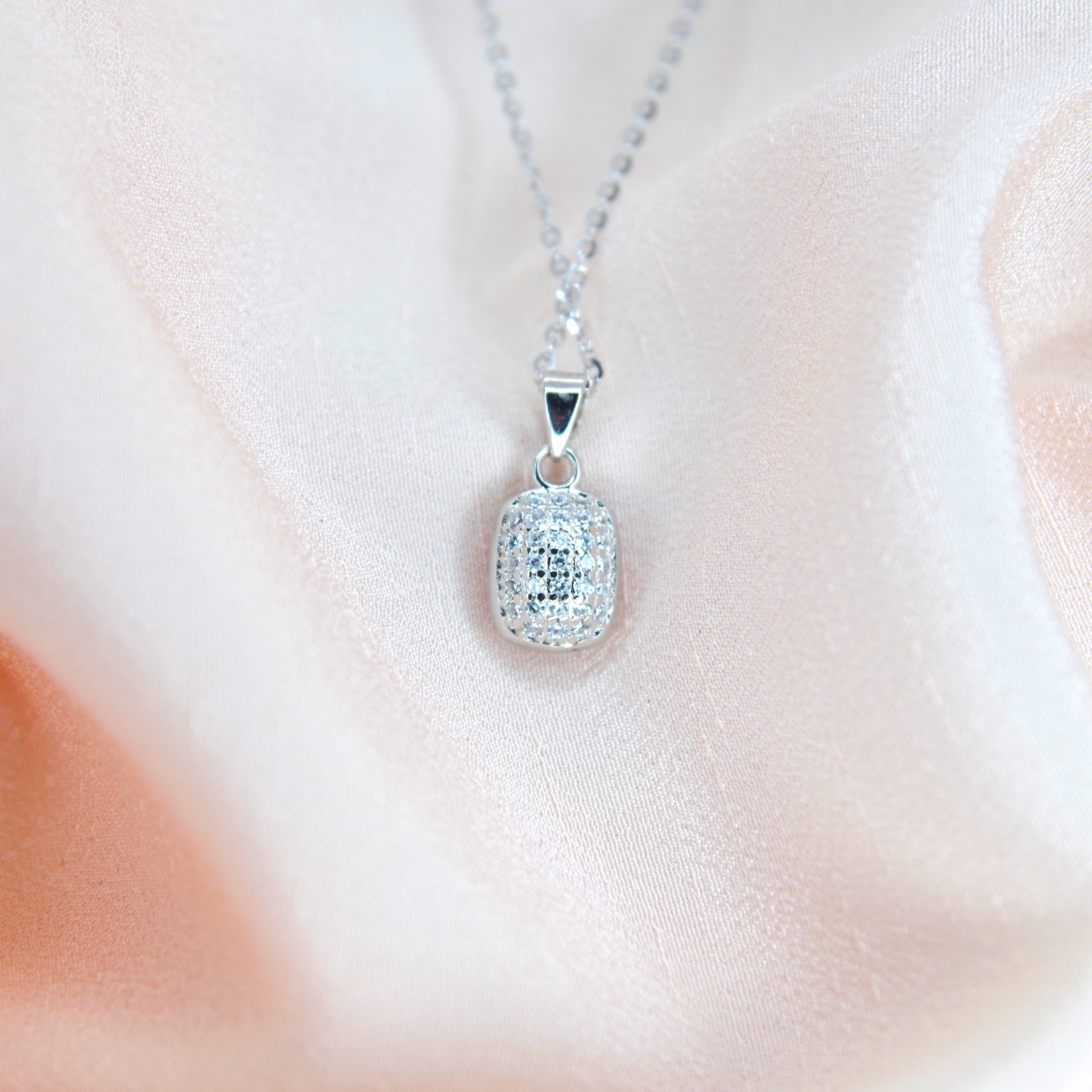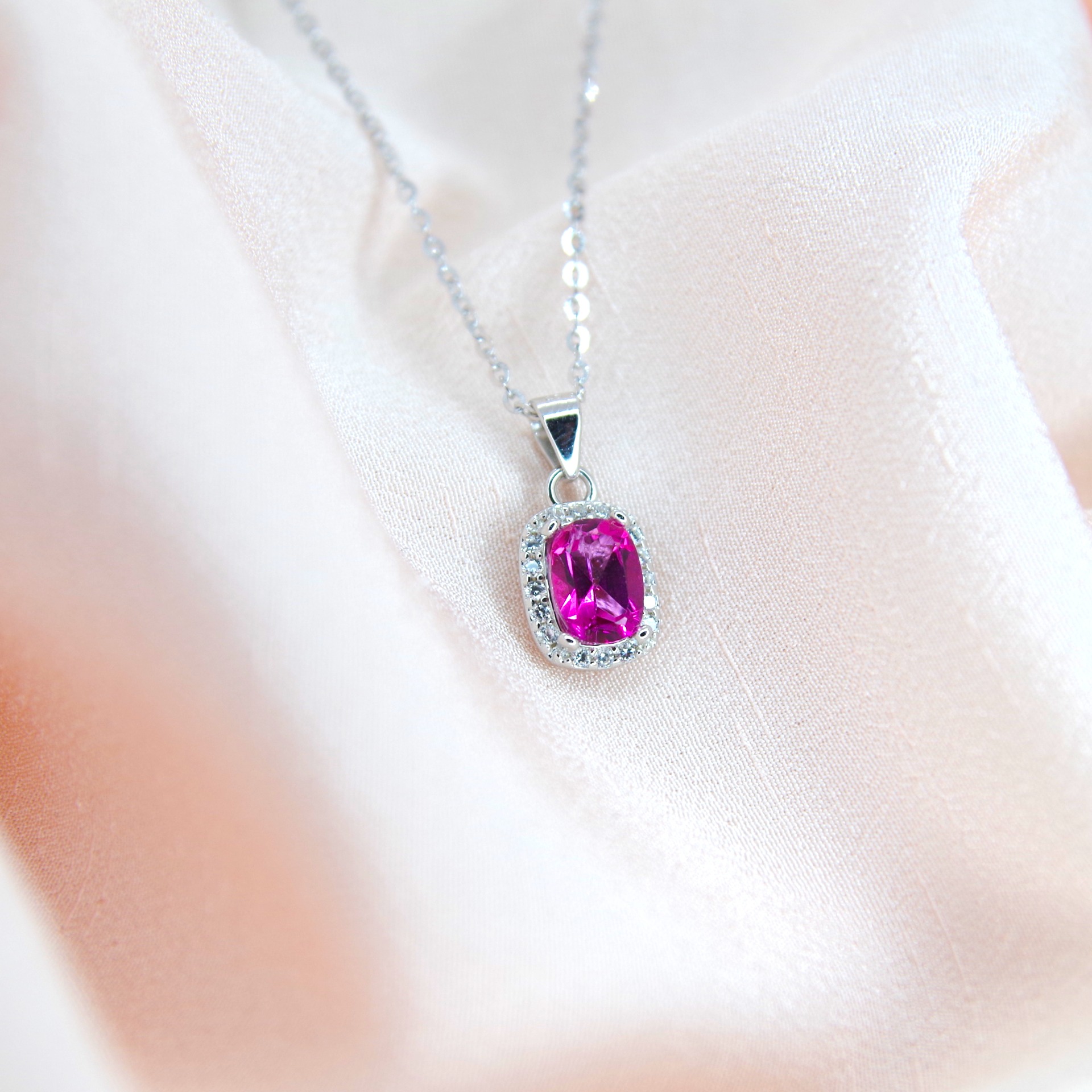 Zářivý stříbrný přívěsek s přírodním růžovým topazem, osazen zirkony i ze zadní strany přívěsku. Pozlacený 14k bílým zlatem.