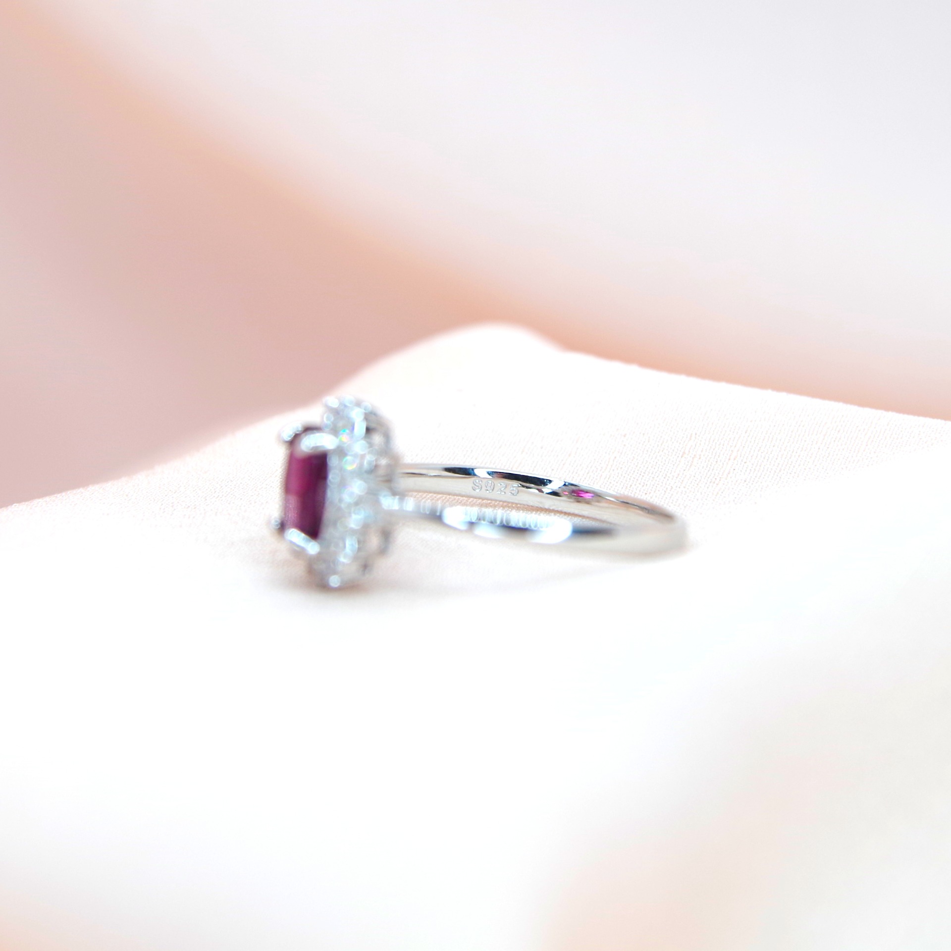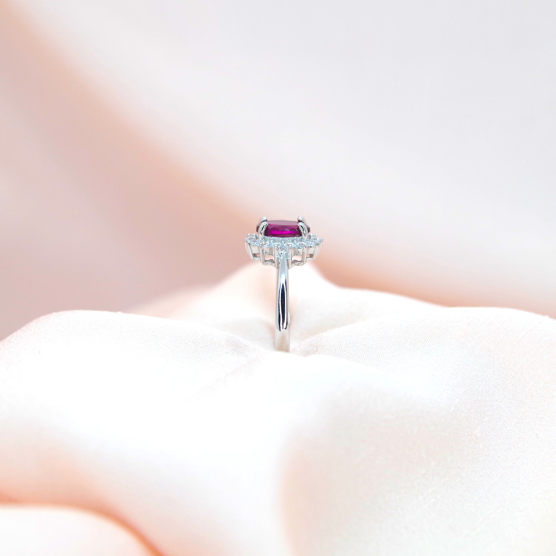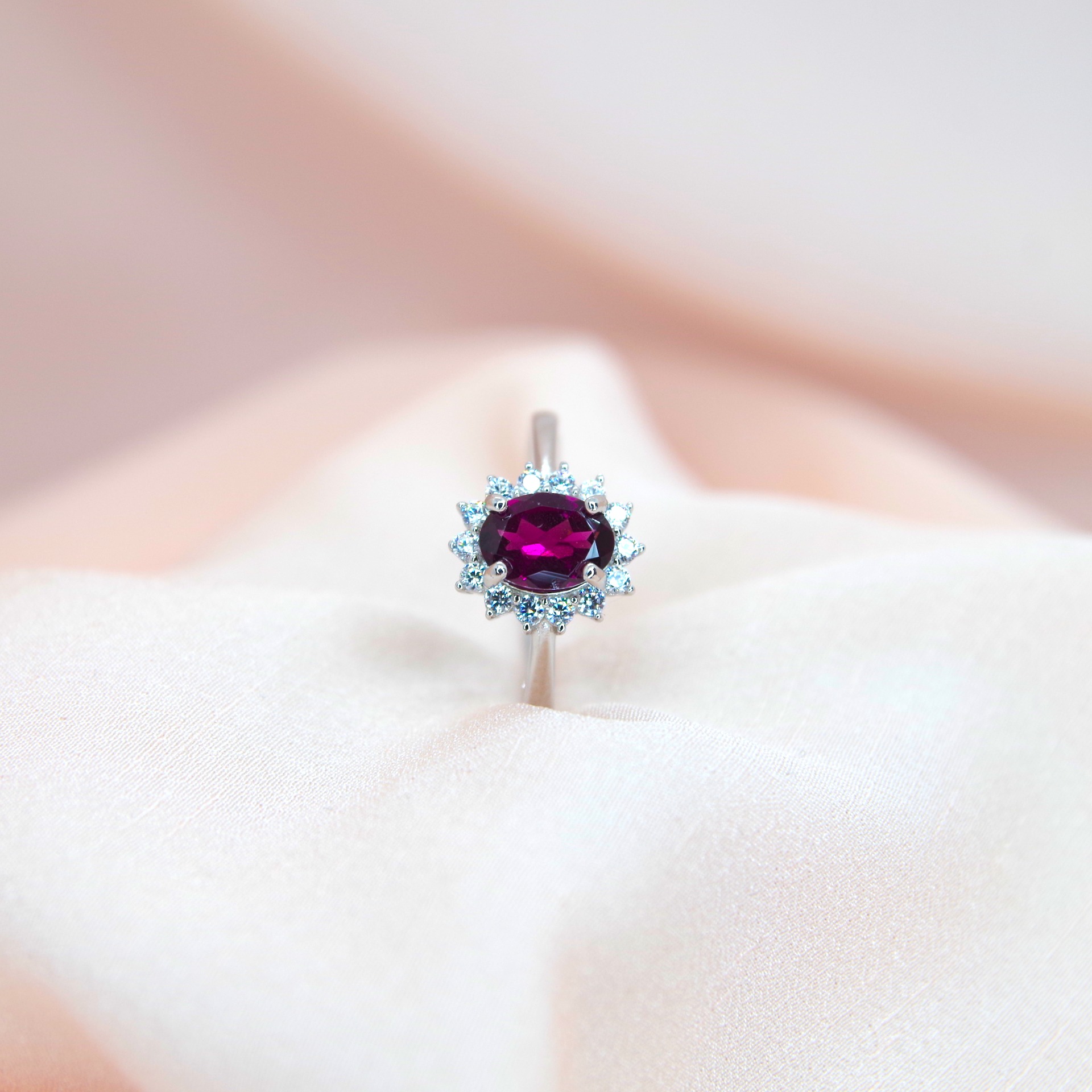 Zářivý stříbrný prsten s přírodním granátem a zirkony, pozlacený 14k bílým zlatem.