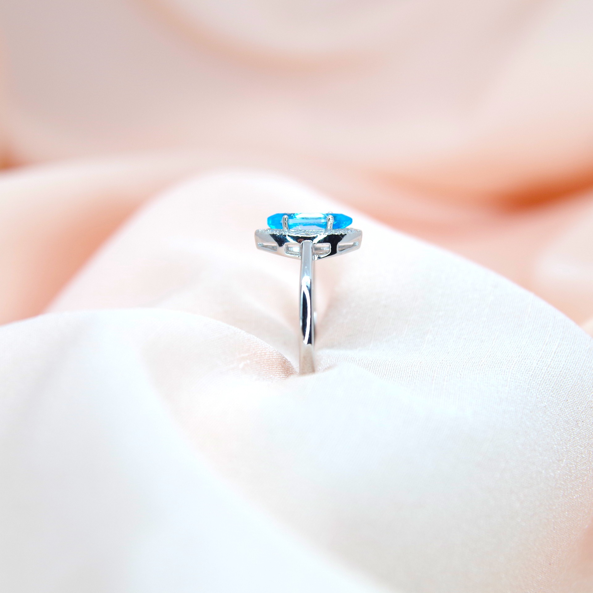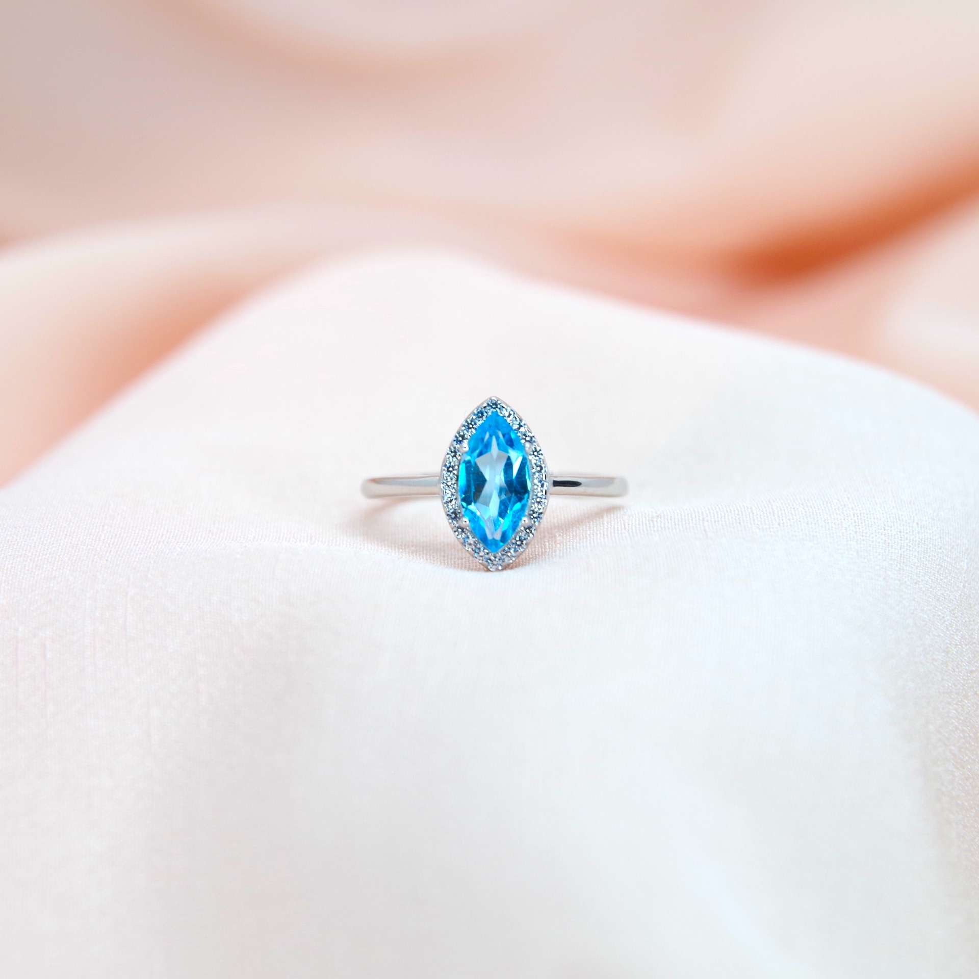 Stříbrný prsten s přírodním modrým topazem, pozlacený 14k bílým zlatem.