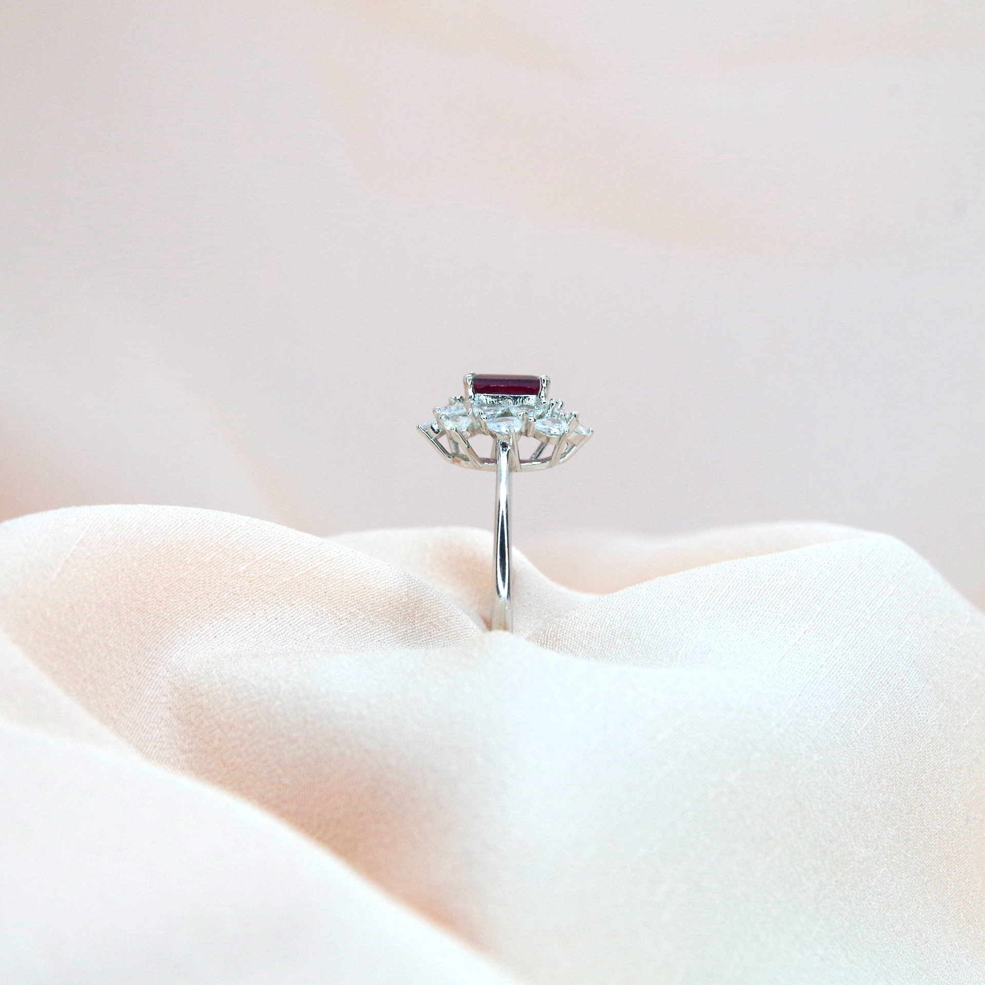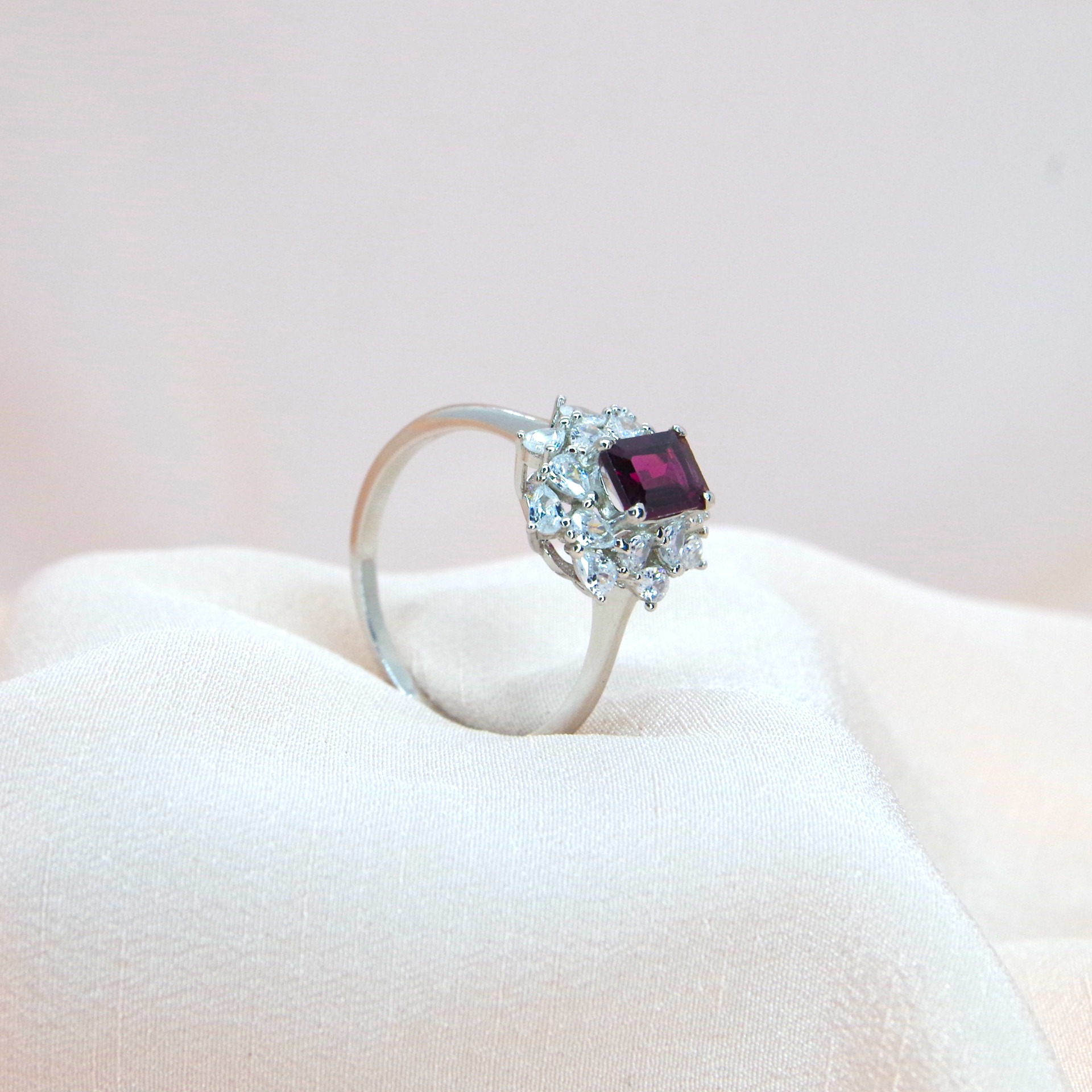 Zářivý stříbrný prsten s přírodním granátem a zirkony, pozlacený 14k bílým zlatem.