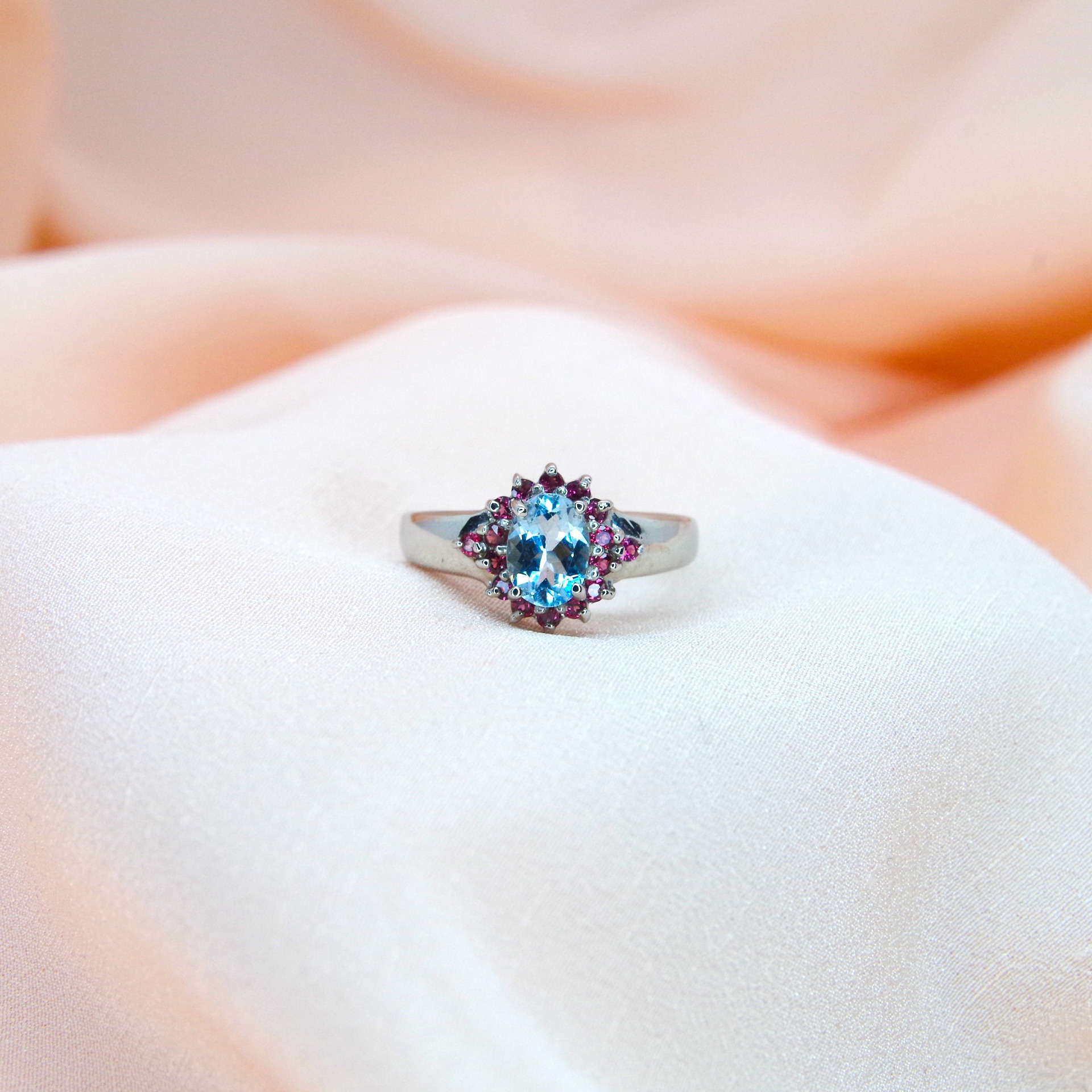 PŮVABNÝ PRSTEN S AKVAMARÍNEM A GRANÁTY